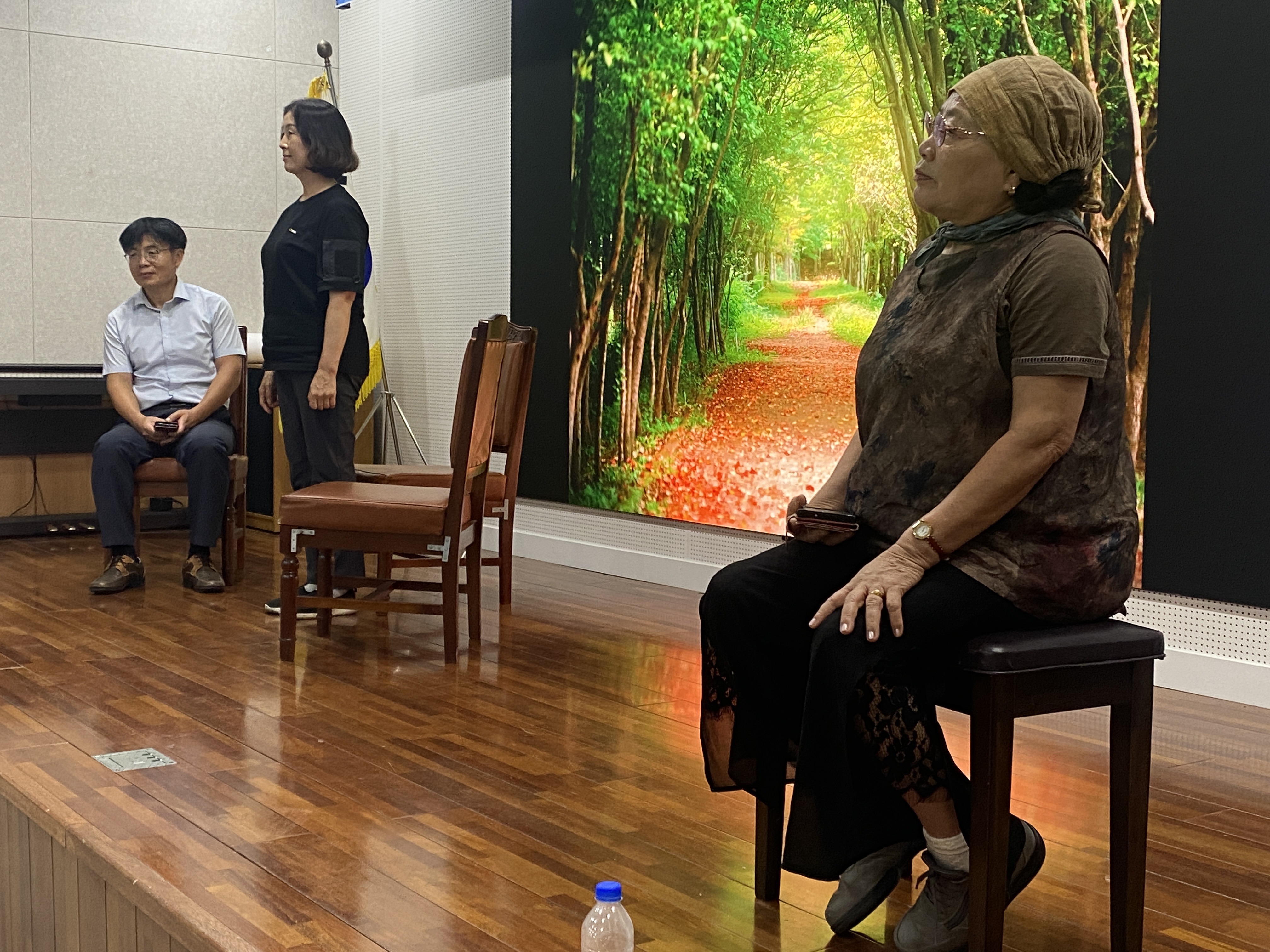 어릴 적/ 산골짝에 남자 아이들/ 학교 보내주고/ 여자들은 공부하면 남의 집에 간다고/ 보내주지 않았다/ 남동생 둘은 학교 가고/ 늦게 언니들은 서당에 갔다. 나는 소꼴 베러 다니고/ 조금 베면 아버지가 쫓아냈다/ 마을회관 한글공부/ 내 눈을 뜨게 하고/ 흐리게 보였던 간판이/ 환하게 보인다/ (시를 다 낭송하고 나서 감개무량한 듯 눈물을 훔치는 모습을 보인다.)