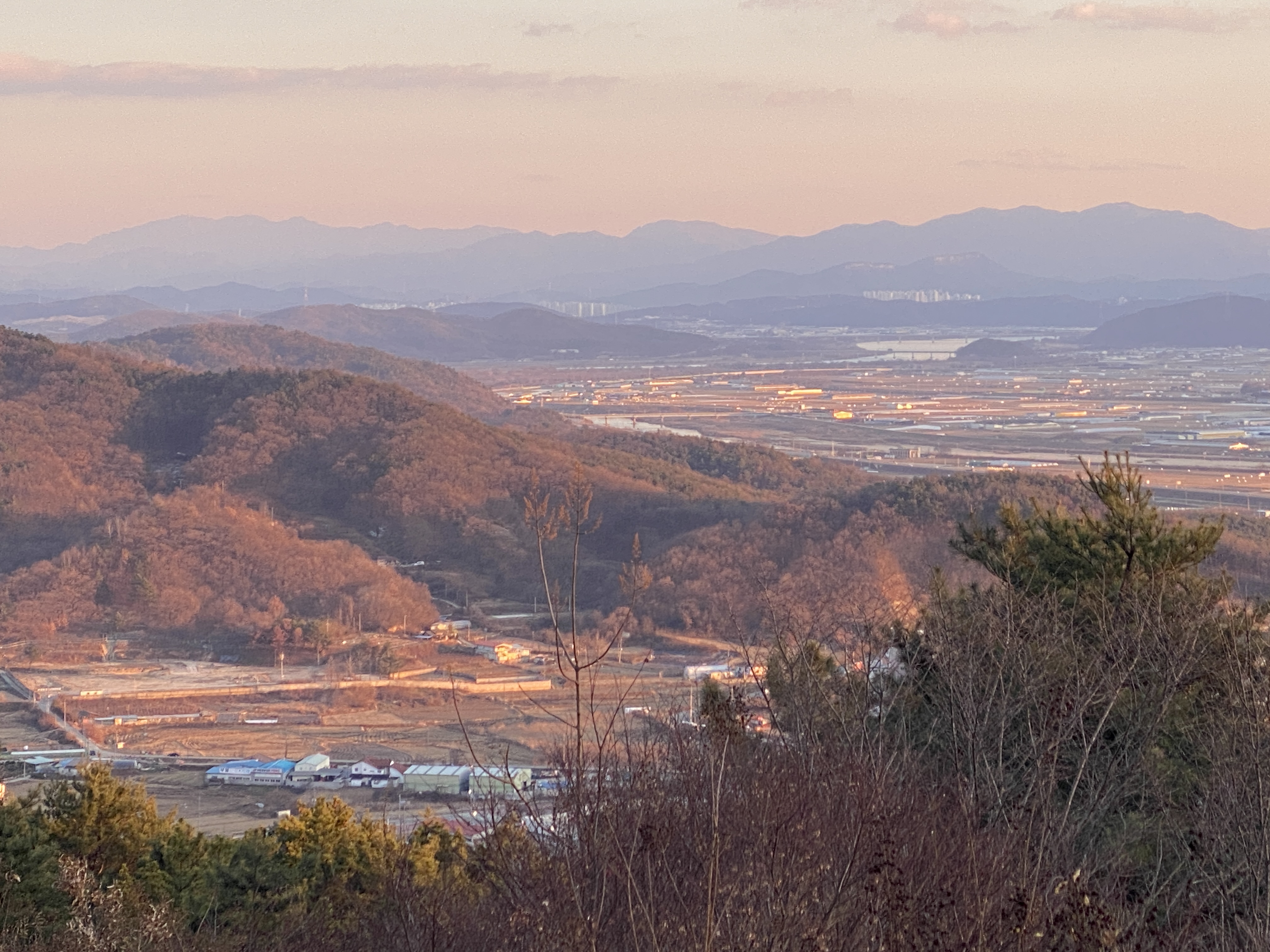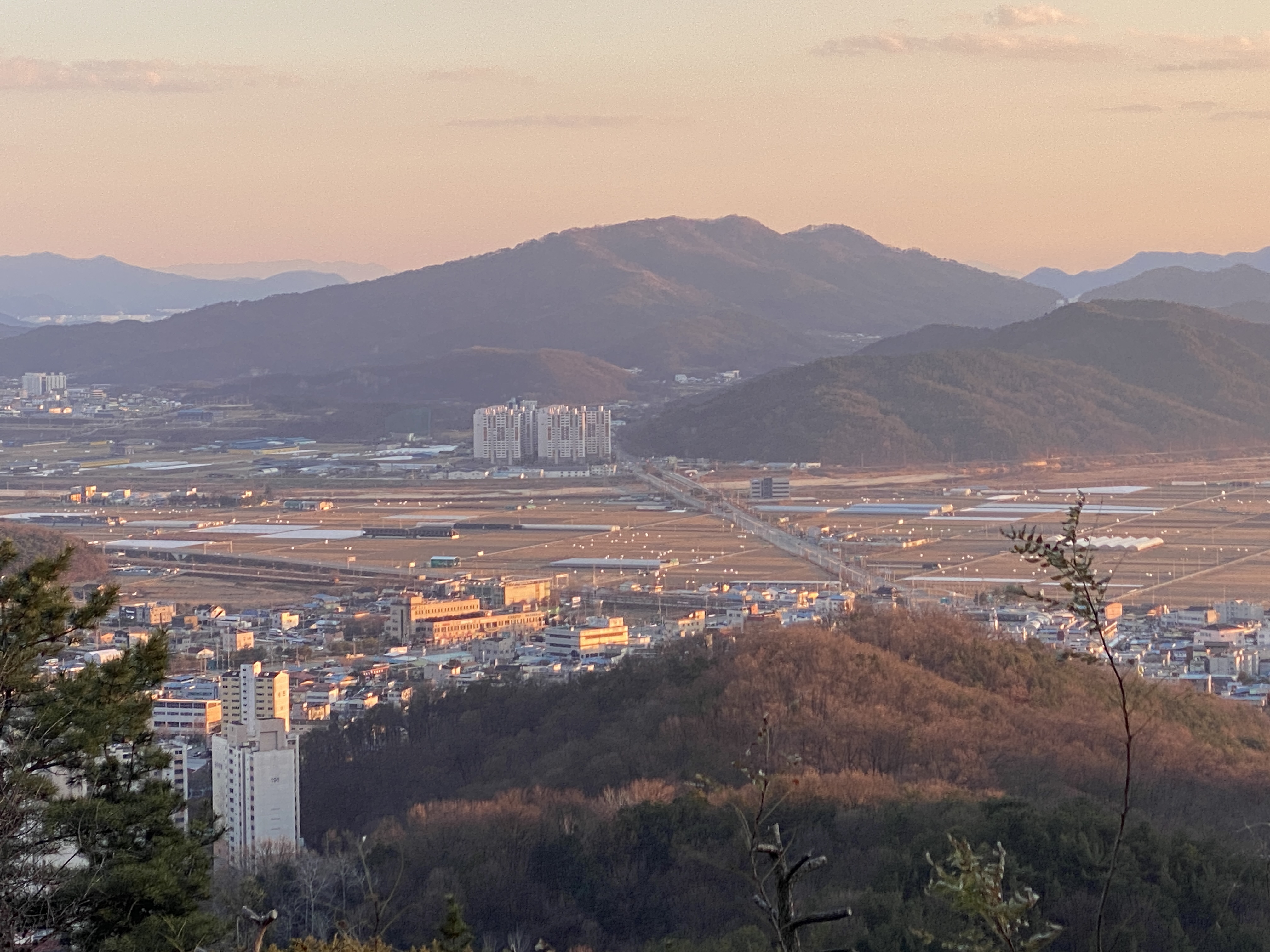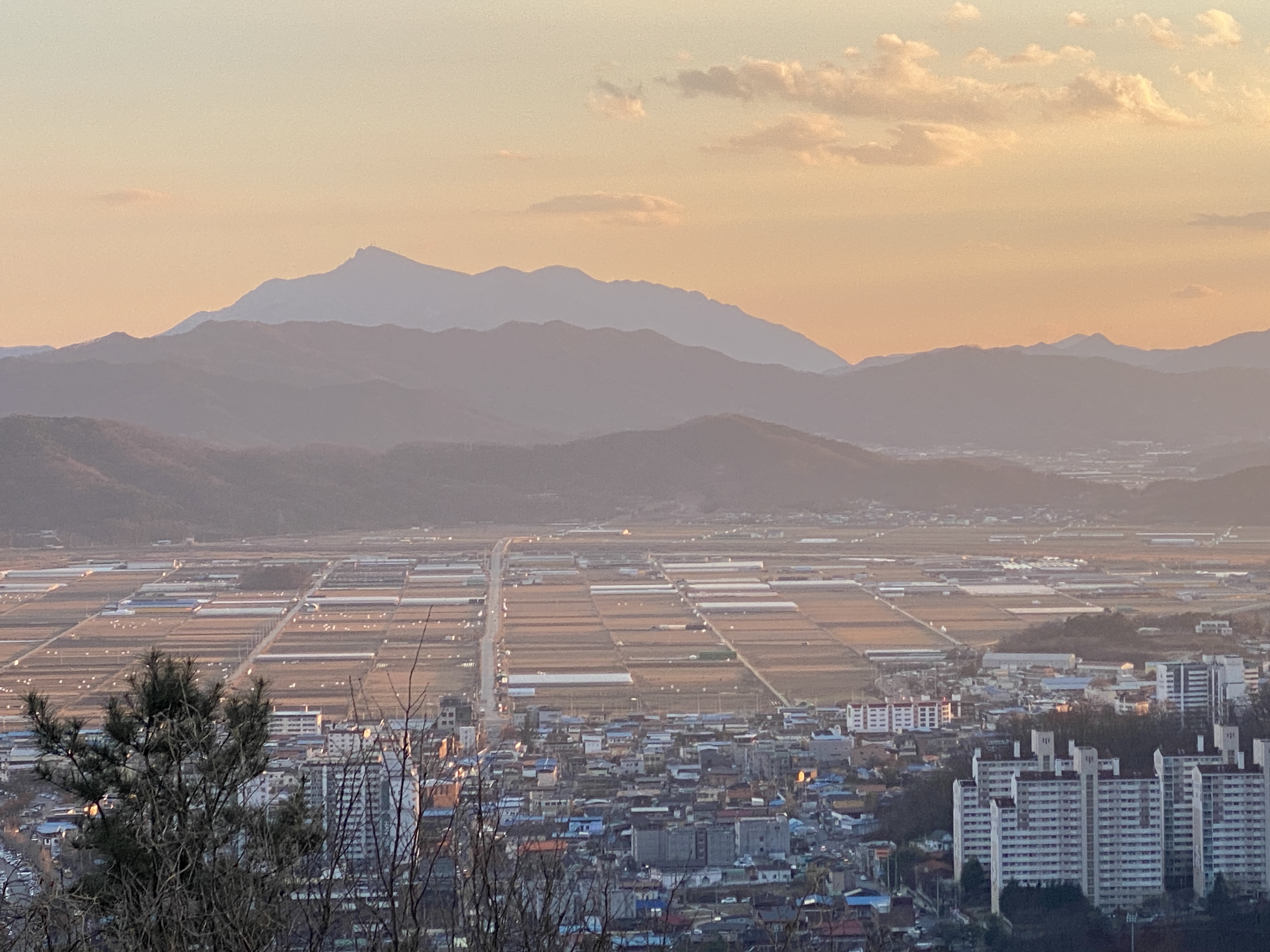 석양과 함께 붉게 물들어 가는 오후의 시간, 원근감이 느껴지는 산의 능선이 이채롭다. 제일 멀리 보이는 산이 바로 금오산(해발 976미터)이다.