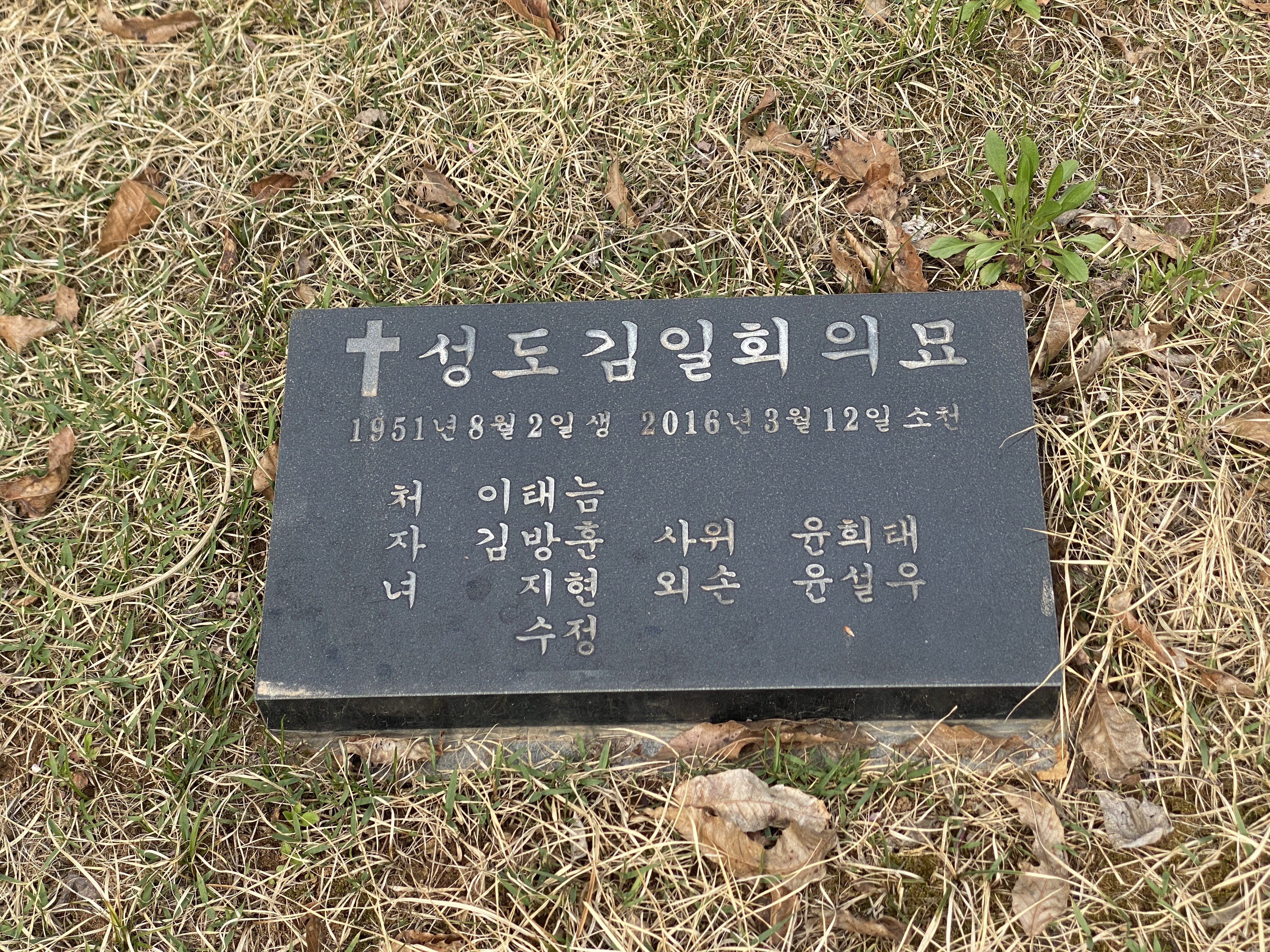 일회 형의 유골은 이 비 아래 묻혀 있다. 봉분 없이 고모님 무덤 앞에 유골만 묻고 평장으로 처리한 것이다.