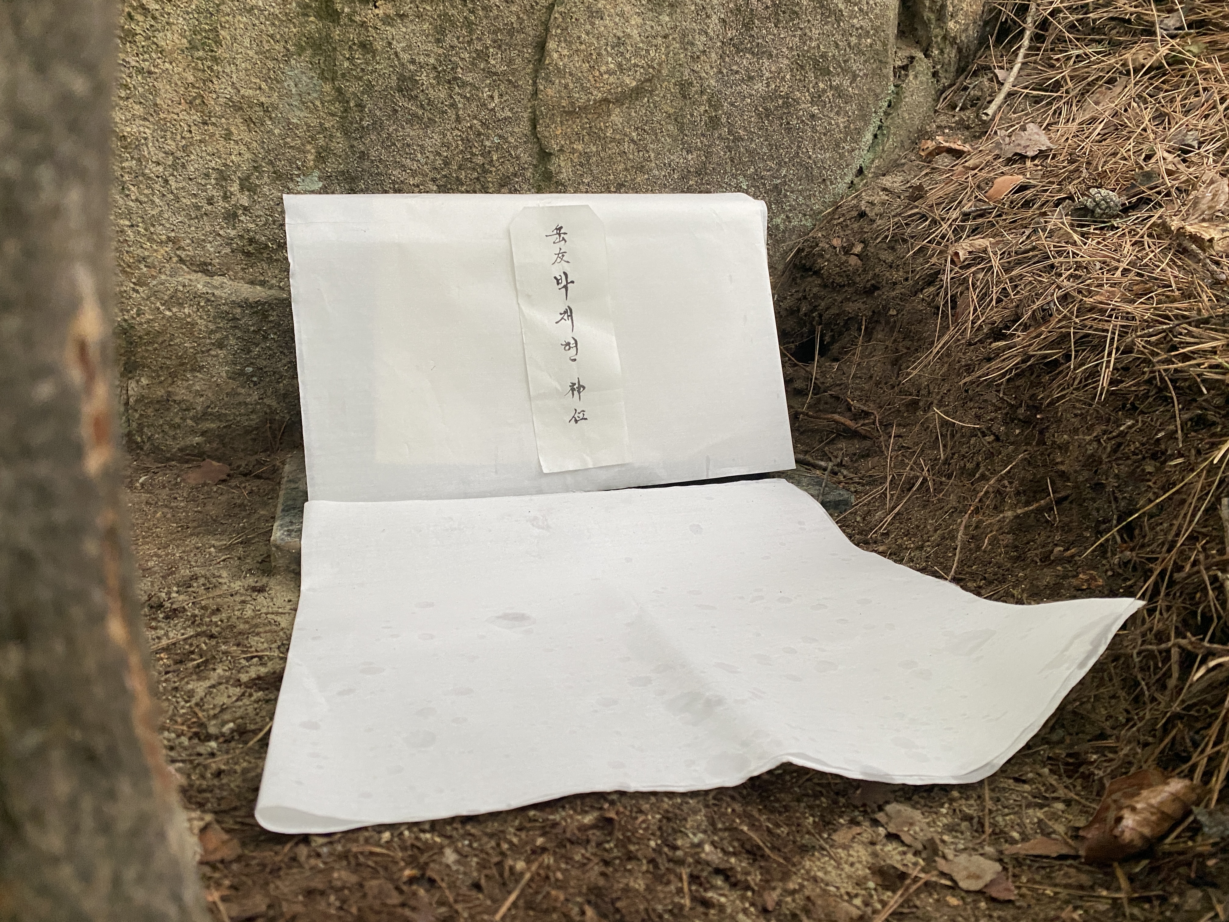 깨끗한 한지를 깔고 추모비에 지방('악우 박재현 신위'라고 쓴)을 붙여서 제단을 꾸몄다. 이 한지가 주는 느낌은 제를 올리는 분들의 순수와 깨끗함이라고 해도 좋다.