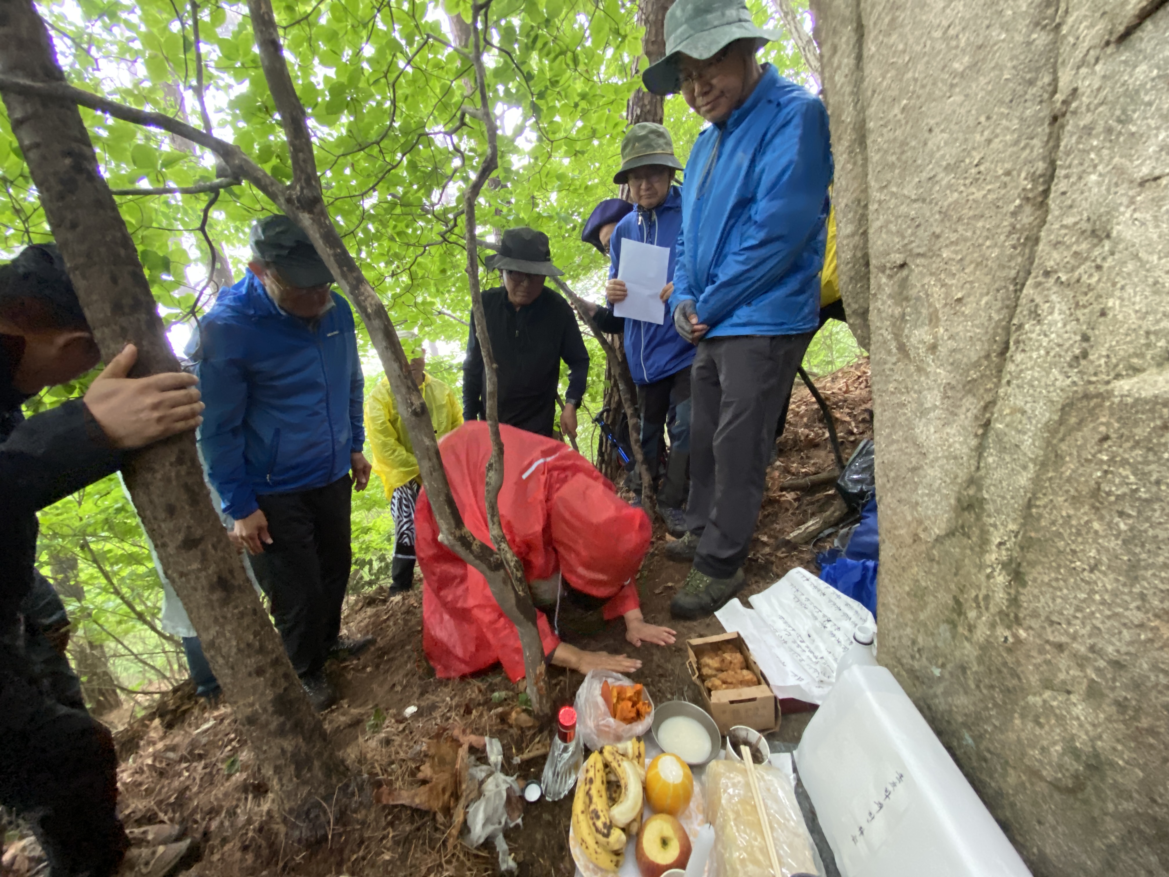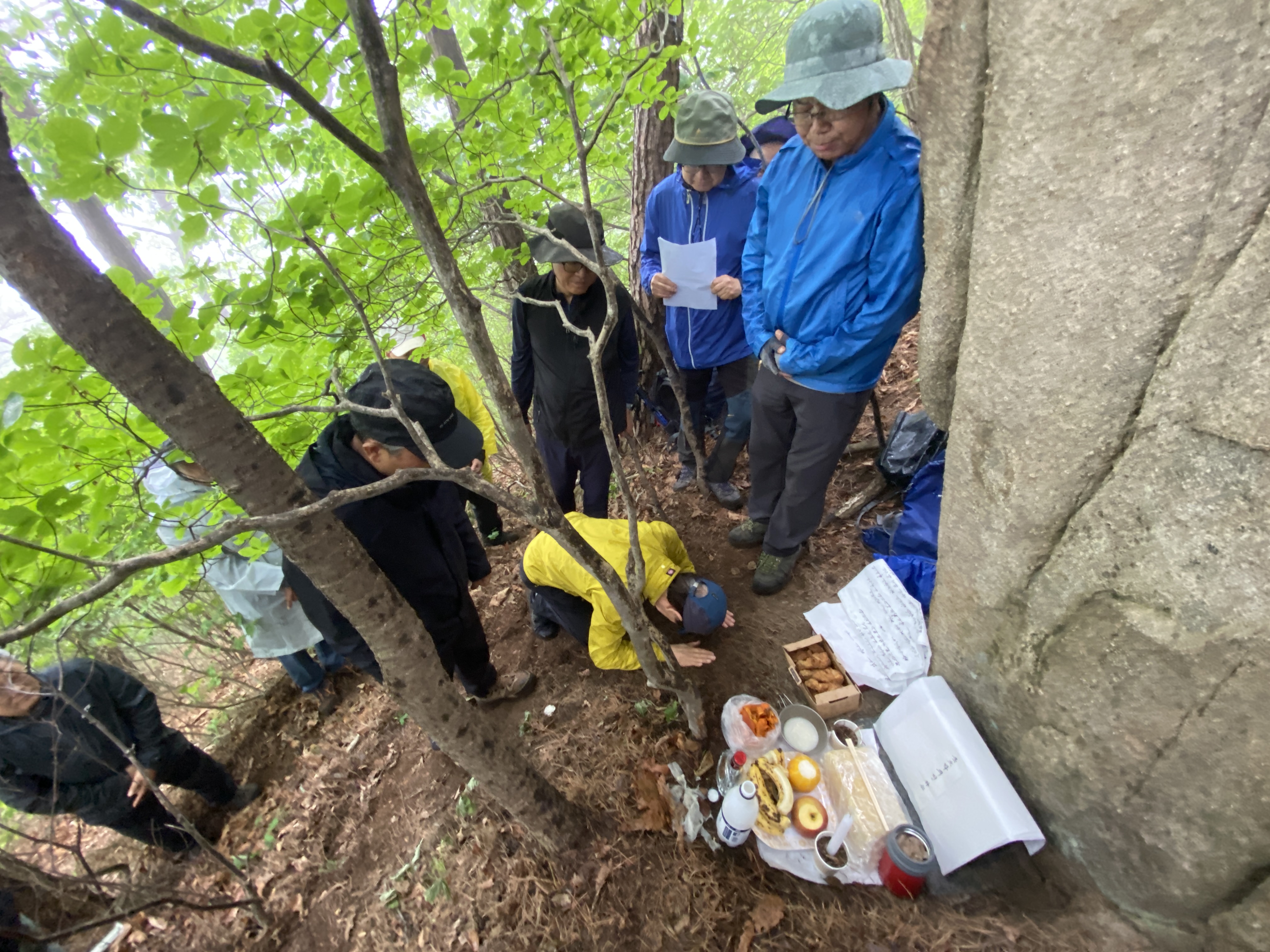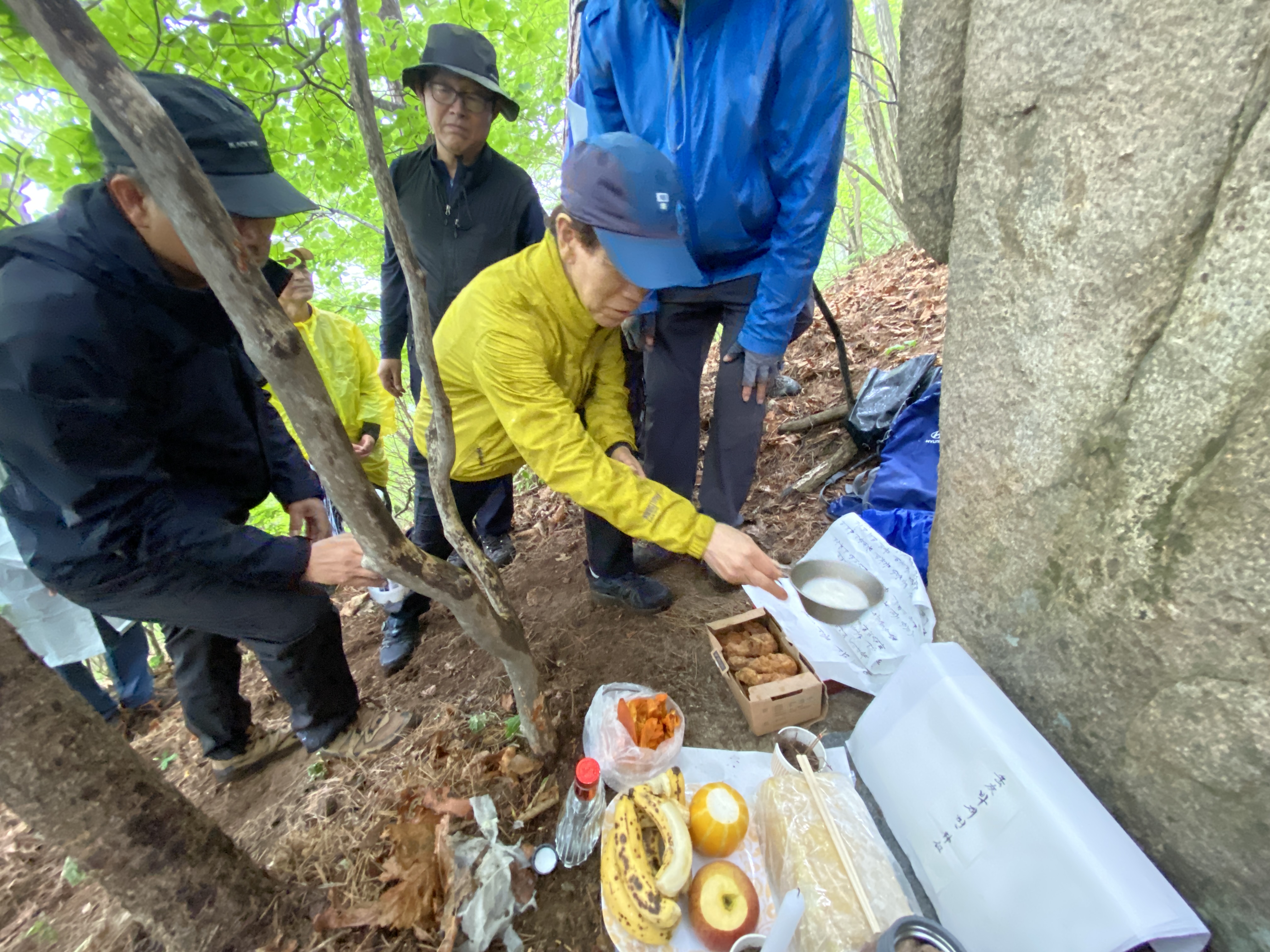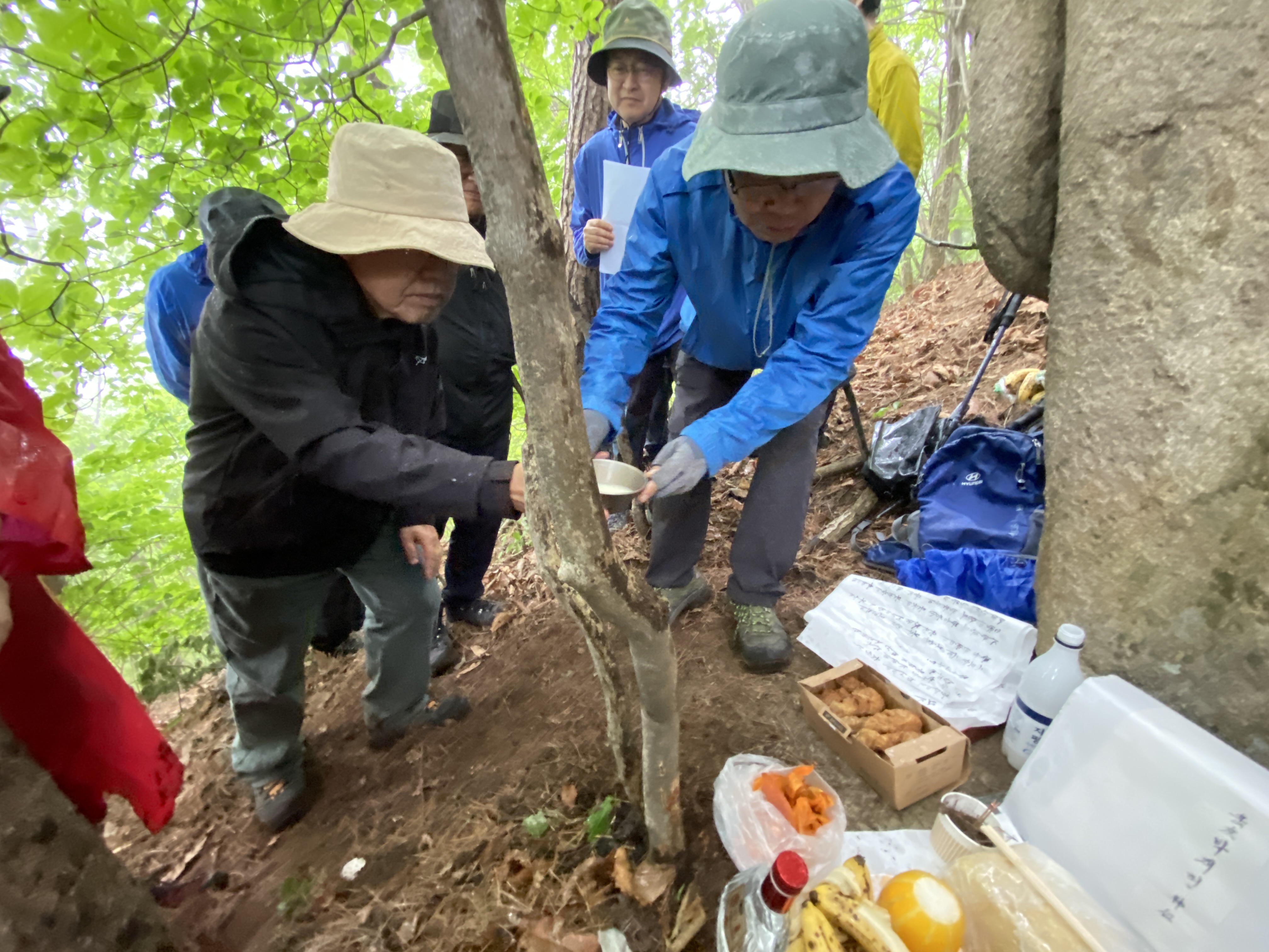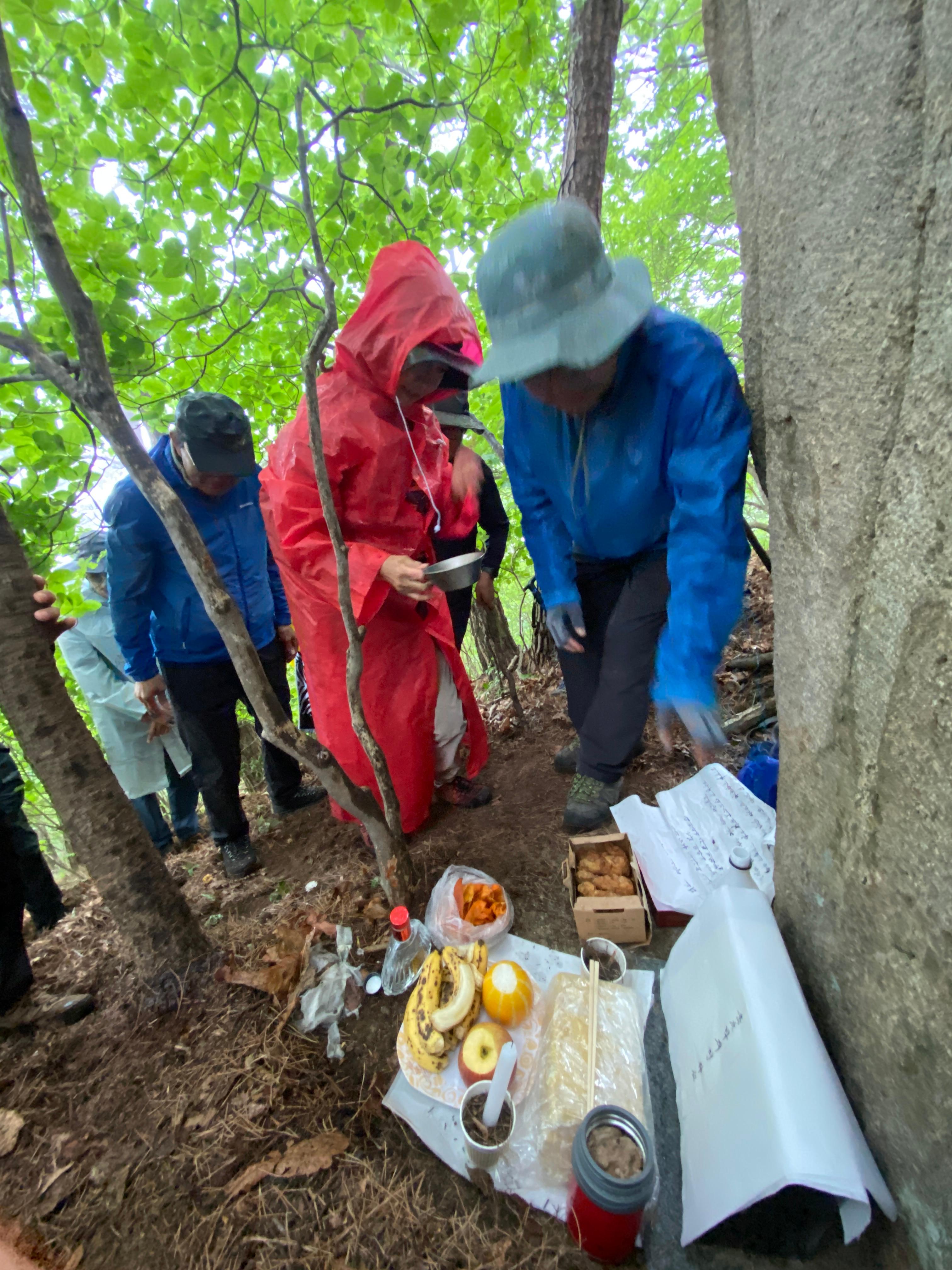 자, 이제 하산이다. 추모식을 마치고 팔공산 등정을 계속하려던 계획을 포기해야 했다. 노구를 이끌고 비 맞으며 등산하는 것은 일종의 객기일 수 있다는 판단 때문이다. A팀이 올랐던 가파른 길 대신에 B팀이 걸었던 짧은 길을 택하여 하산하면 문제가 없을 것이다. 30분 정도 걸어가서 한티휴게소에 세워둔 세 대의 차량에 분승해서 파계사 주차장으로 이동, 그 주변에서 음식을 나누는 것으로 결정했다.