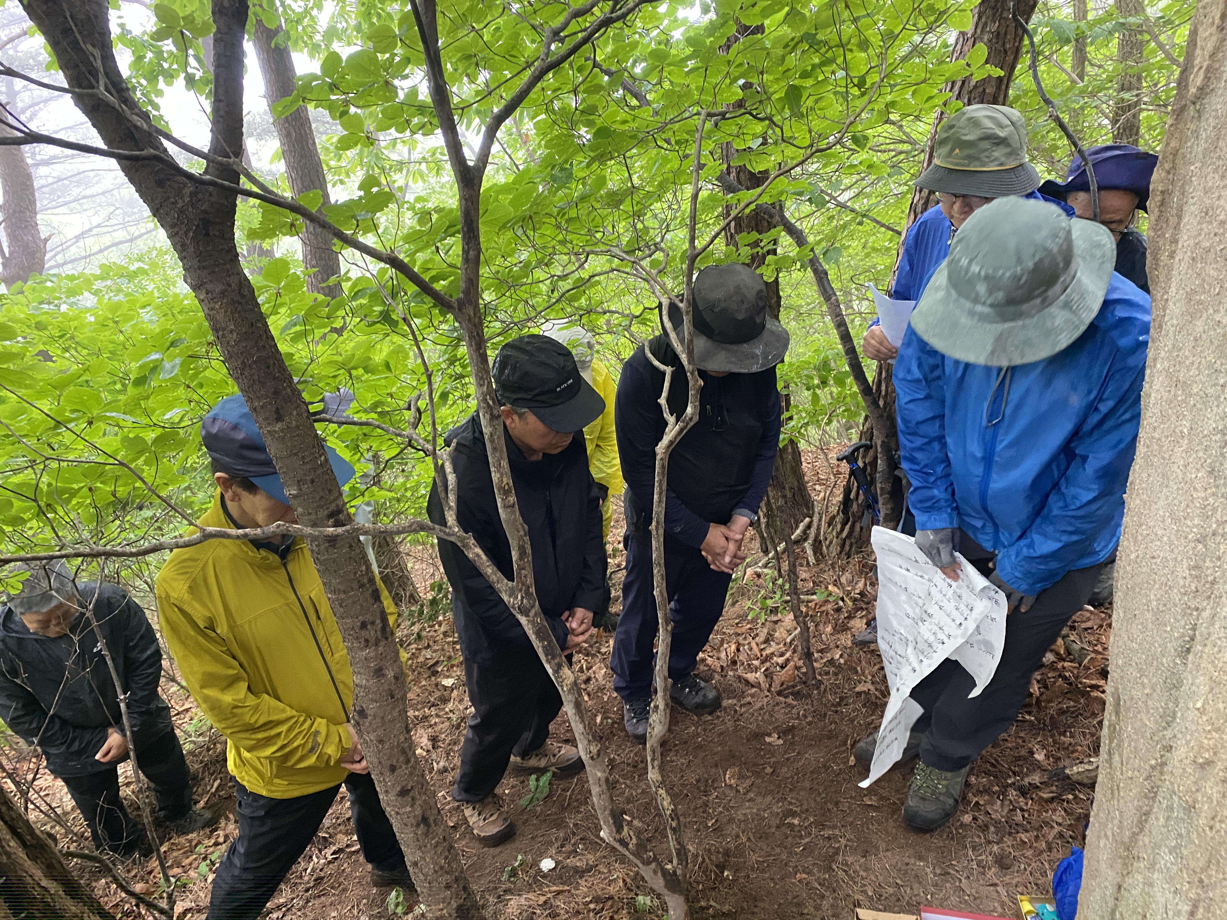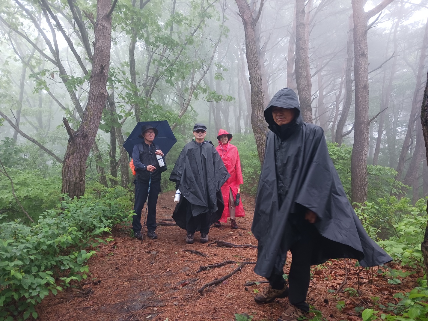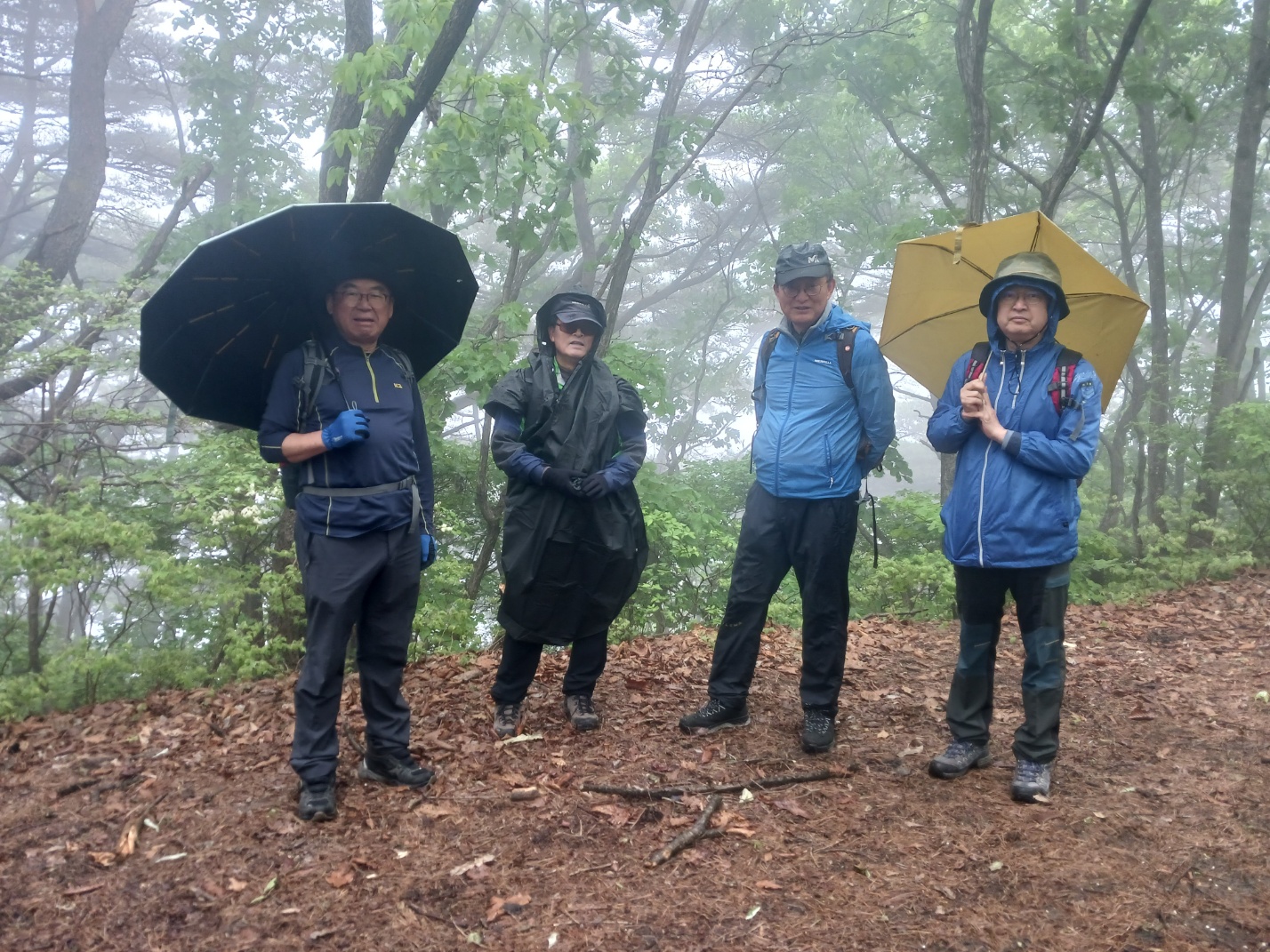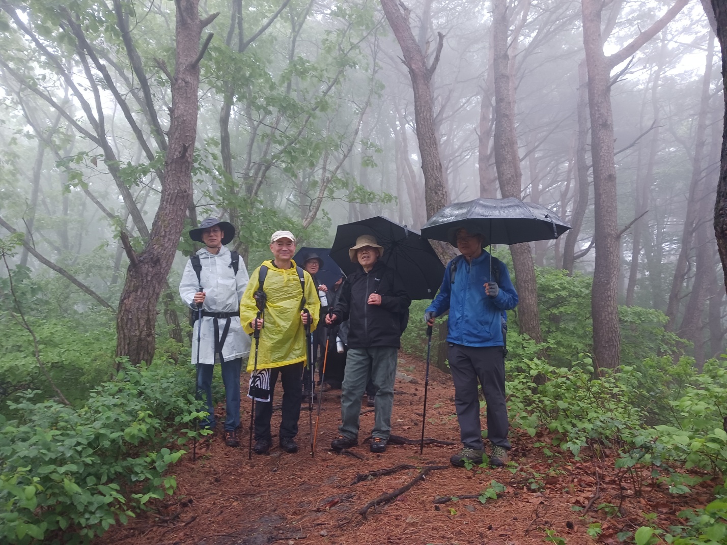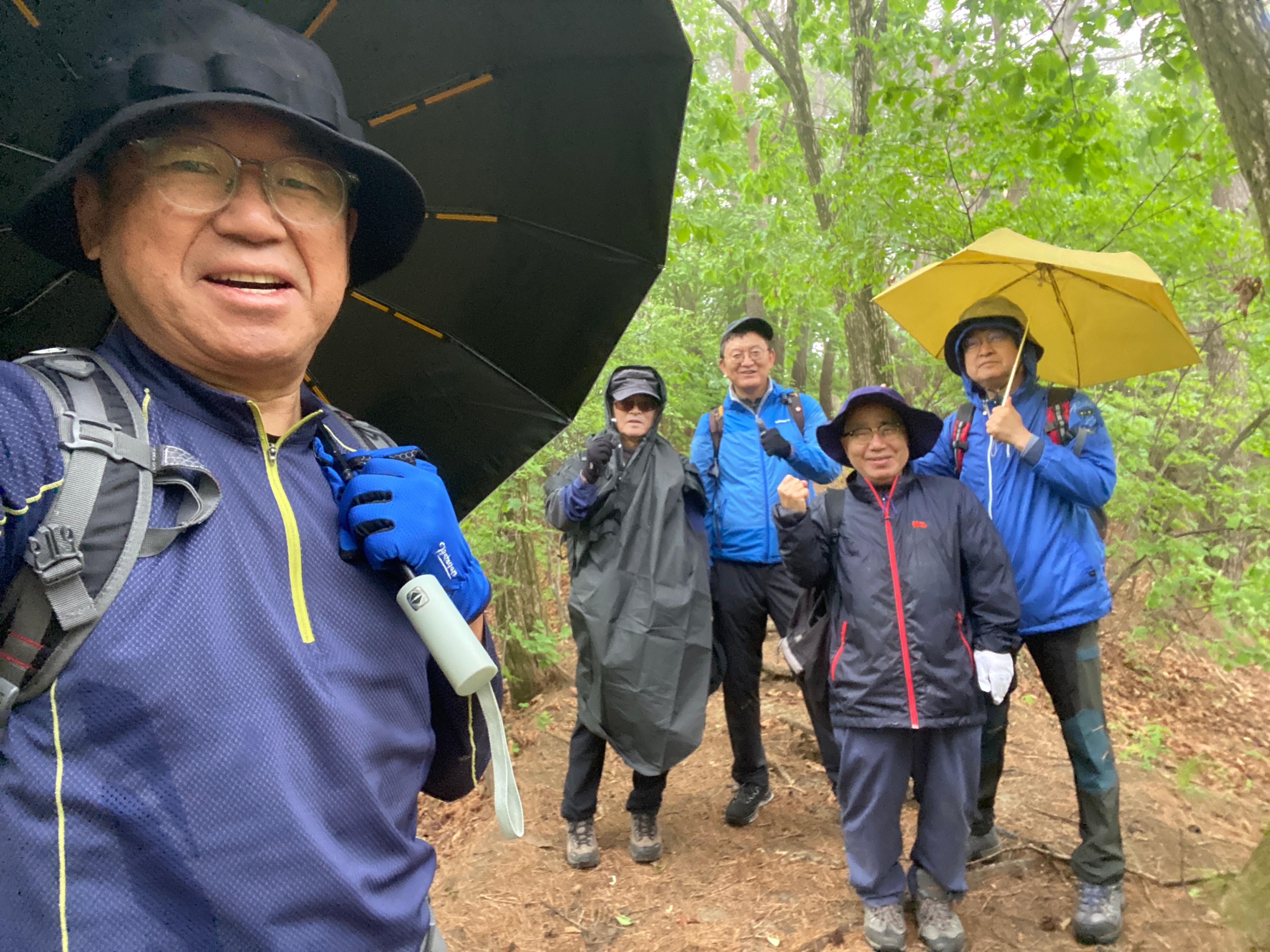 자, 이제 하산이다. 추모식을 마치고 팔공산 등정을 계속하려던 계획을 포기해야 했다. 노구를 이끌고 비 맞으며 등산하는 것은 일종의 객기일 수 있다는 판단 때문이다. A팀이 올랐던 가파른 길 대신에 B팀이 걸었던 짧은 길을 택하여 하산하면 문제가 없을 것이다. 30분 정도 걸어가서 한티휴게소에 세워둔 세 대의 차량에 분승해서 파계사 주차장으로 이동, 그 주변에서 음식을 나누는 것으로 결정했다.