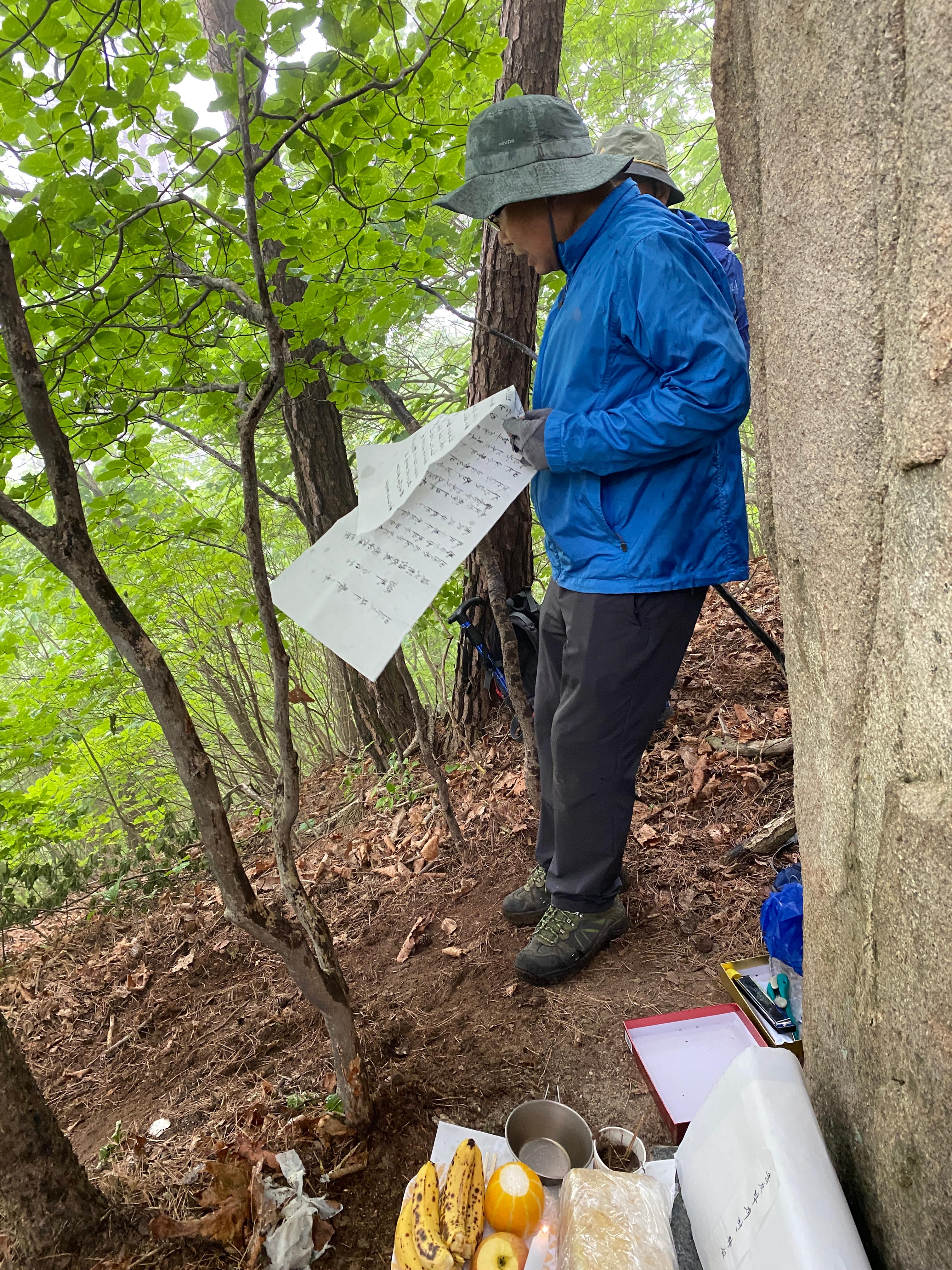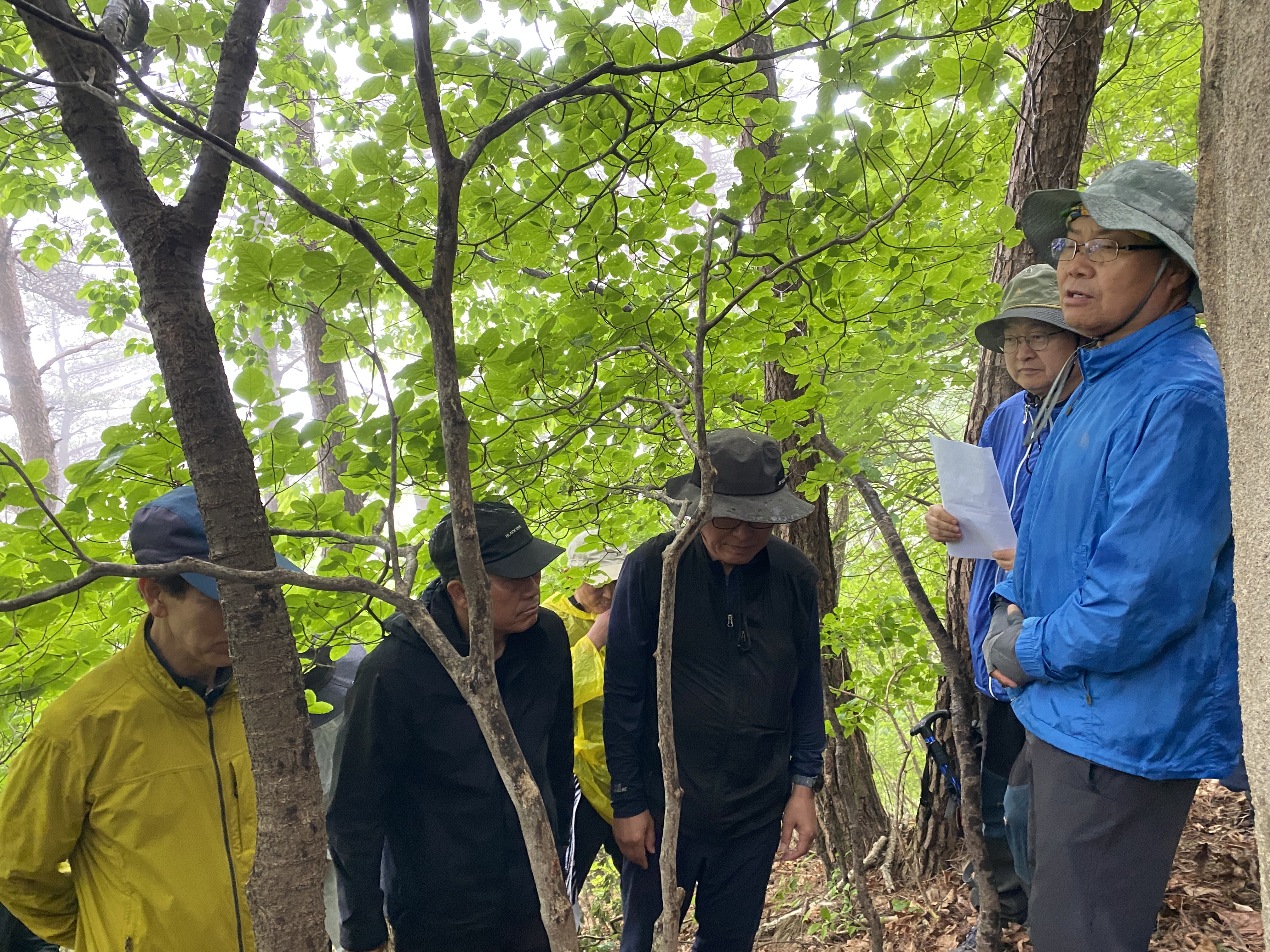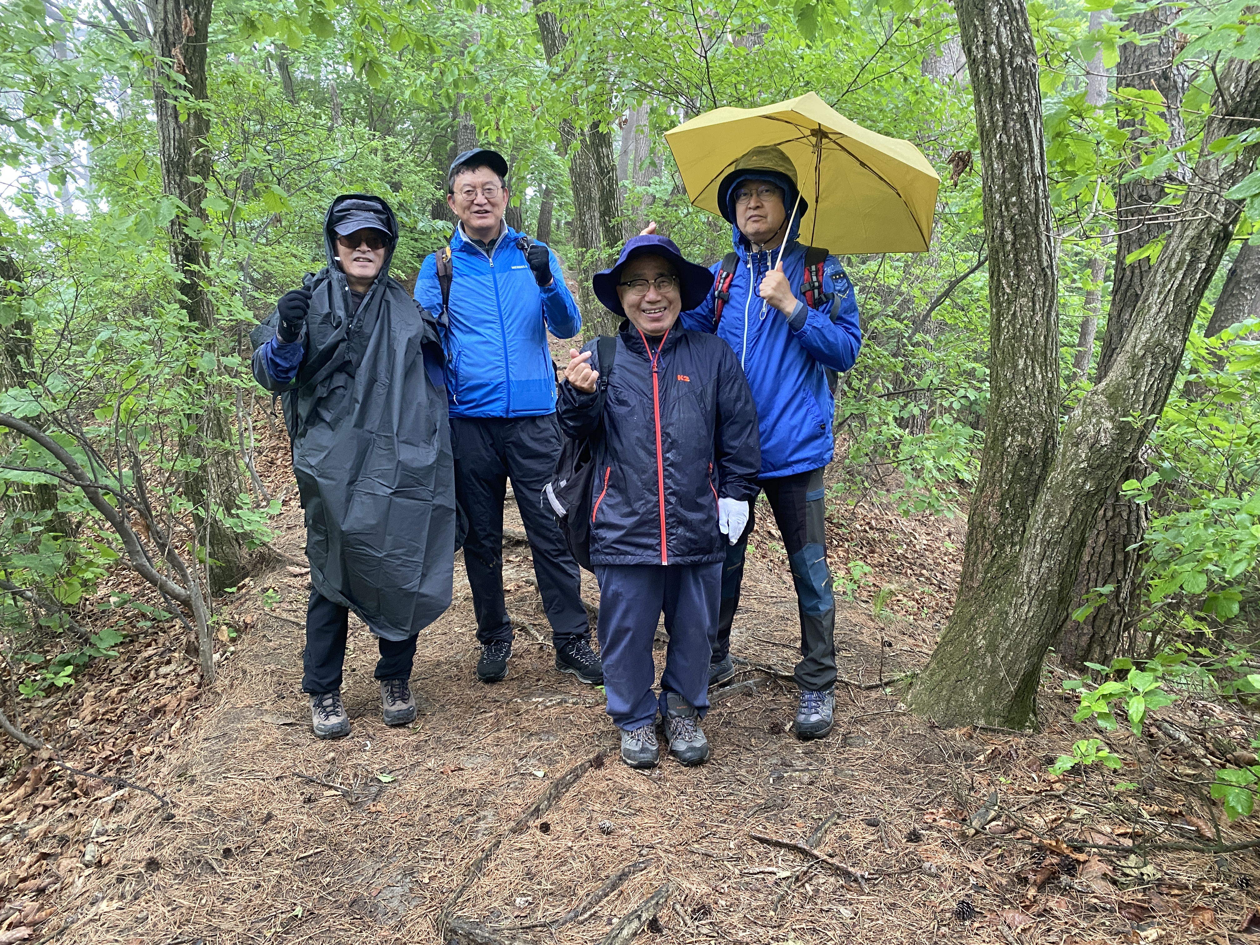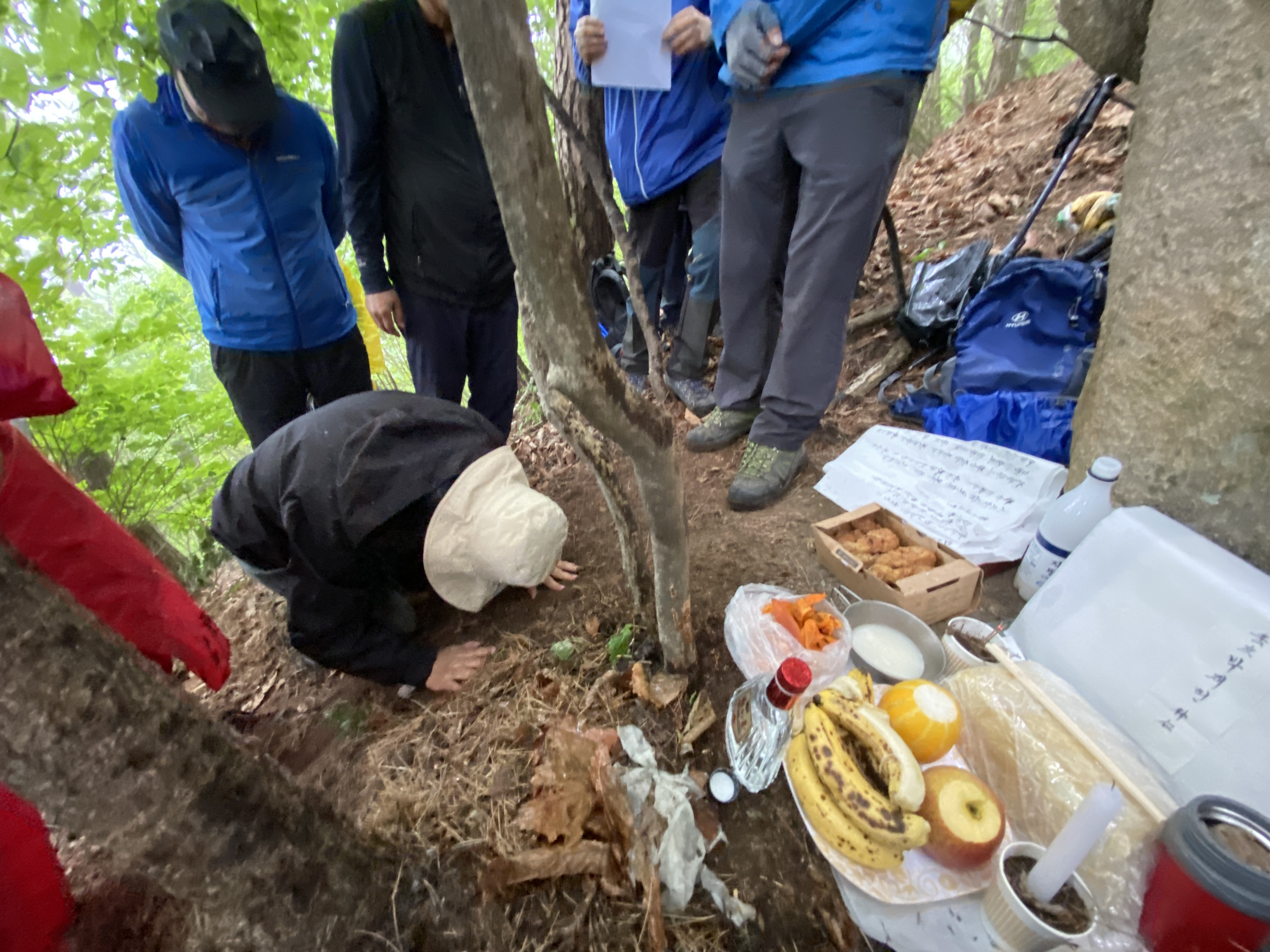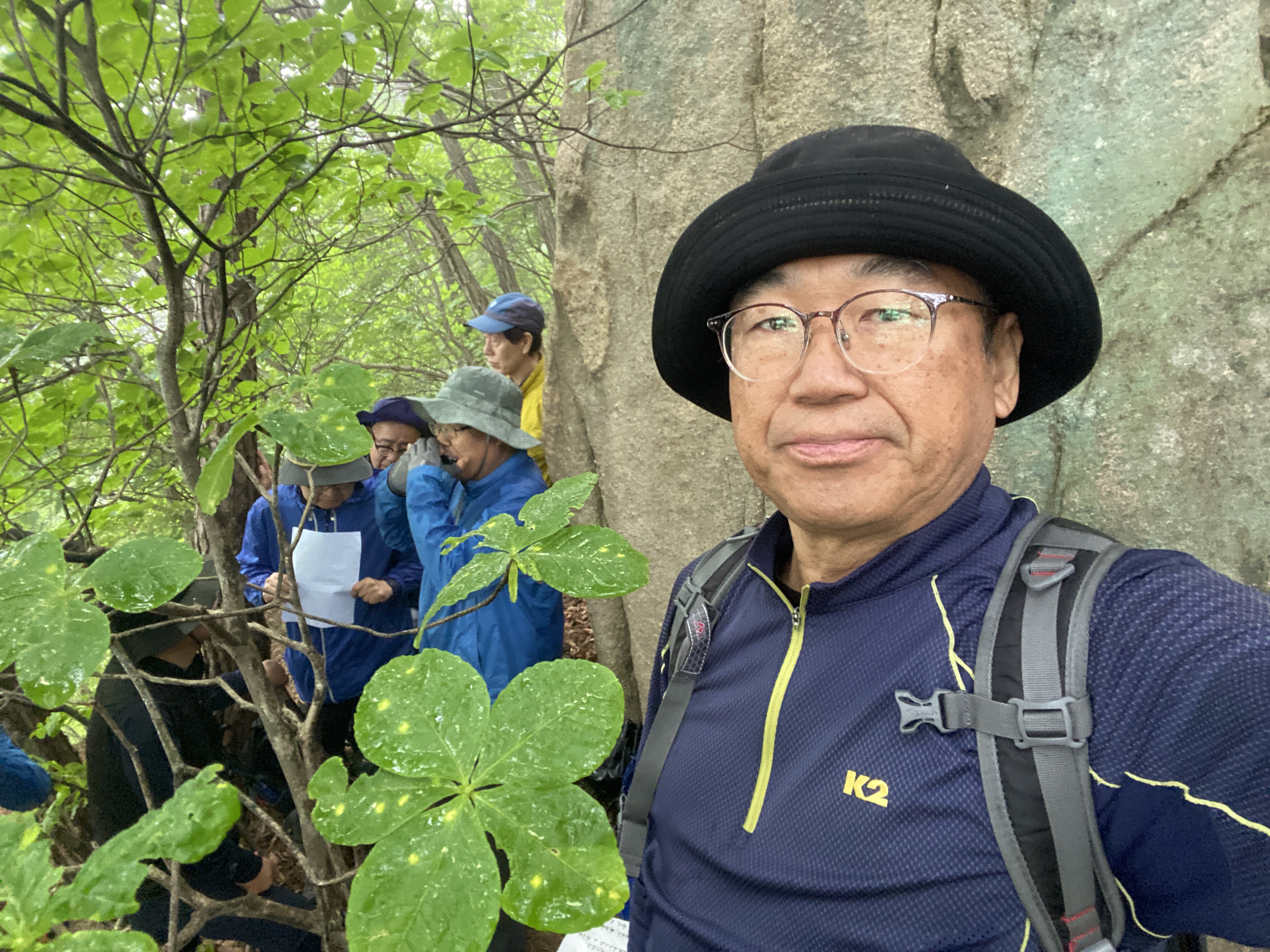 자, 이제 하산이다. 추모식을 마치고 팔공산 등정을 계속하려던 계획을 포기해야 했다. 노구를 이끌고 비 맞으며 등산하는 것은 일종의 객기일 수 있다는 판단 때문이다. A팀이 올랐던 가파른 길 대신에 B팀이 걸었던 짧은 길을 택하여 하산하면 문제가 없을 것이다. 30분 정도 걸어가서 한티휴게소에 세워둔 세 대의 차량에 분승해서 파계사 주차장으로 이동, 그 주변에서 음식을 나누는 것으로 결정했다.