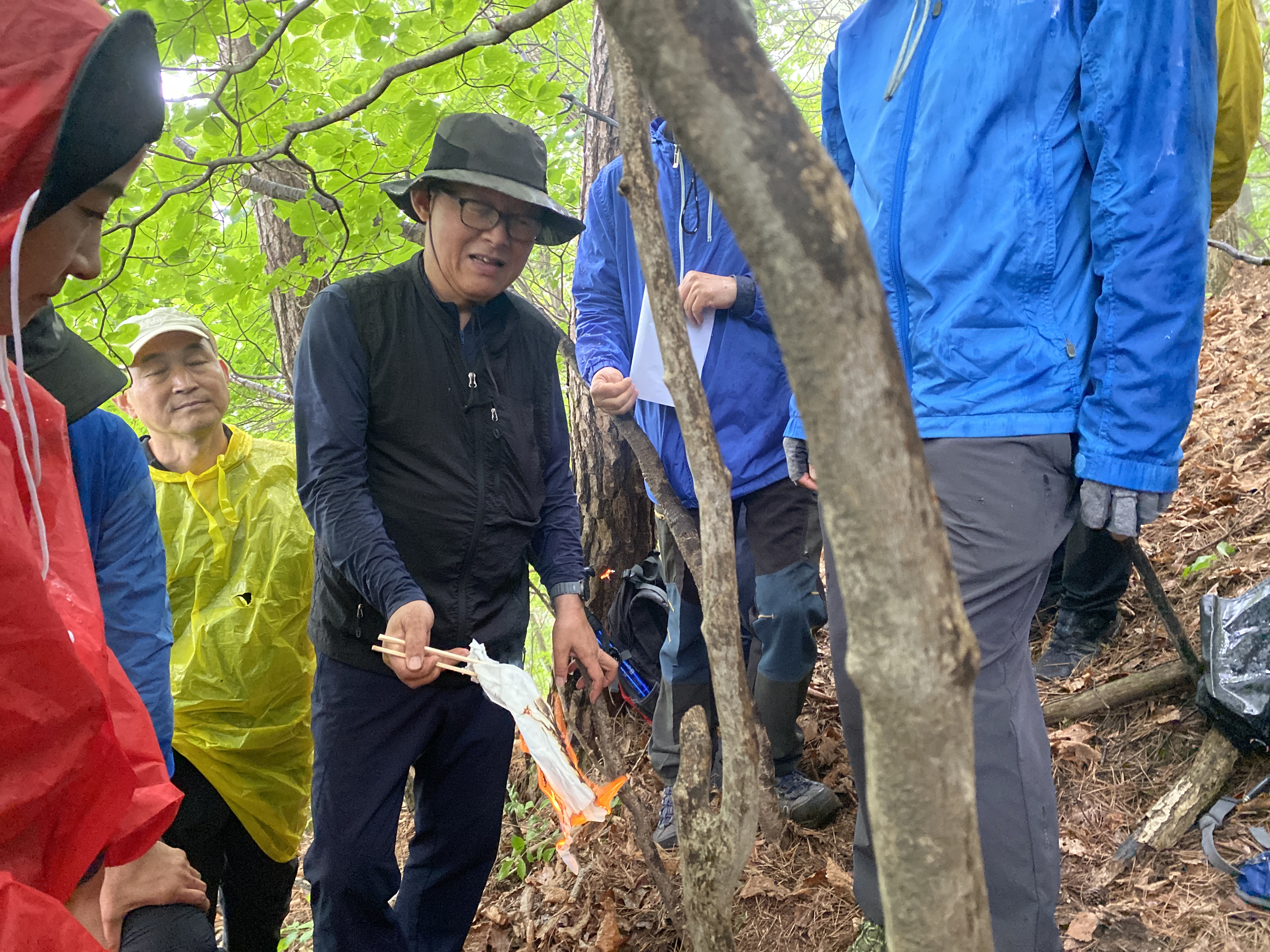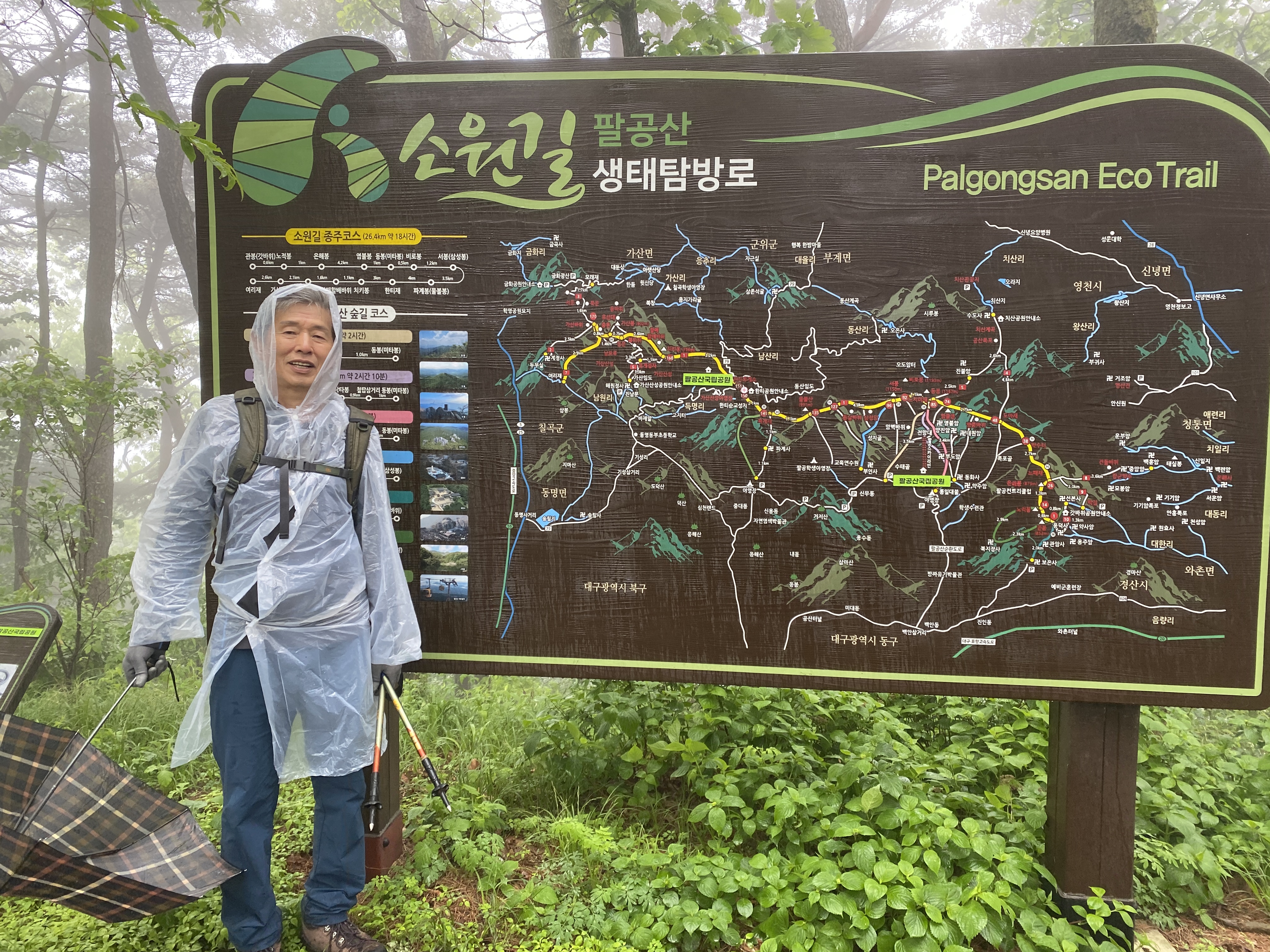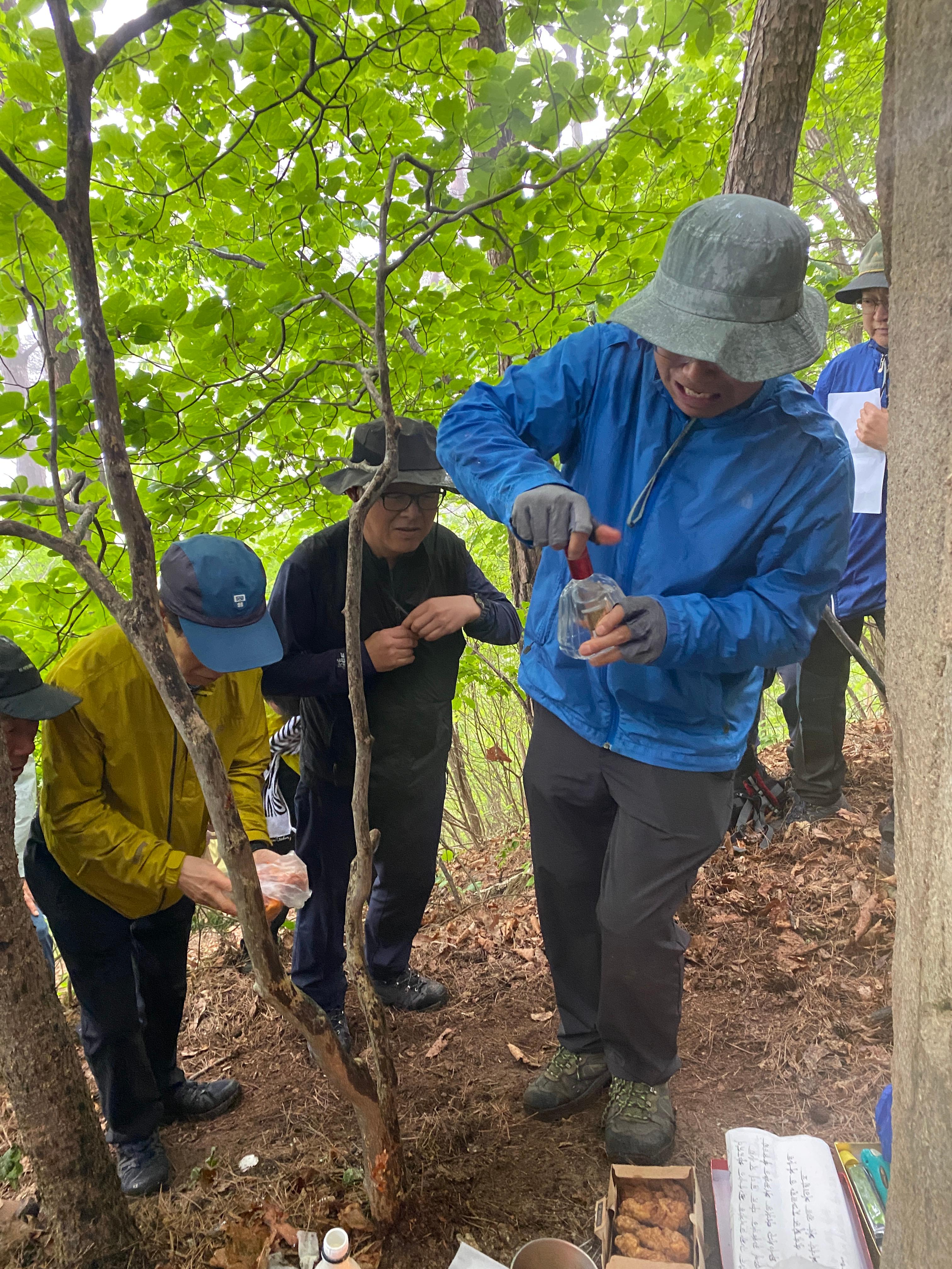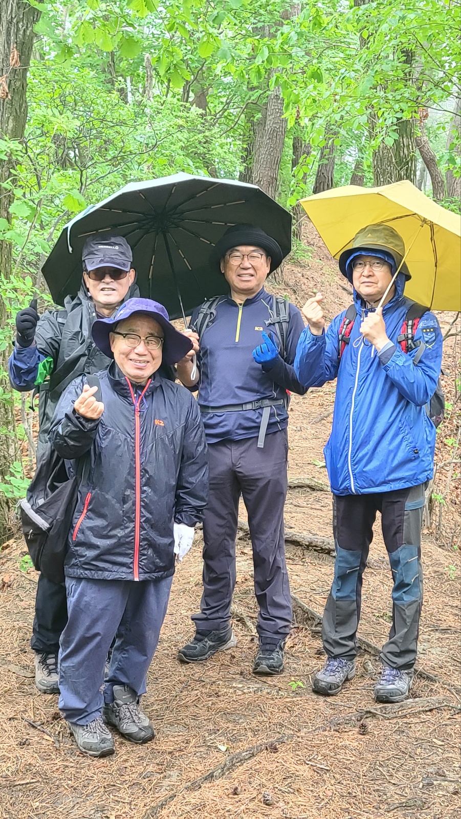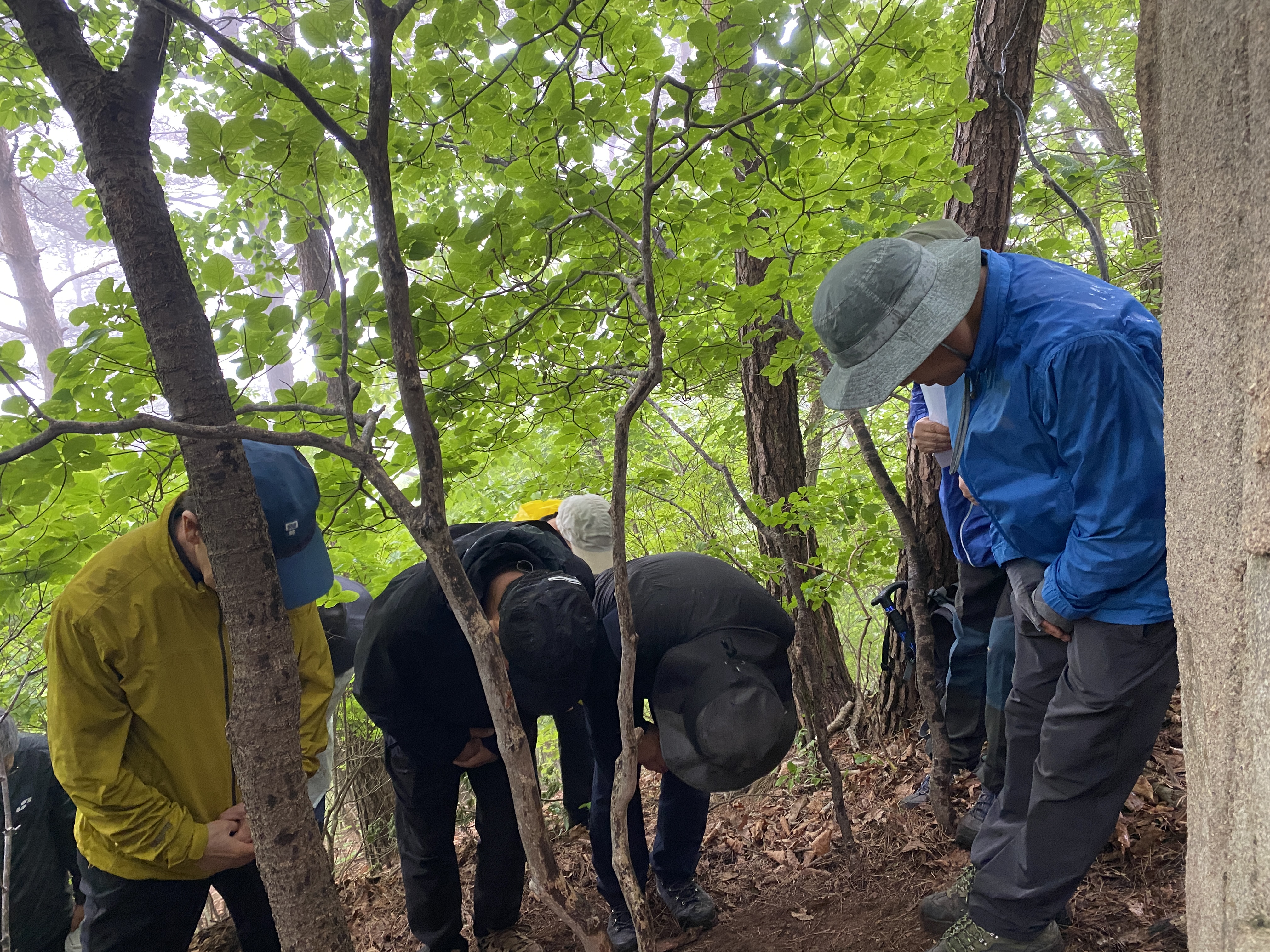 자, 이제 하산이다. 추모식을 마치고 팔공산 등정을 계속하려던 계획을 포기해야 했다. 노구를 이끌고 비 맞으며 등산하는 것은 일종의 객기일 수 있다는 판단 때문이다. A팀이 올랐던 가파른 길 대신에 B팀이 걸었던 짧은 길을 택하여 하산하면 문제가 없을 것이다. 30분 정도 걸어가서 한티휴게소에 세워둔 세 대의 차량에 분승해서 파계사 주차장으로 이동, 그 주변에서 음식을 나누는 것으로 결정했다.