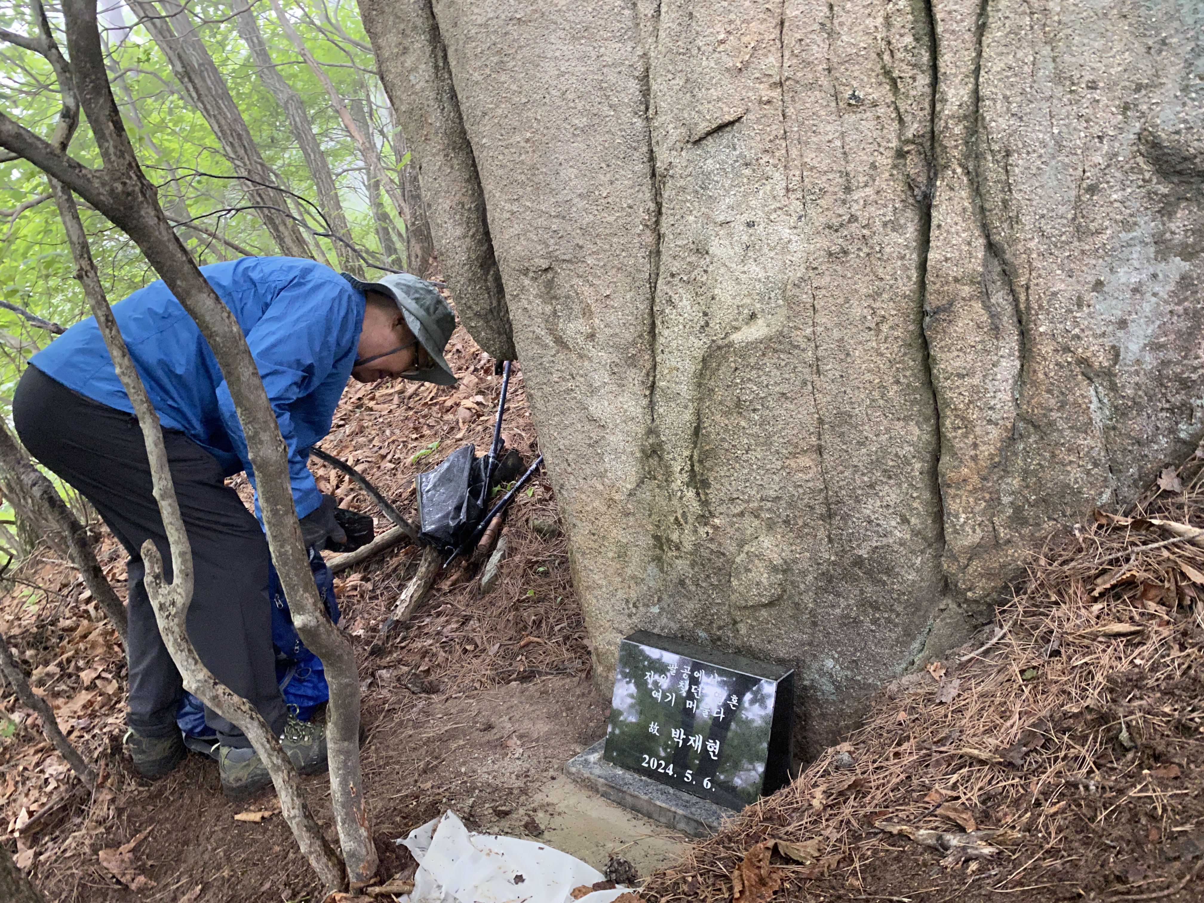 아침부터 날이 흐리더니 급기야 비가 내렸다. 5월말인데도 오늘 하루의 최고 기온은 16도밖에 되지 않아 쌀쌀하게 느껴지는 날씨였다. 고 박재현 변호사 추모비를 팔공산 능선 모처에 세우기로 한 날인데 날씨만큼은 아쉬움으로 남는다.