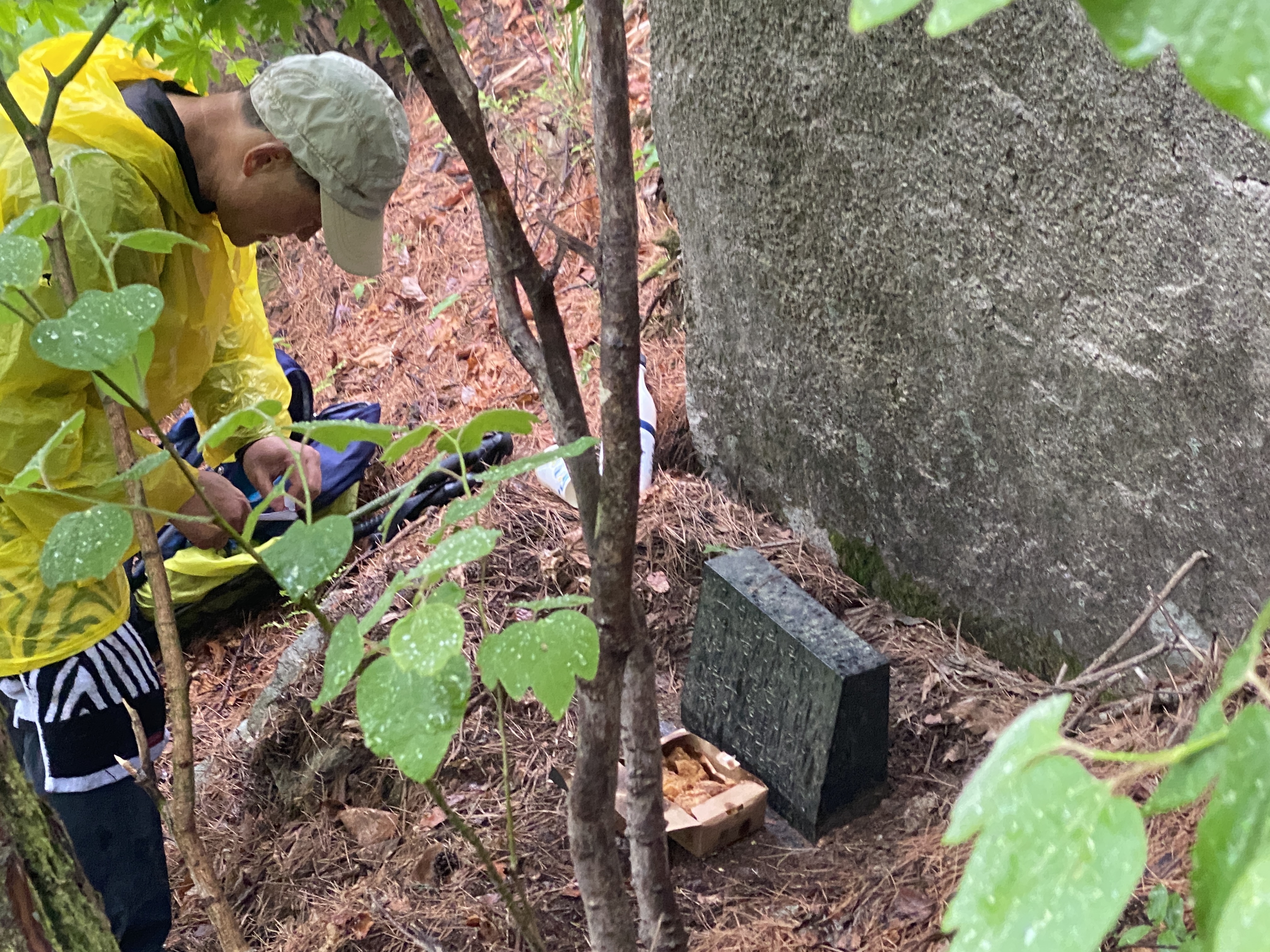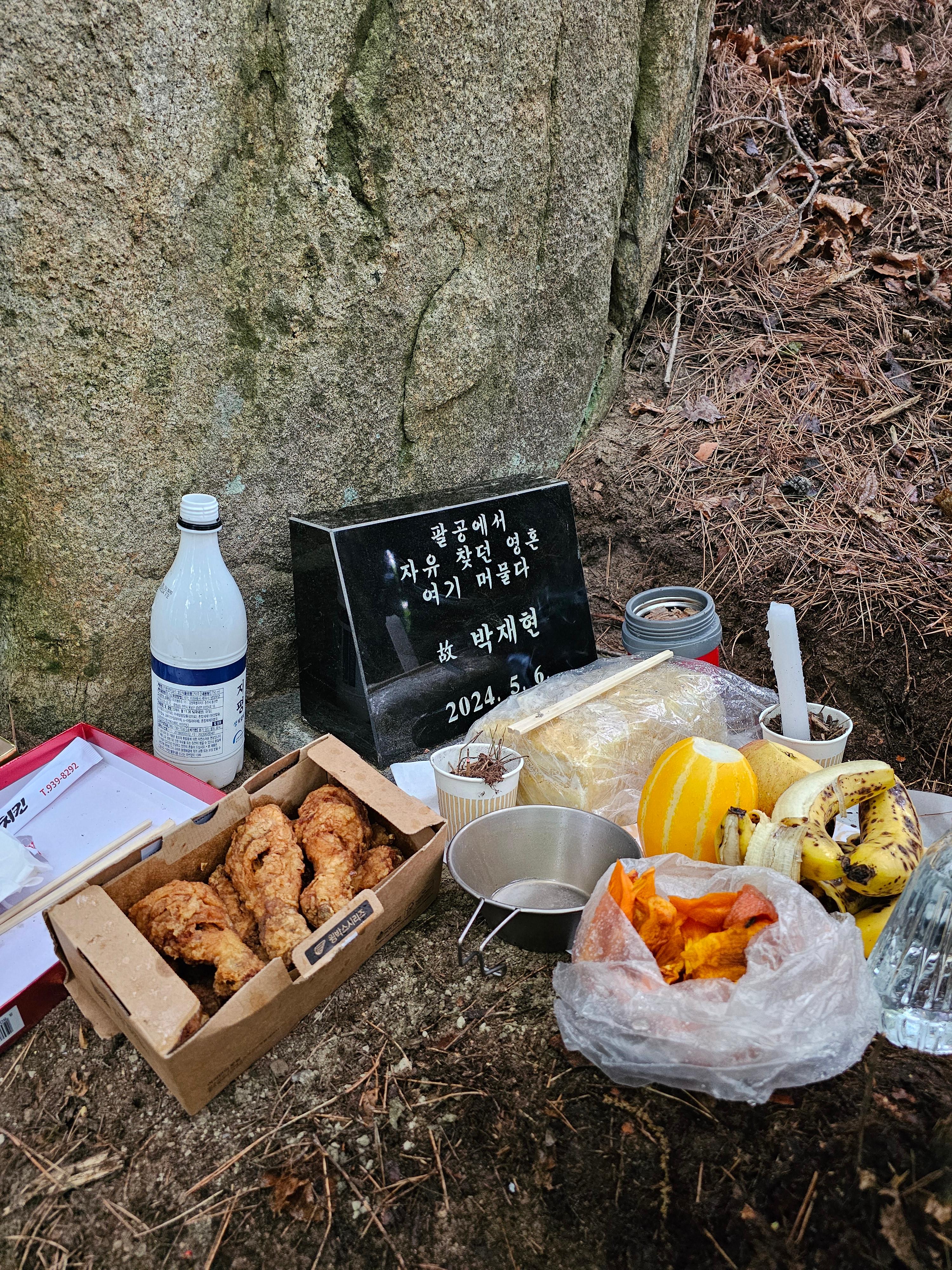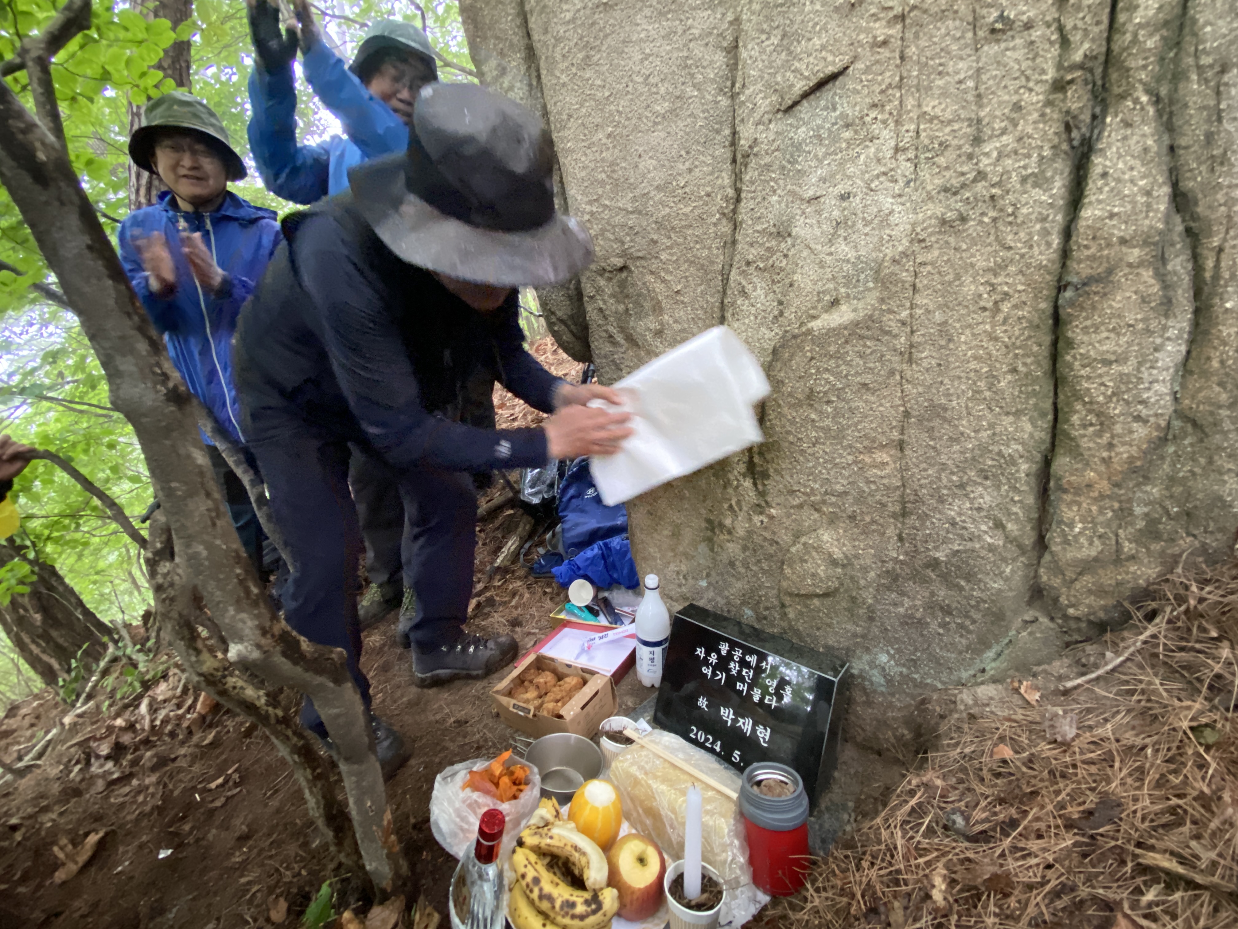 생전에 팔공산 암벽타기를 즐겼고 그것을 즐기다가 하늘로 올라간 고인, 1년이 지난 어느 비 오는 날, 그를 추모하는 친구들이 모여서 팔공산 능선에서 조금 흘러내린 이 바위 아래, 소박한 추모비 세우는 장면을 하늘에서 내려다보고 있을까?