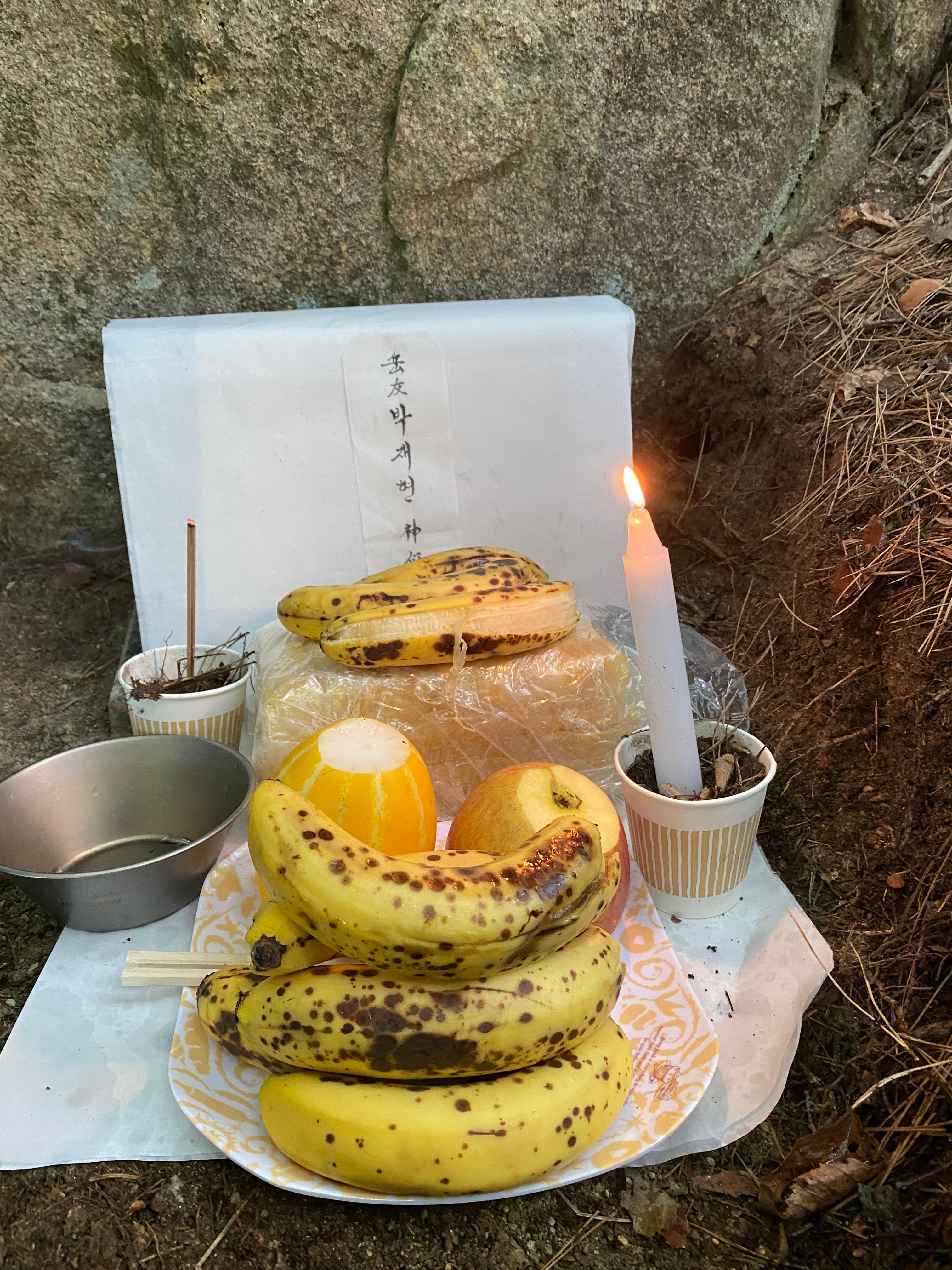 고인과 함께하고 싶은 마음으로 조촐한 음식(떡, 바나나, 치킨, 술 등)을 제단에 차렸다. 고인의 영혼을 불러내야 하리라.