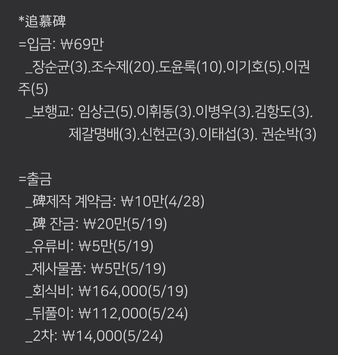 오늘의 추모비 건립 행사를 끝내면서 산대장 휘동이는 카톡에 위와 같이 입출금 내역을 공개하면서 회계 정리를 했고, 참여해 준 모든 친구들에게 감사의 마음을 전했음을 밝혀둔다.