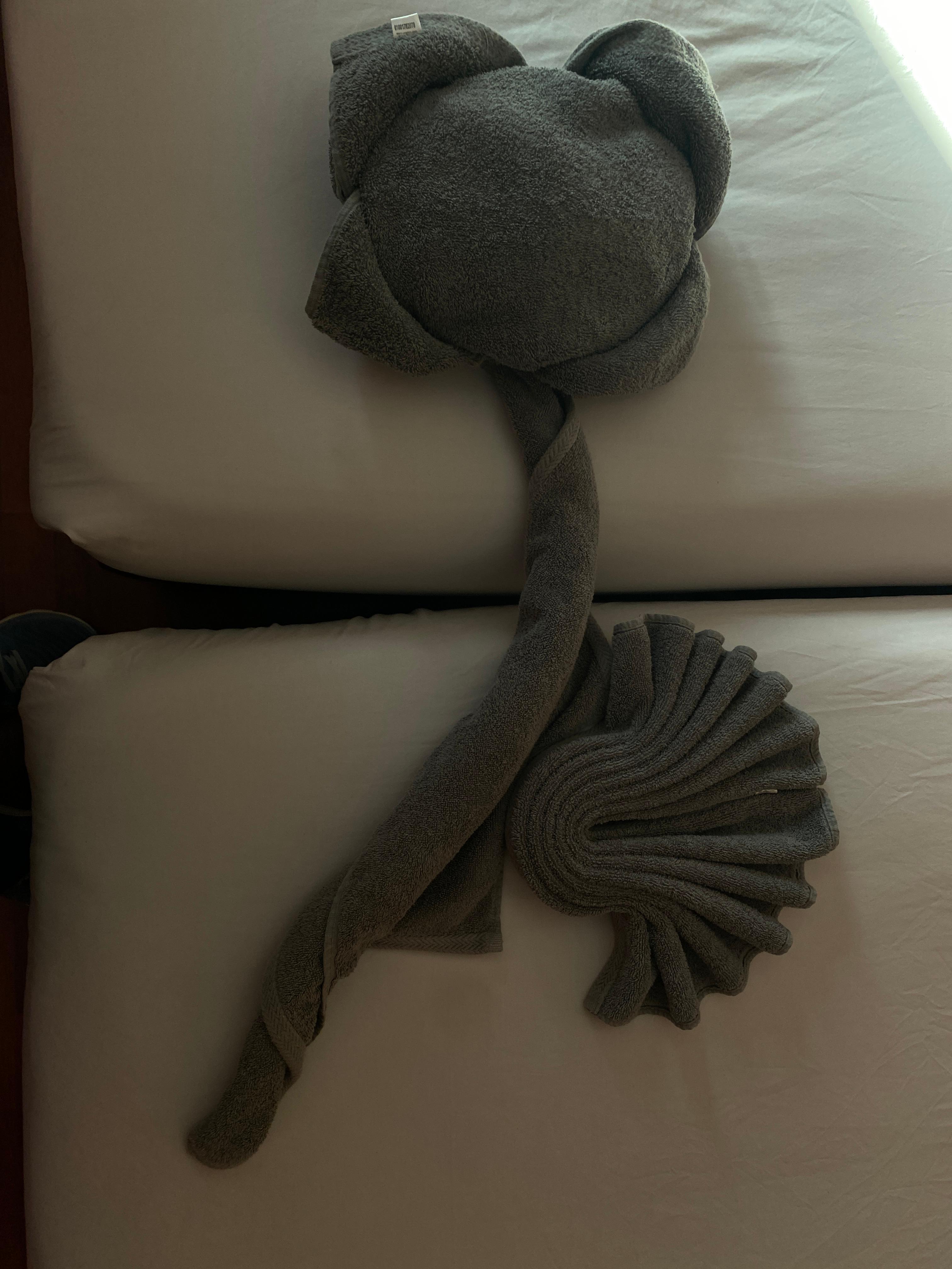 2층의 객실로 들어가니 침대 위에 특별한 작품이 하나 보였다. 샤워 타월로 해바라기 꽃을 만들어 놓은 누군가의 장난끼와 룸서비스가 귀엽게 느껴졌다. 우리들을 위한 배려 같아서 고맙다.^^