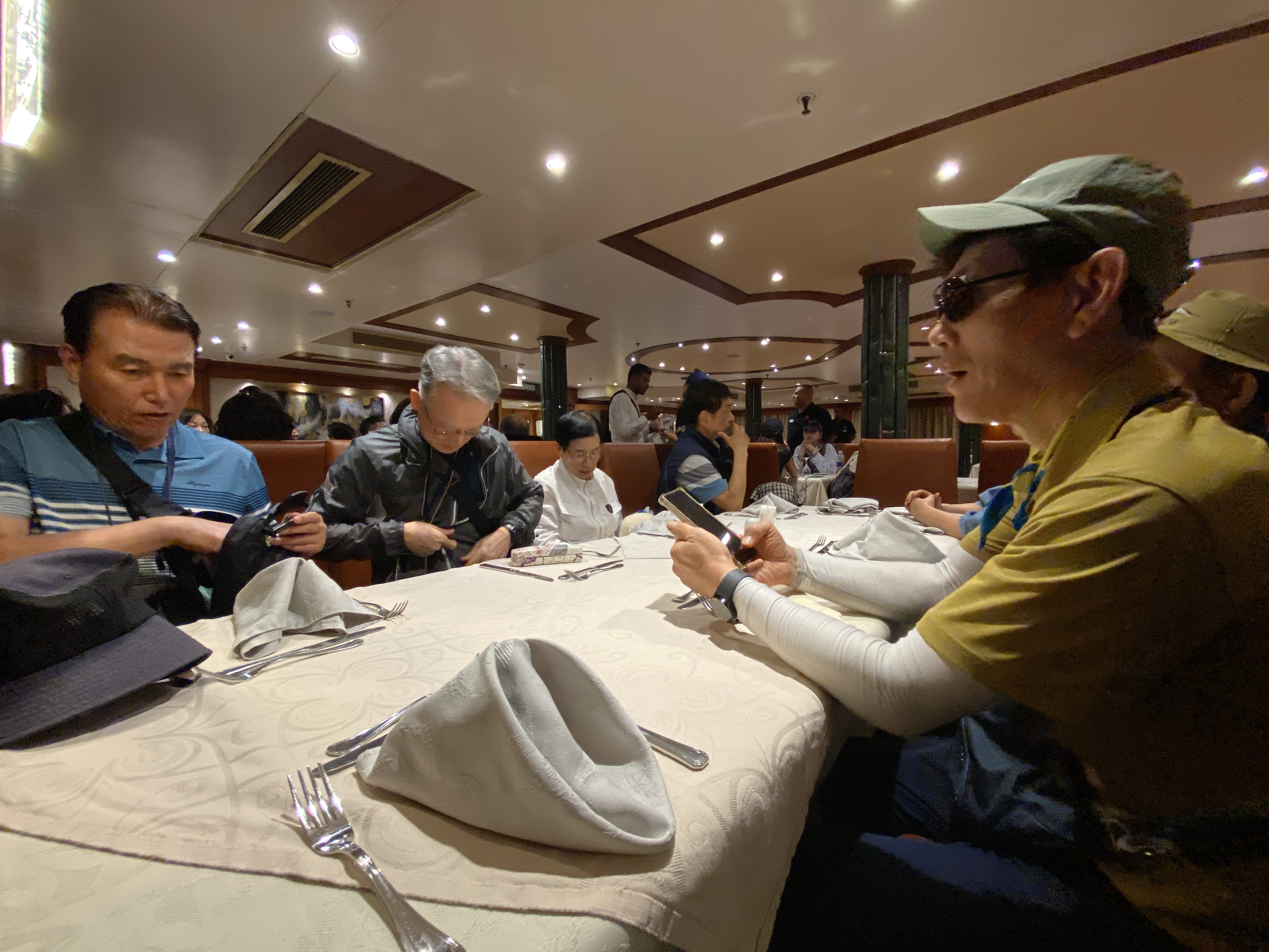나일강 선상 크루즈는 오늘부터 3일간 본격적으로 시작, 그 첫날 저녁 식사 시간에 잠시 식탁에 앉았다. 이 식당 공간은 배의 지하에 위치해 있어서 바로 옆으로 나일강이 흐르고 있다. 오히려 식당은 수면 아래에 위치해 있다고 봐야 한다.