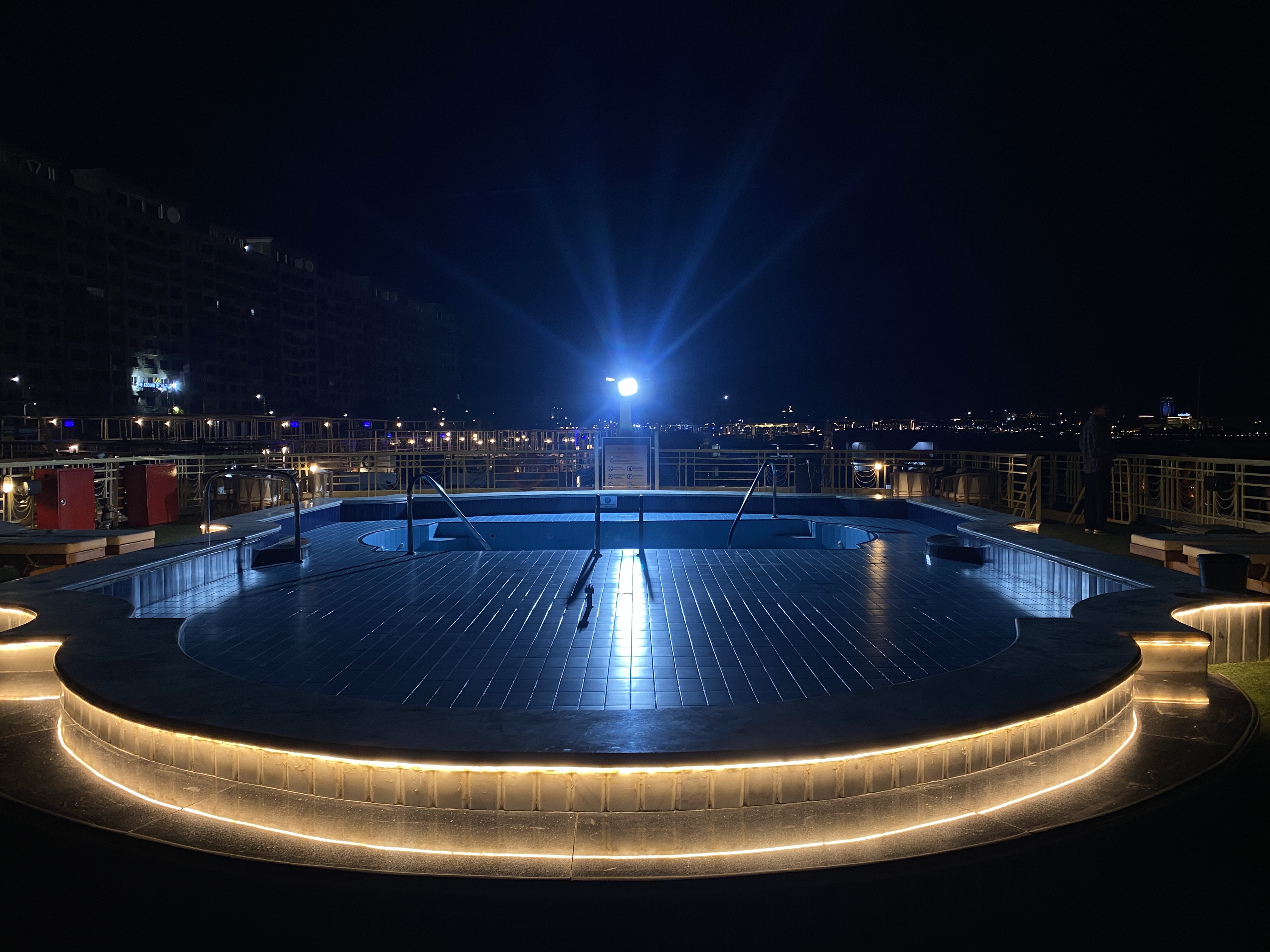 해가 지고 누비안 마을에서 돌아와 저녁 식사를 하고 밤이 이슥해질 무렵에 올라가 본 선상의 풀장, 선선한 강바람 때문인지 사람들 하나 보이지 않았다. 이때는 따스한 차 한 잔을 바람과 함께 마시면 제격일 텐데 하는 생각을 했다. '풍다우주(風多雨酒)'라고 하지 않았던가. ‘바람 불면 차 마시고, 비가 오면 술 마시고’ 풍류를 즐길 수 있을 때 즐겨야지 그 기회를 놓치는 것 같아 다소 아쉽다.