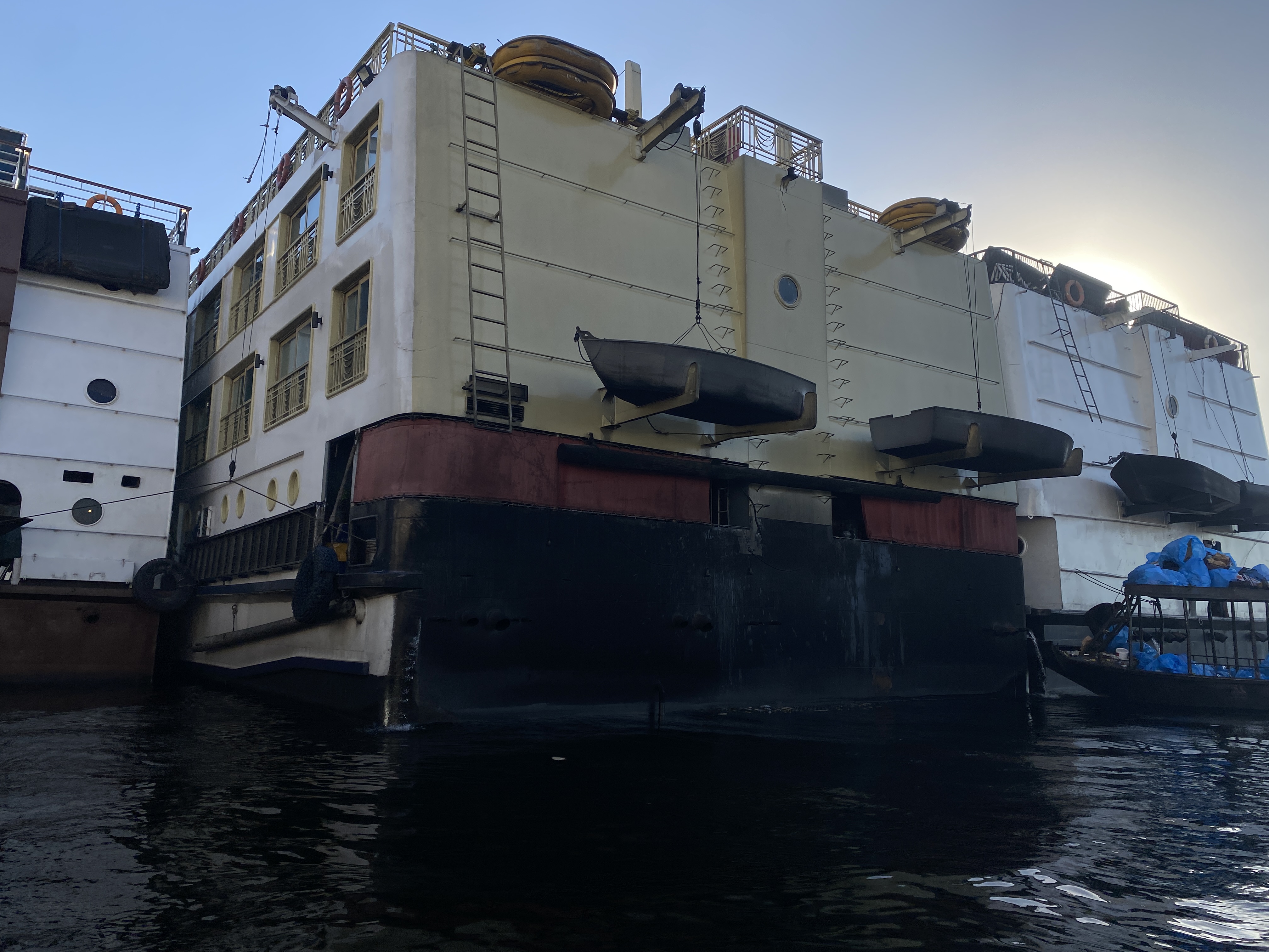 3박 4일간의 나일강 크루즈를 하면서 룩소르까지 우리를 데려다 줄 배의 모습, 우리 숙소가 2층의 선미에 위치해서 엔진소리가 신경쓰인다. 체크인 때 숙소를 둘러보았는데 벌써부터 걱정이다. 주변의 소음에 몹시 민감한 우리들로서는 보통 문제가 아닌 거다. 다른 일행에 비해 차별 받는 느낌을 조금 느끼는 순간이기도 하다. 소위 말하는 복불복이라고 해야 하나? 괜찮은 숙소를 차지할 운이 부족했다고 우리 자신을 위로하자.