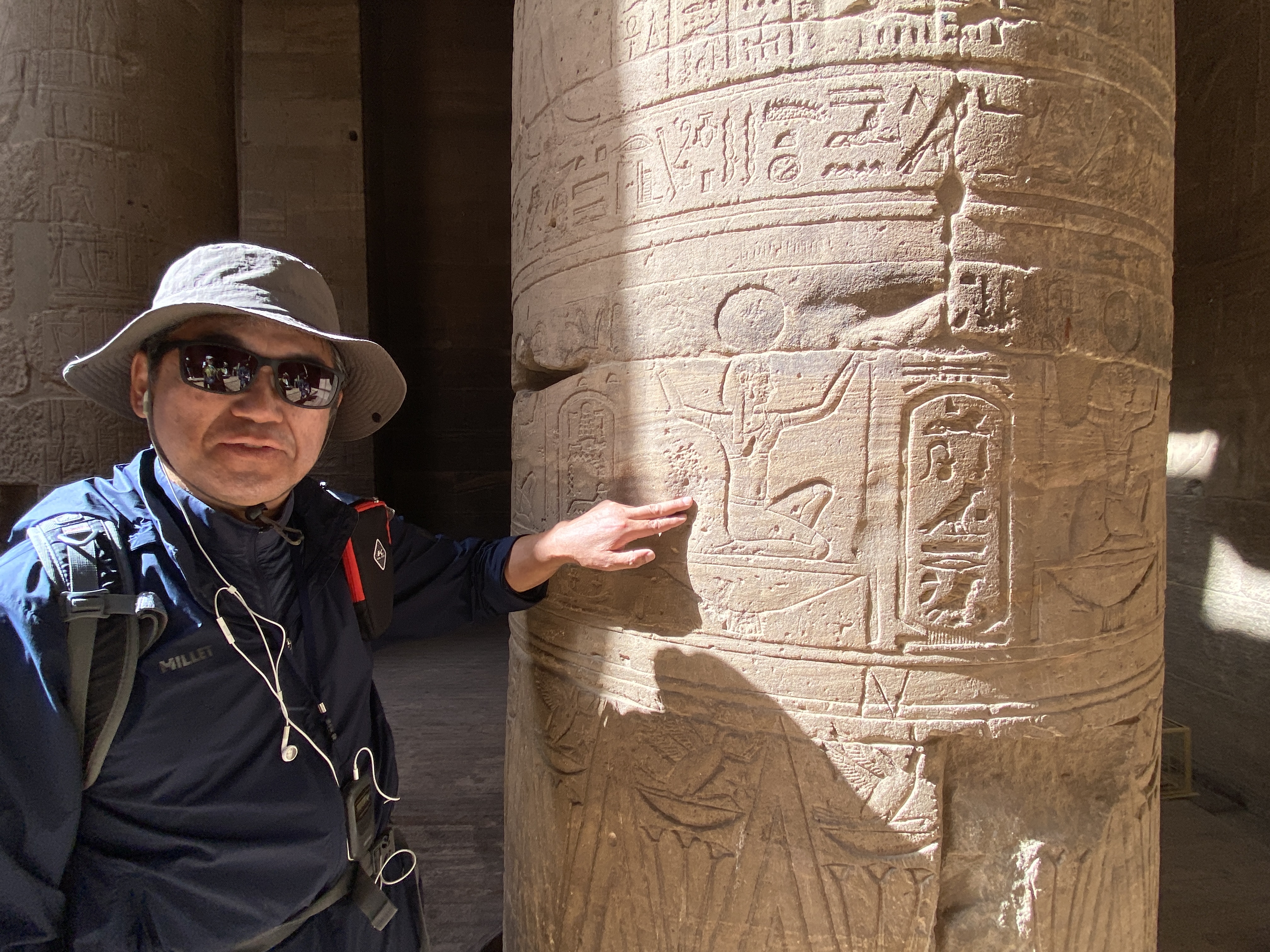 기둥에 새겨진 클레오파트라의 모습과 그 글씨, 기둥의 약간 오른쪽 직사각형의 둥그스름한 네모 안에 새겨진 글씨는 '클레오파트라' 라고 읽는단다. 로제타석의 발견을 통해서 이집트의 상형문자를 대부분 해석할 수 있게 되었다고 하니, 누군가에 의해 기록된 수천 년의 역사의 기록이 얼마나 소중한지 새삼 깨닫게 된다. 그런데 귀한 유물에 저렇게 손을 댈 수 있음은 비판받아야 하지 않을까 한다. 자꾸 손길이 닿다 보면 유물 손상은 막을 수 없을 테니까.