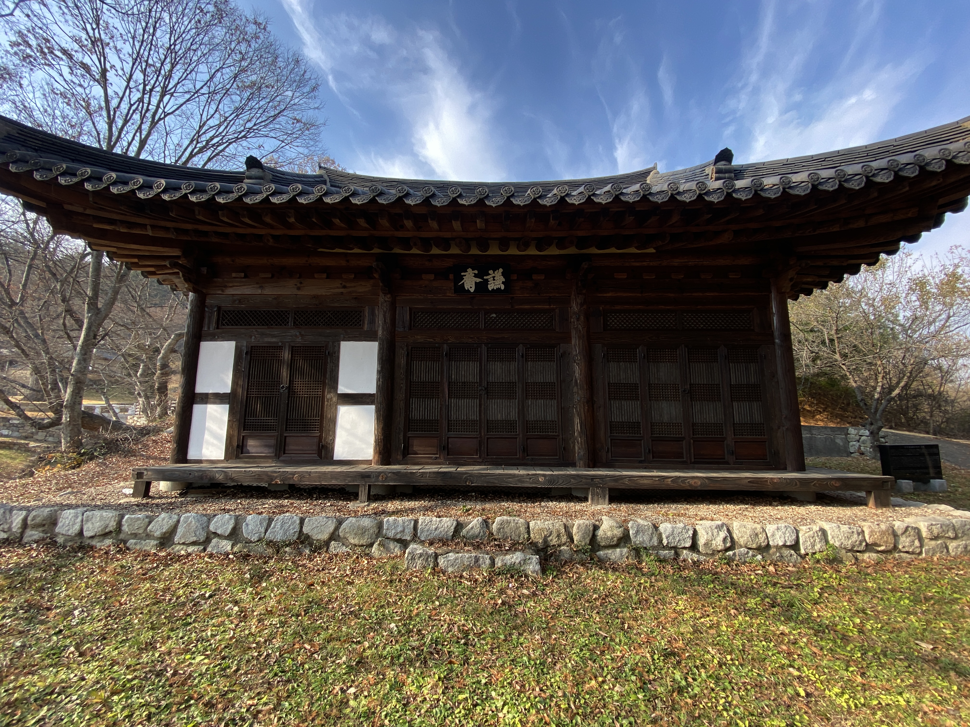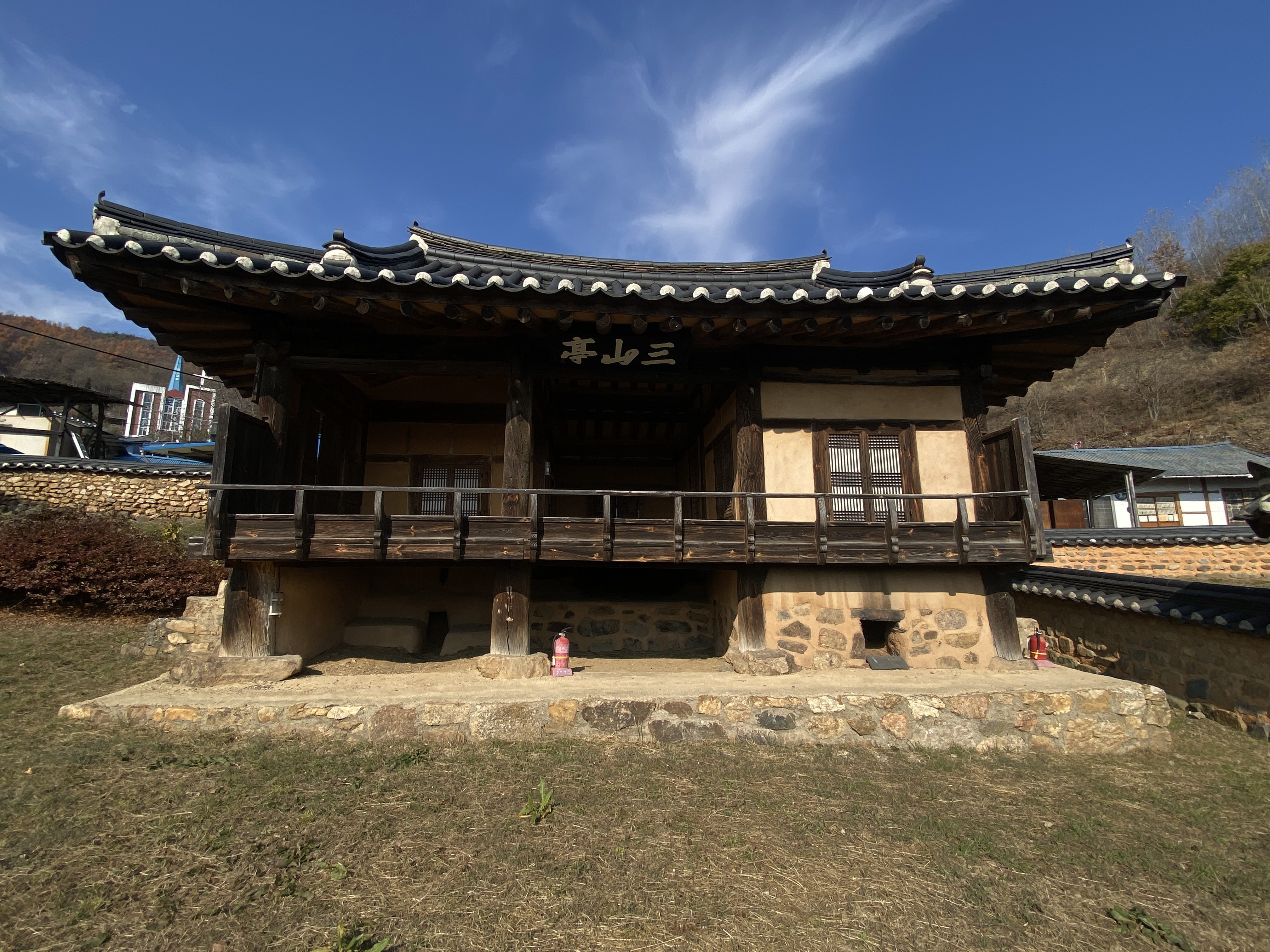 정면 3칸, 측면 2칸의 홑처마 팔작지붕건물. 1982년 경상북도 유형문화재(현, 유형문화유산)로 지정되었다. 1750년(영조 26)경 삼산 유정원(柳正源)이 후손들의 도덕계승과 학문정진을 위해 창건하였다고 한다. 평면을 보면, 어칸은 대청이며, 좌협칸은 앞쪽 1칸 마루 뒤쪽에 1칸 온돌방이 있고 우협칸은 온돌방 2칸이 배치되어 있다. 대청과 온돌방 전면에는 기둥 밖으로 마루를 조금 내밀어 계자각 헌함(軒檻 : 대청 기둥 밖으로 돌아가며 깐 좁은 마루)을 돌렸고, 누하주와 누상주는 별주를 사용하였으며 온돌방이 있는 누 하부의 일부는 벽체로 막아 구들을 축조하였다. 가구는 측면 가운데 주열에서 합보[合梁 : 두 부재를 결합시켜 한 개의 보로 만든 것]로 처리하고 위치에 따라 장여를 놓았으며, 측면 중앙 기둥에서 뻗어나온 충량은 퇴량과 함께 주두(柱頭) 위에서 결구되었다. 합보로 이루어진 대량위에는 동자주(童子柱 : 세로로 세운 짧은 기둥)를 세워 종량을 받았는데, 동자주상에 공포를 짜아 종량의 보아지와 중도리 장여를 받게 하였으며, 종량 위에는 동자주를 두어 종도리를 받고 있다. 특히 온돌방을 넓히기 위해 종대공과 측면 중앙기둥을 동일선상에 두지 않고 서로 어긋나게 배치하였다. 전체적으로 볼 때 건물의 평면 구성방식과 상부 가구수법, 특히 누마루집이면서 기둥은 모두 평주를 사용하여 대량과 퇴량을 합보로 처리한 것이나 종대공과 중앙기둥을 동일선상에 두지 않은 점, 중대공의 세부수법 등은 드문 예이다.