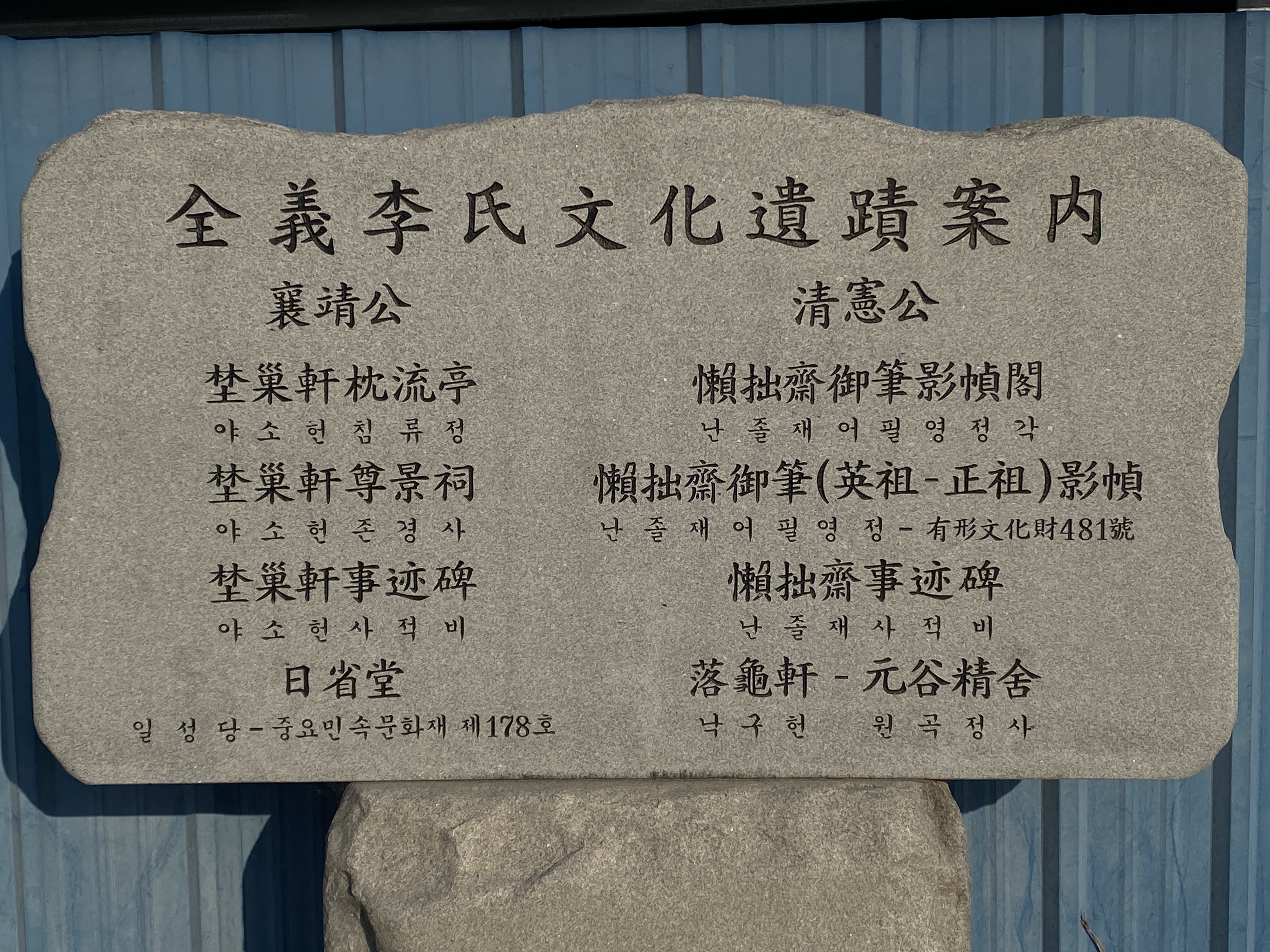 안동시 풍산읍 하1리의 3번지 전의이씨 문중 소유로 침류정 아래 자리 잡고있다. 하리 마을 뒤편의 산골을 따라 올라가면 사방이 낮은 산으로 둘러싸인 깊은 곳에 남동향으로 앉아 있다. 산자락 끝의 완 경사지 일부를 정지하여 건물을 앉히고 사방을 판축 담장을 둘렀다. 정면 담장 중앙에 출입 사주문이 나있고 앞으로는 이 영정각을 오르는 계단이 설치되어 있으며 좌측 편 산 능선에는 전의(全義) 이씨 양정공파(襄靖公派)문중 소유의 침류정 아래 자리 잡고 있다.