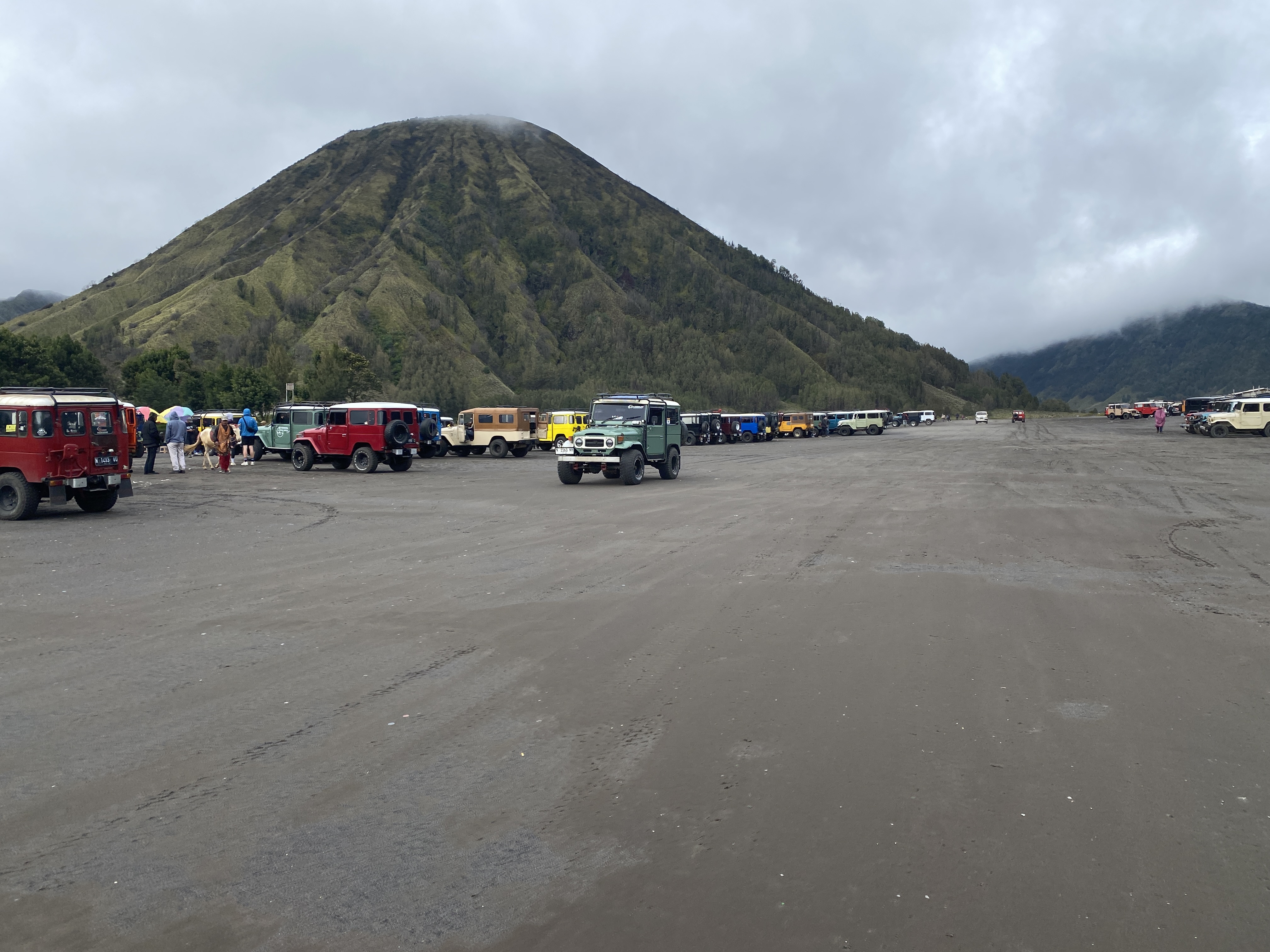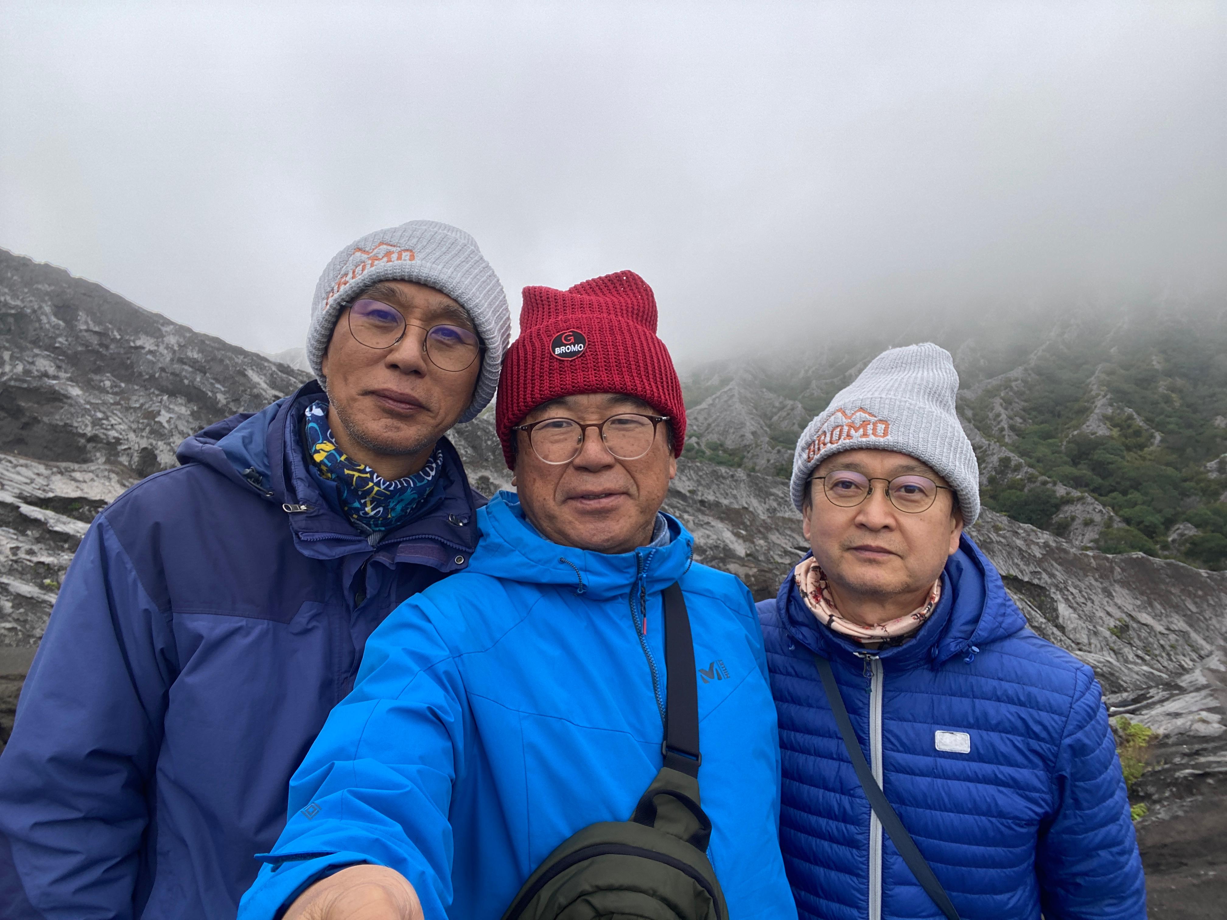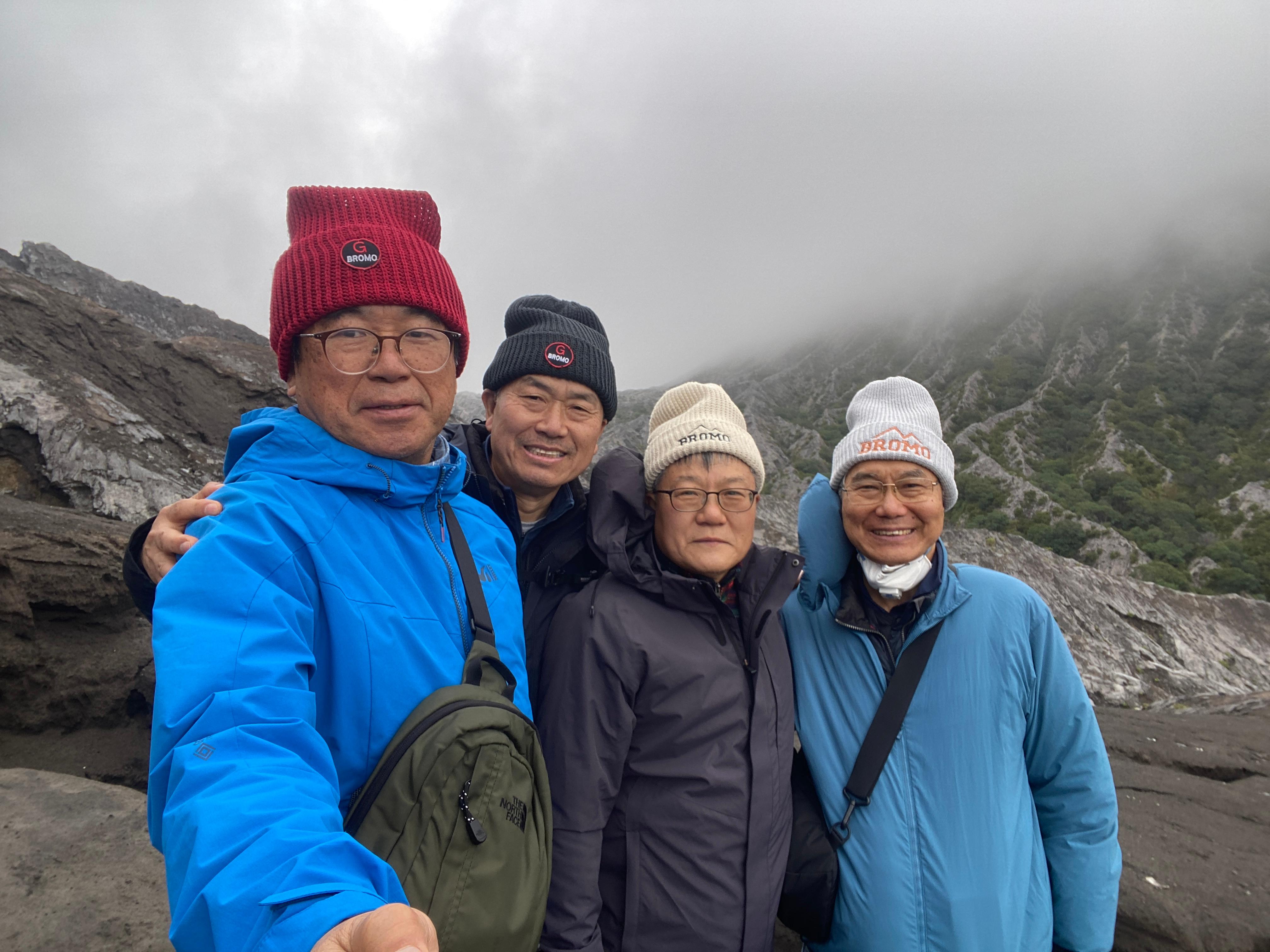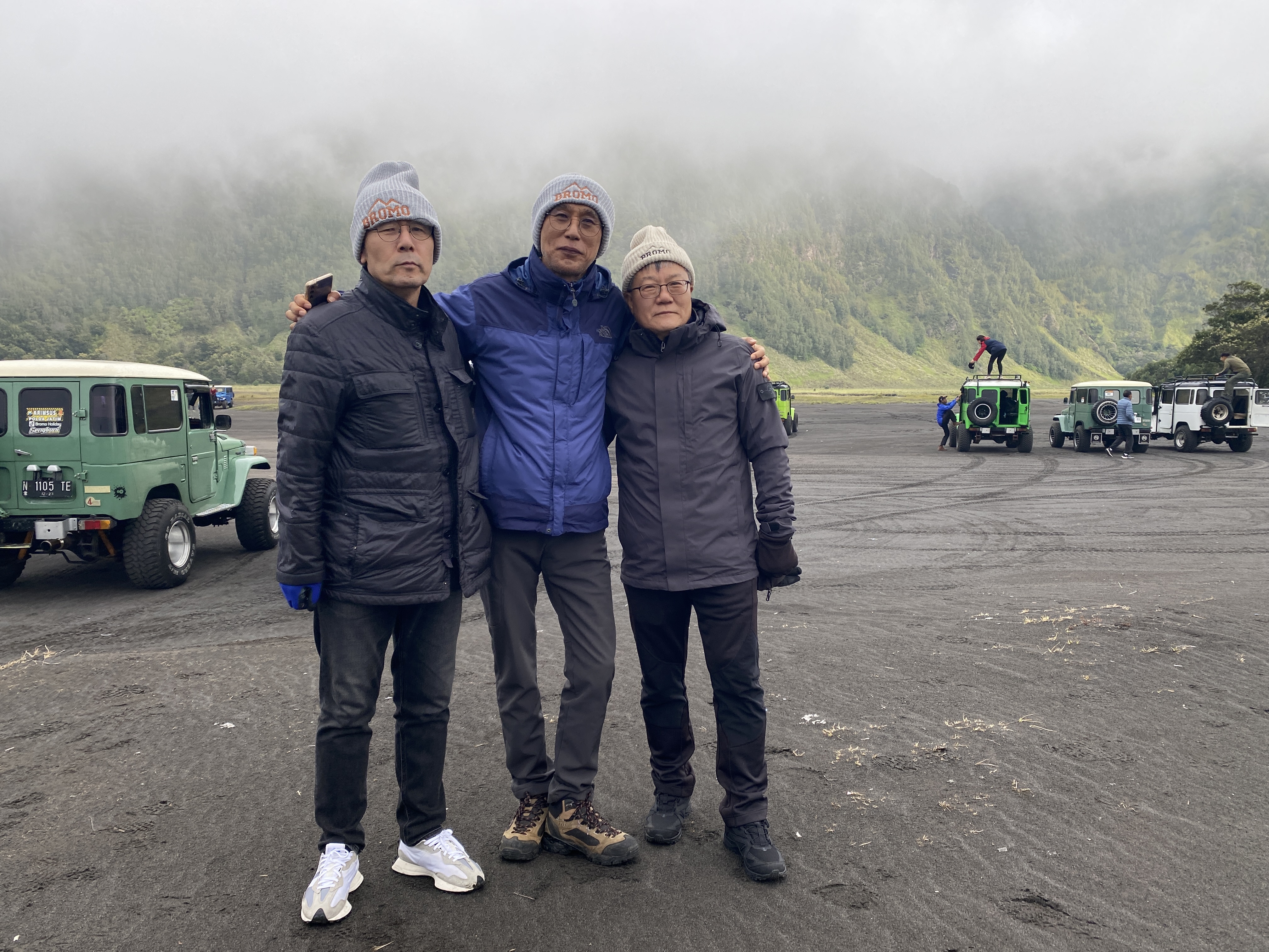 브로모 화산의 바로 옆에 있는 화산, 초록으로 덮여있는 산이라서 더 정감이 간다. 그런데 룸메이트 순균이가 보이지 않는다. 먼저 내려갔는데 차에도 없고 아무리 찾아도 없다. 전화를 걸어도 받지 않는다. 어찌 된 거야? 동료들 애먹일 일이 있나 이 친구 도대체 어디로 간 것일까 일부러 장난을 치는 것일까? 브로모 화산으로 가긴 위한 출발 지점으로 왔으면 거기에 있어야지..... 나중에 안 사실이지만 잠시 착각을 일으켜서 현수막을 펼쳐서 사진을 찍었던 장소에서 출발한 것으로 알고 거기에 먼저 가서 기다리고 있었다는 것이다. '순균아, 벌써 그런 증세를 보이면 어떡하니? 70세 중반쯤이라면 이해가 된다만......'^^