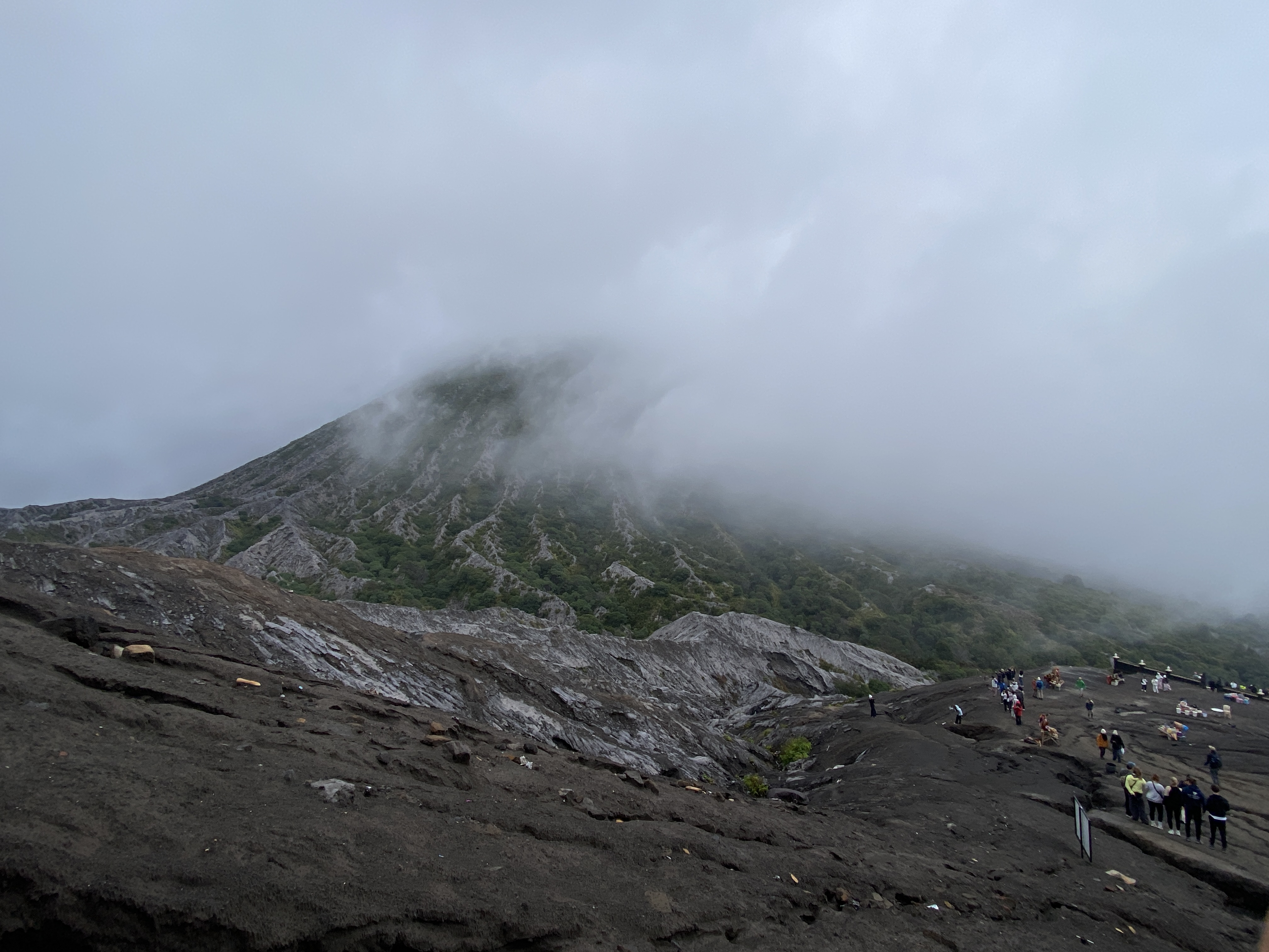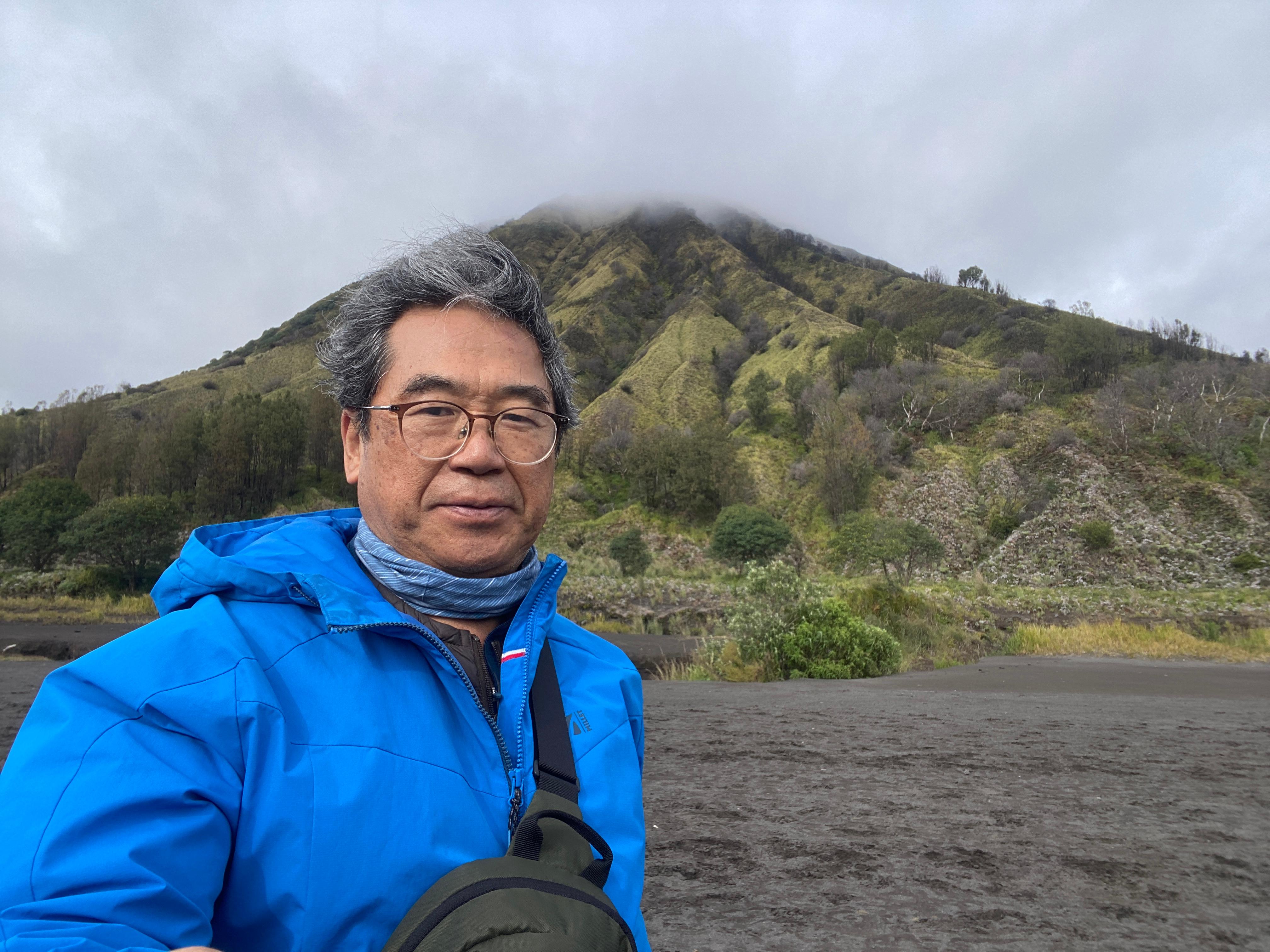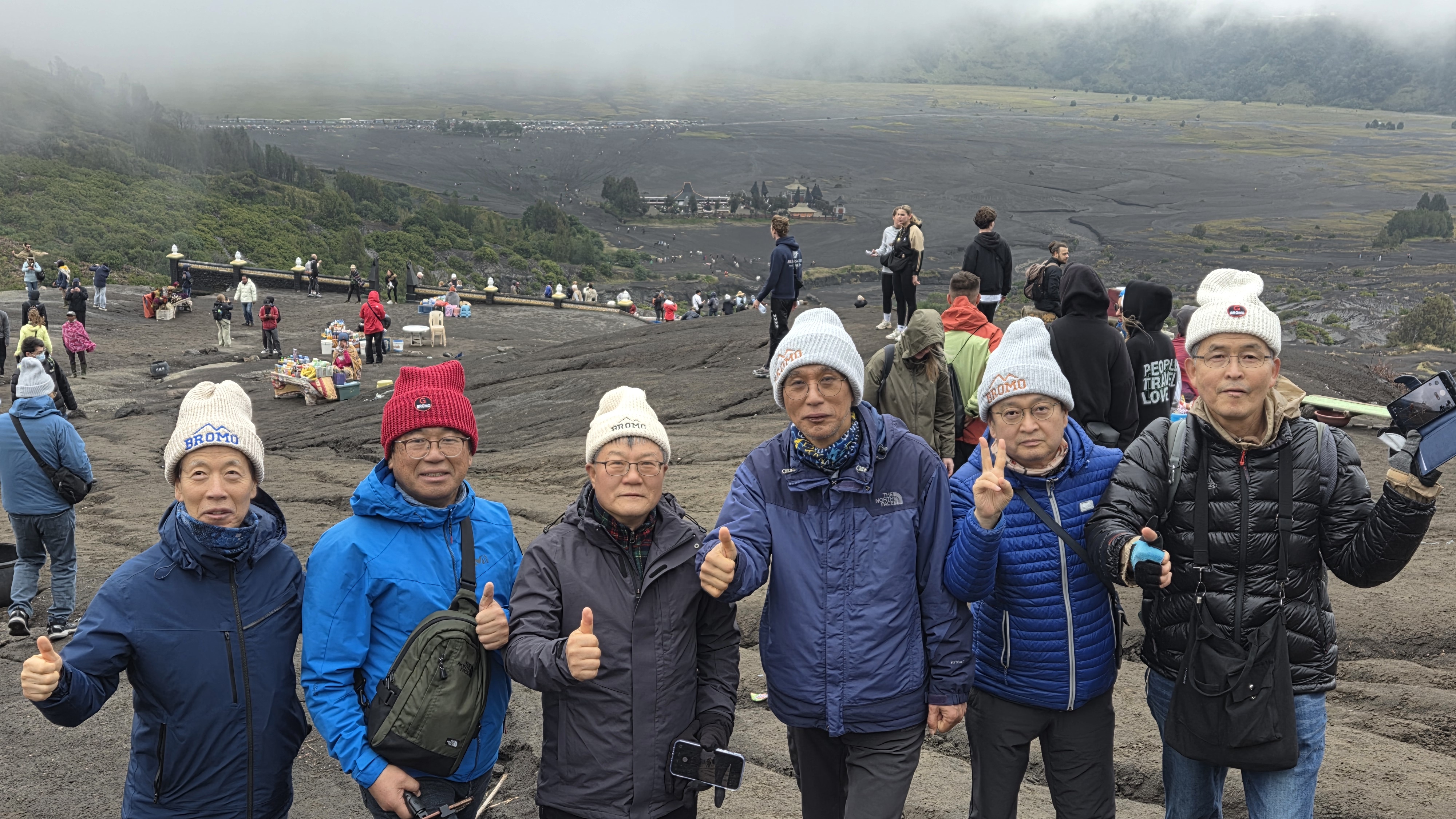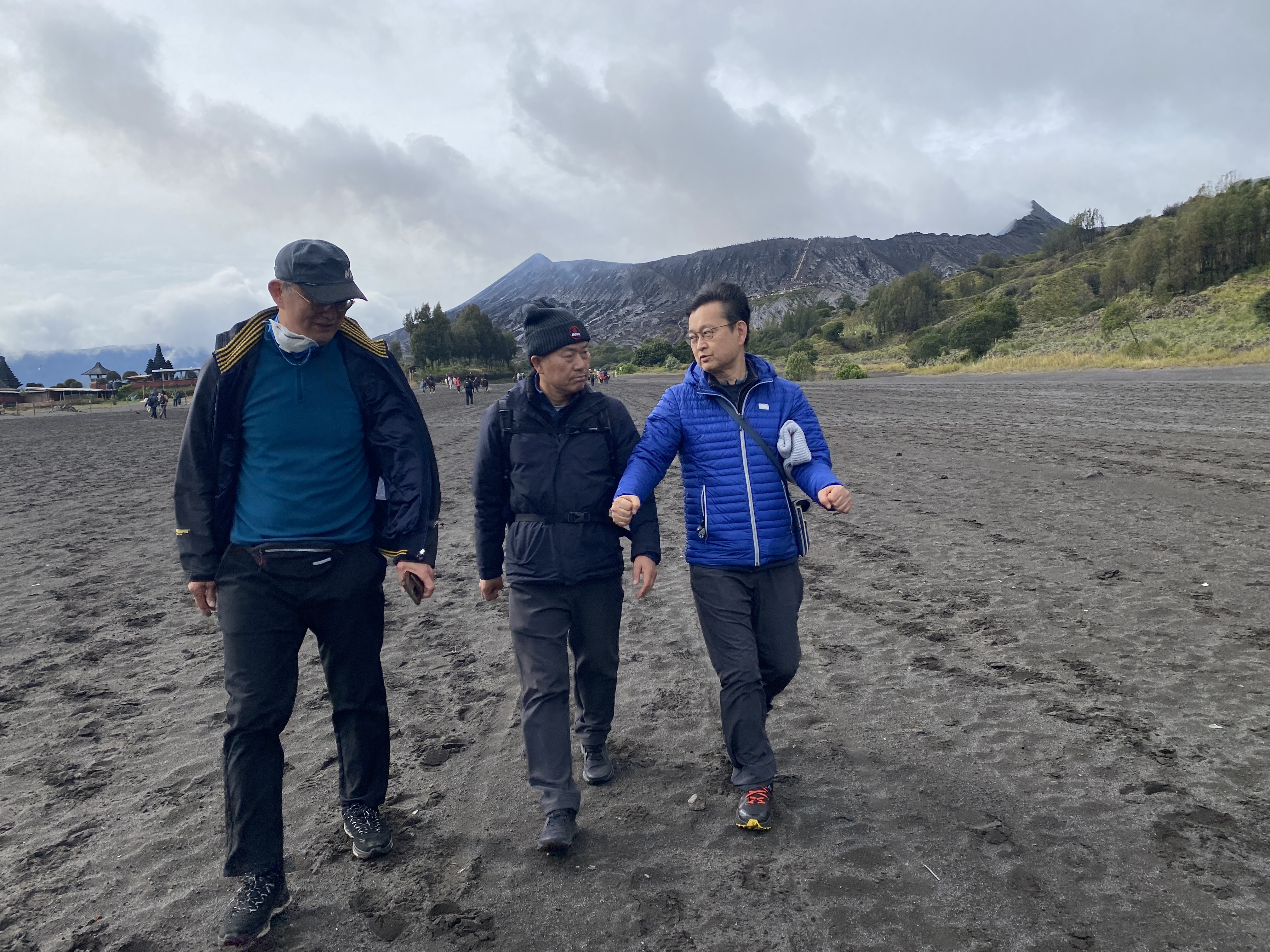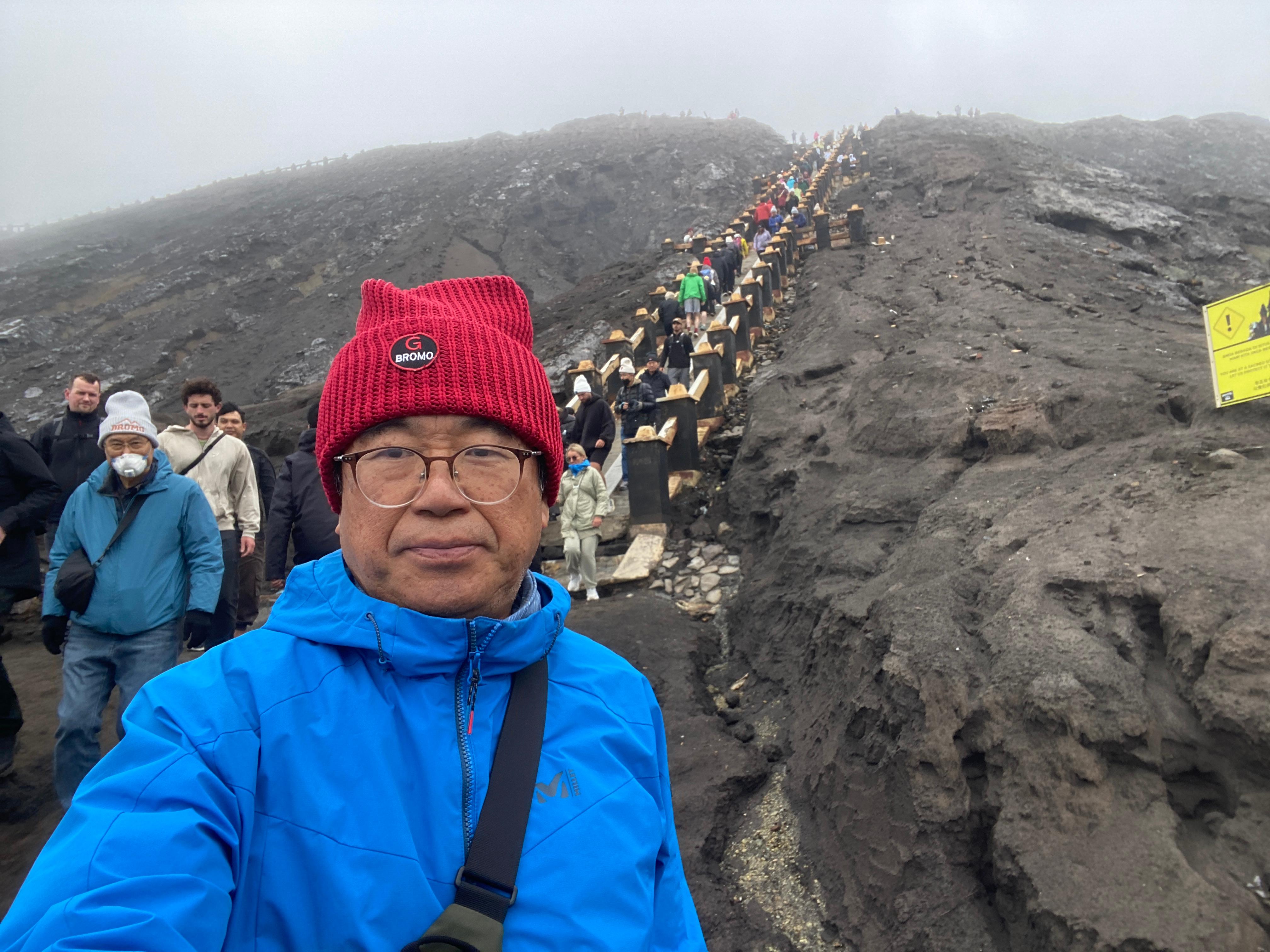 브로모 화산의 바로 옆에 있는 화산, 초록으로 덮여있는 산이라서 더 정감이 간다. 그런데 룸메이트 순균이가 보이지 않는다. 먼저 내려갔는데 차에도 없고 아무리 찾아도 없다. 전화를 걸어도 받지 않는다. 어찌 된 거야? 동료들 애먹일 일이 있나 이 친구 도대체 어디로 간 것일까 일부러 장난을 치는 것일까? 브로모 화산으로 가긴 위한 출발 지점으로 왔으면 거기에 있어야지..... 나중에 안 사실이지만 잠시 착각을 일으켜서 현수막을 펼쳐서 사진을 찍었던 장소에서 출발한 것으로 알고 거기에 먼저 가서 기다리고 있었다는 것이다. '순균아, 벌써 그런 증세를 보이면 어떡하니? 70세 중반쯤이라면 이해가 된다만......'^^