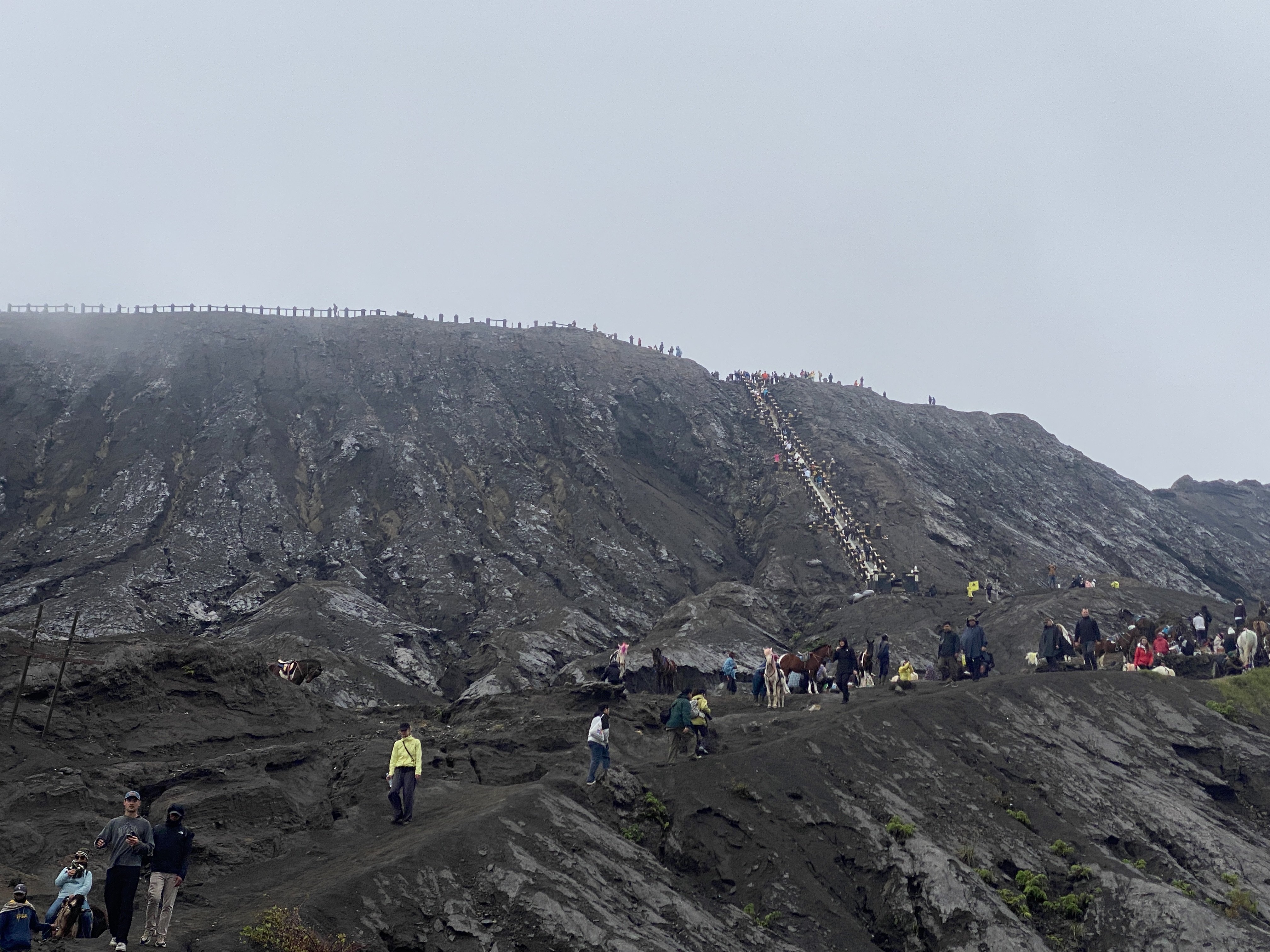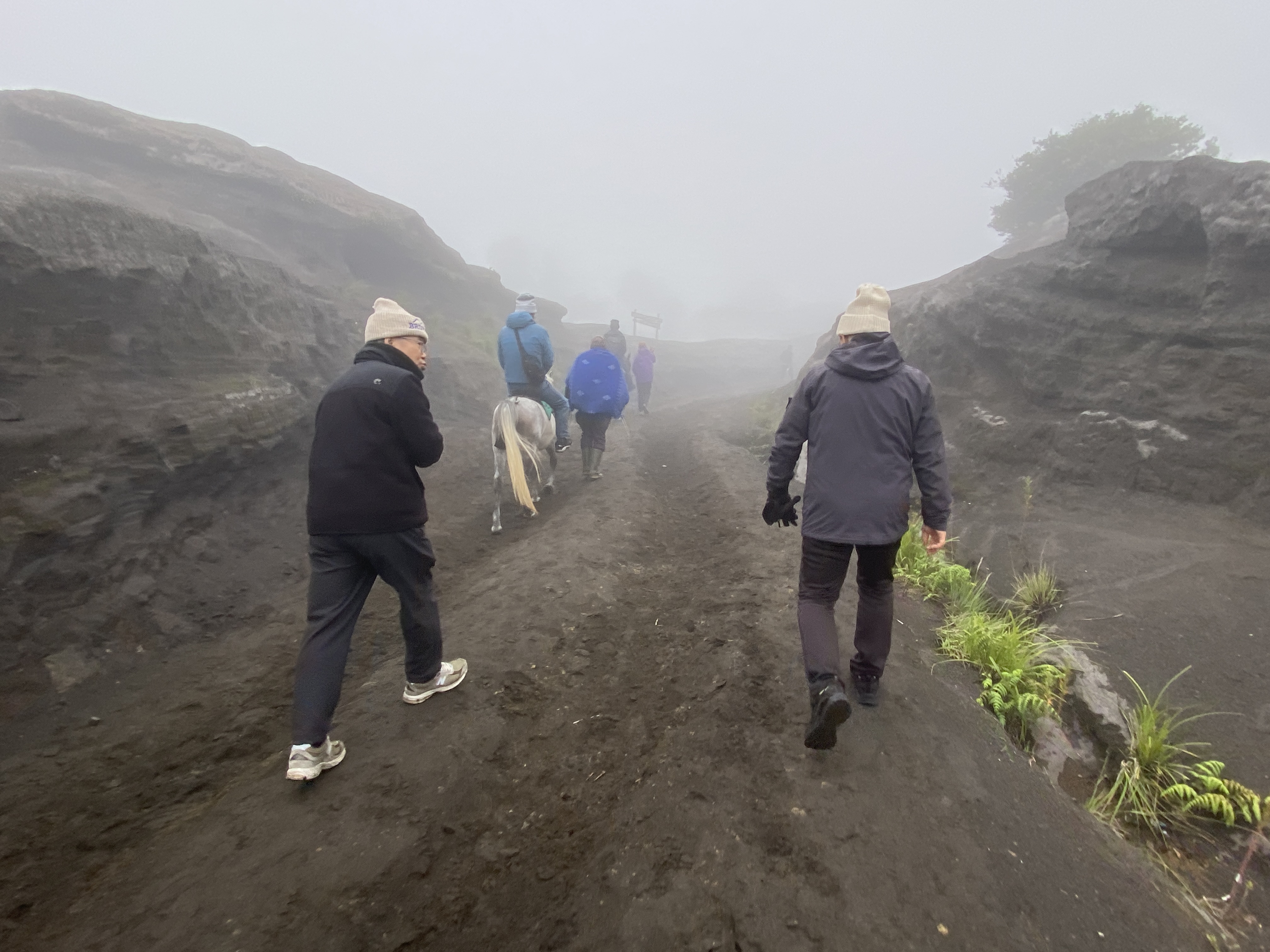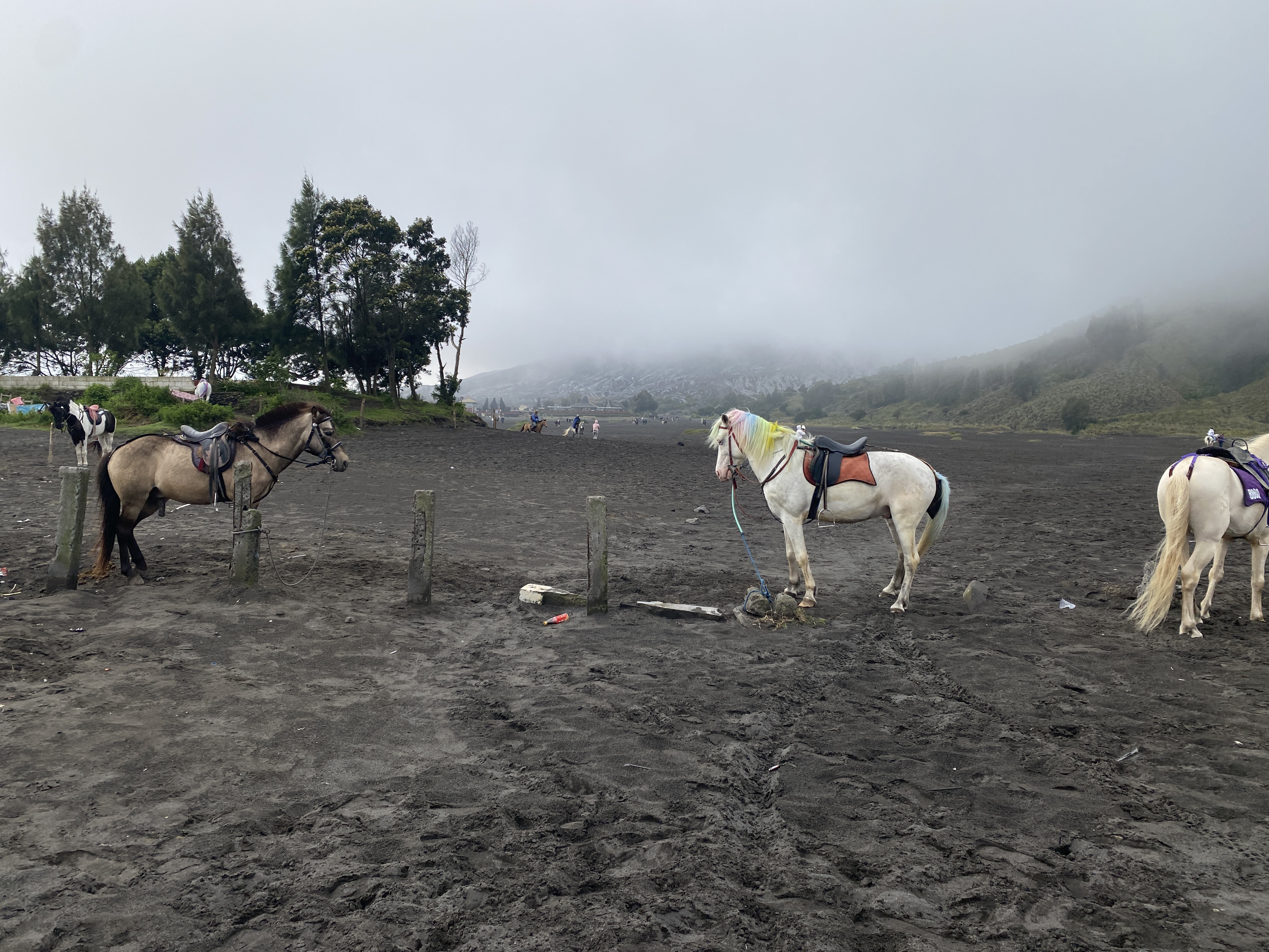 브로모 화산이 안개 너머로 어렴풋이 보인다. 안개가 원망스럽긴 하다. 저 말을 타고 화산 언저리 계단 밑까지 갈 수도 있다는데 걸어가도 그다지 오래 걸리지 않는다. 왕복 3만원의 돈을 요구해서 우리 일행은 걸어서 갔다 오는 것으로 결정했다. 30분이면 충분히 갈 수 있는 거리인데 굳이 말을 타고 갈 필요가 있겠냐는 것이다.