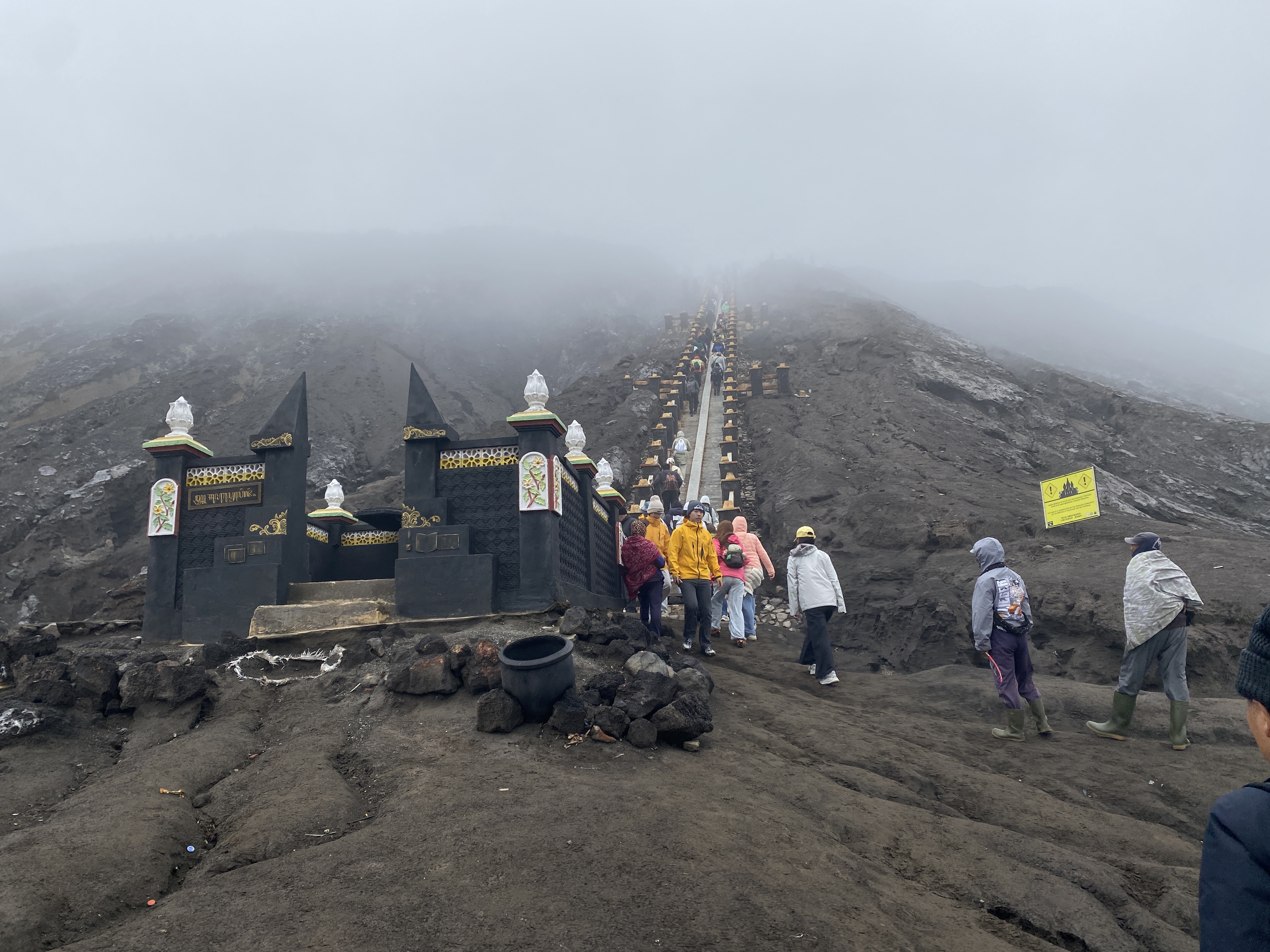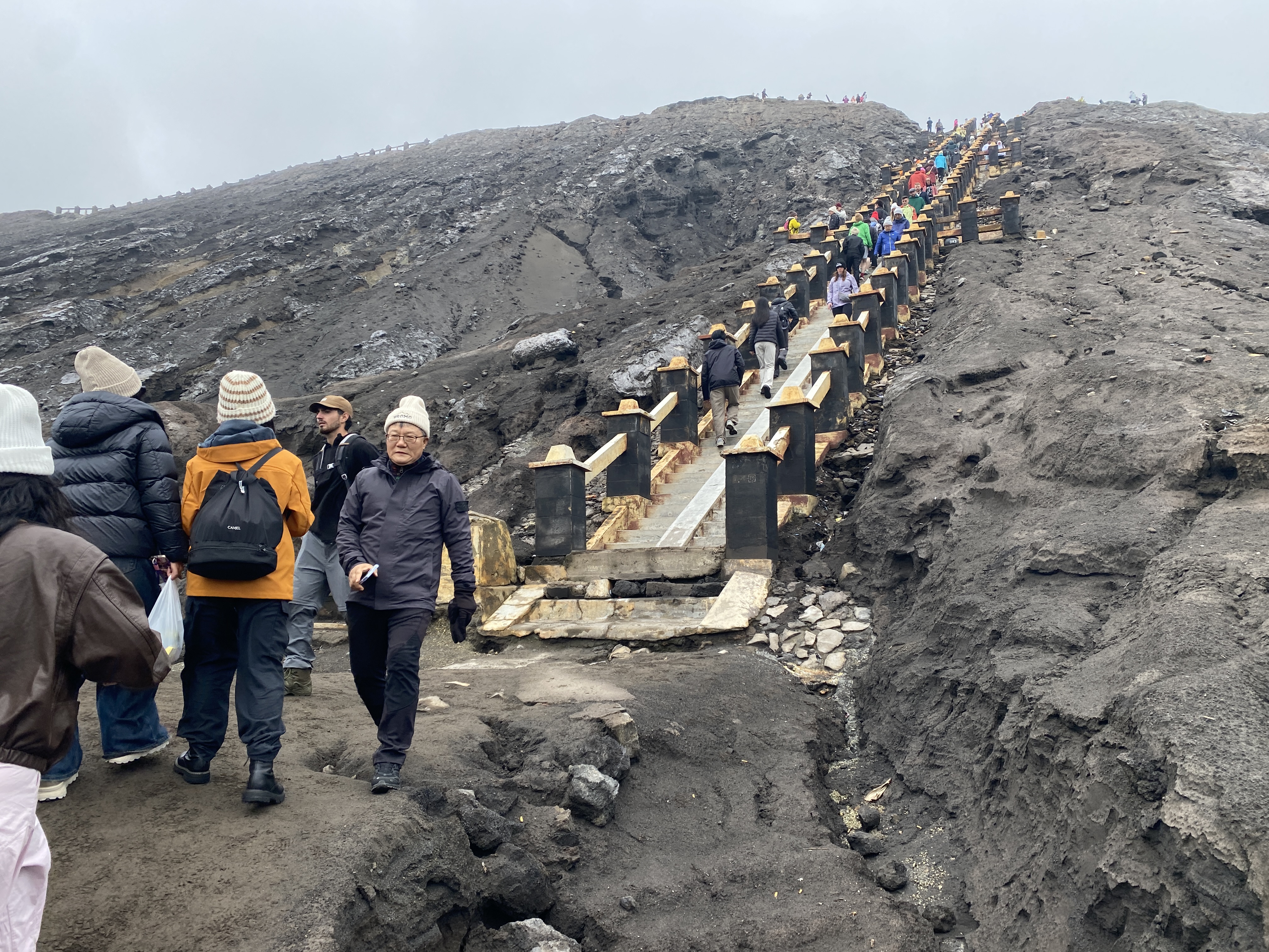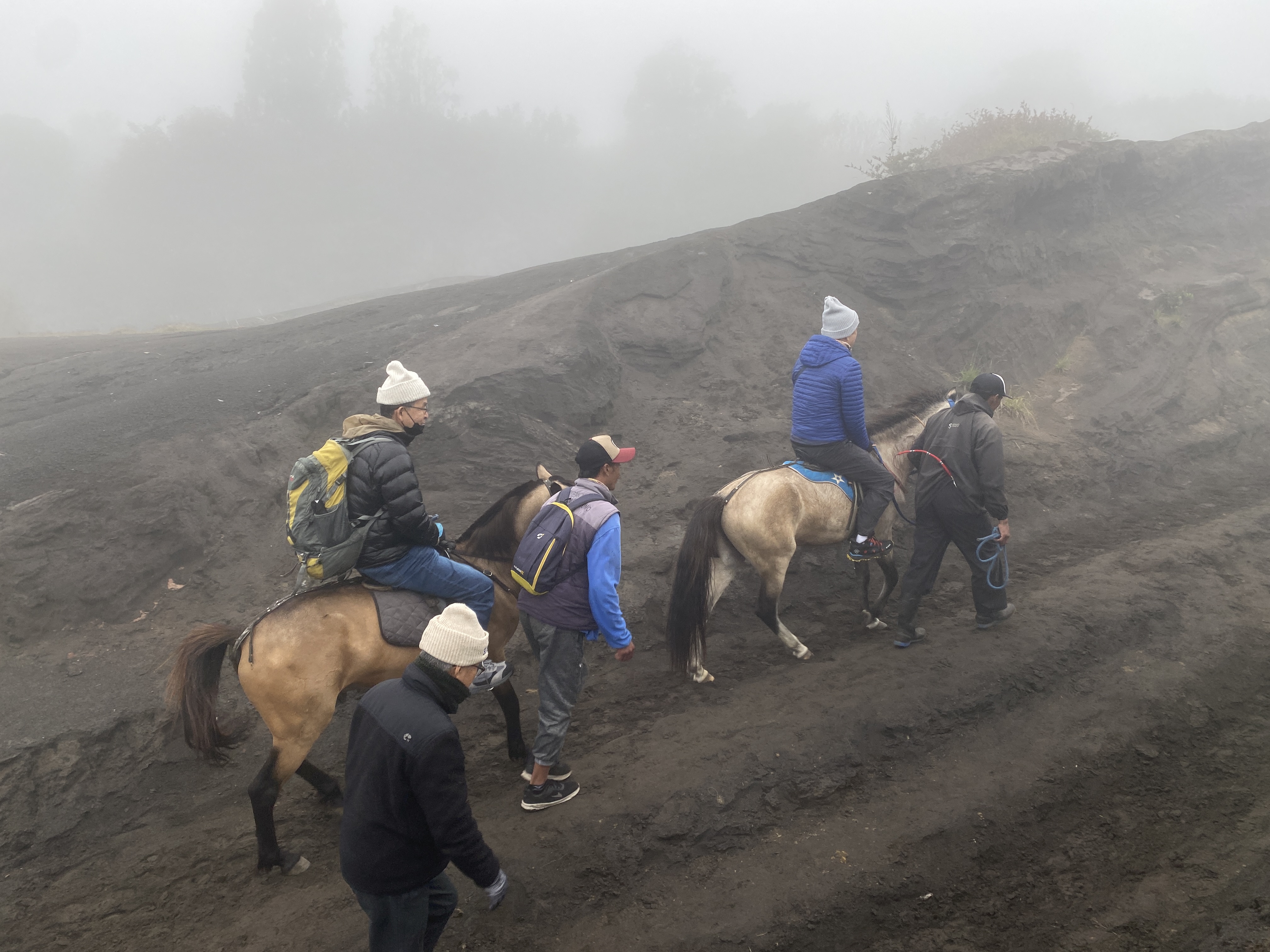 브로모 화산이 안개 너머로 어렴풋이 보인다. 안개가 원망스럽긴 하다. 저 말을 타고 화산 언저리 계단 밑까지 갈 수도 있다는데 걸어가도 그다지 오래 걸리지 않는다. 왕복 3만원의 돈을 요구해서 우리 일행은 걸어서 갔다 오는 것으로 결정했다. 30분이면 충분히 갈 수 있는 거리인데 굳이 말을 타고 갈 필요가 있겠냐는 것이다.