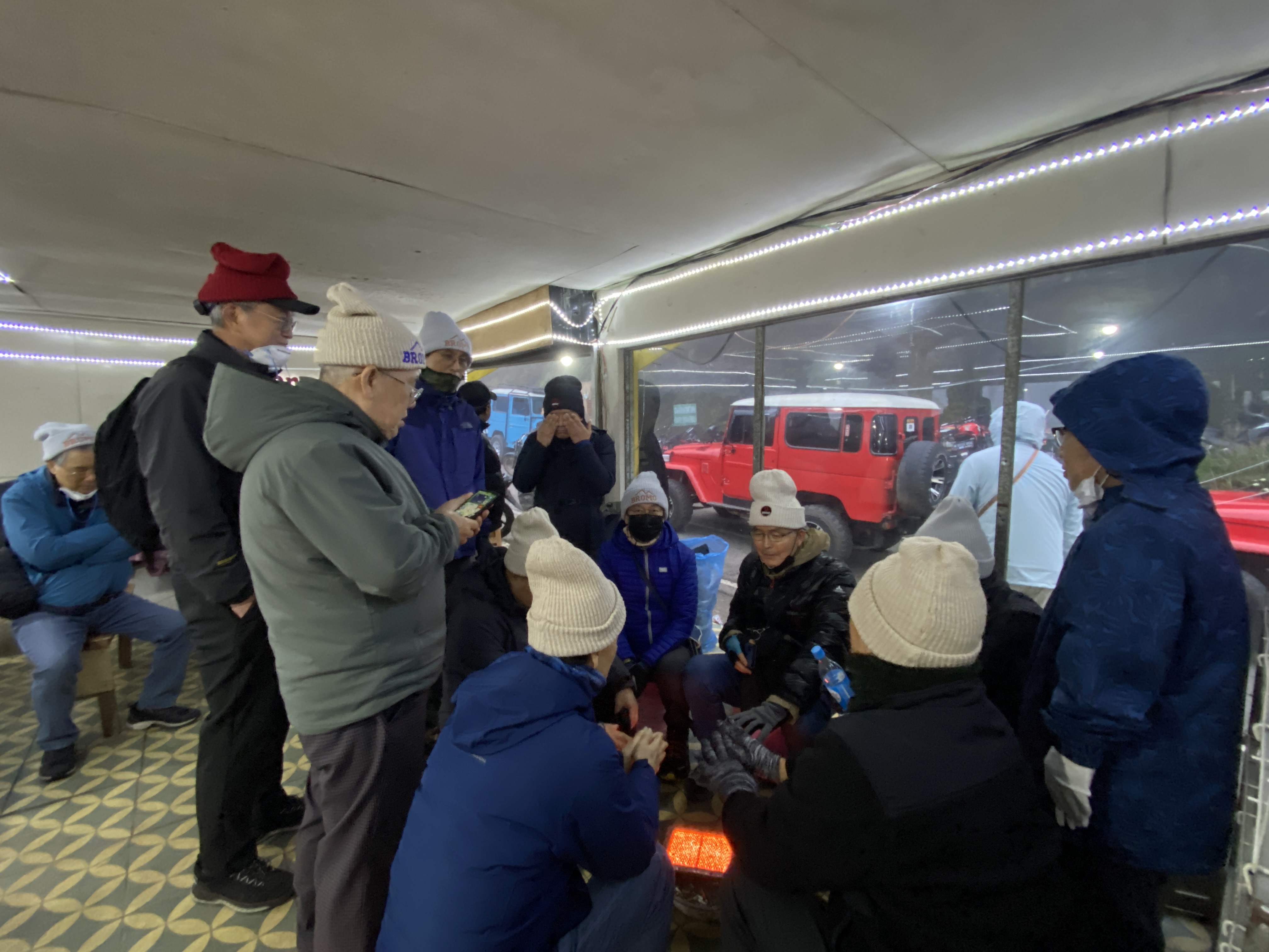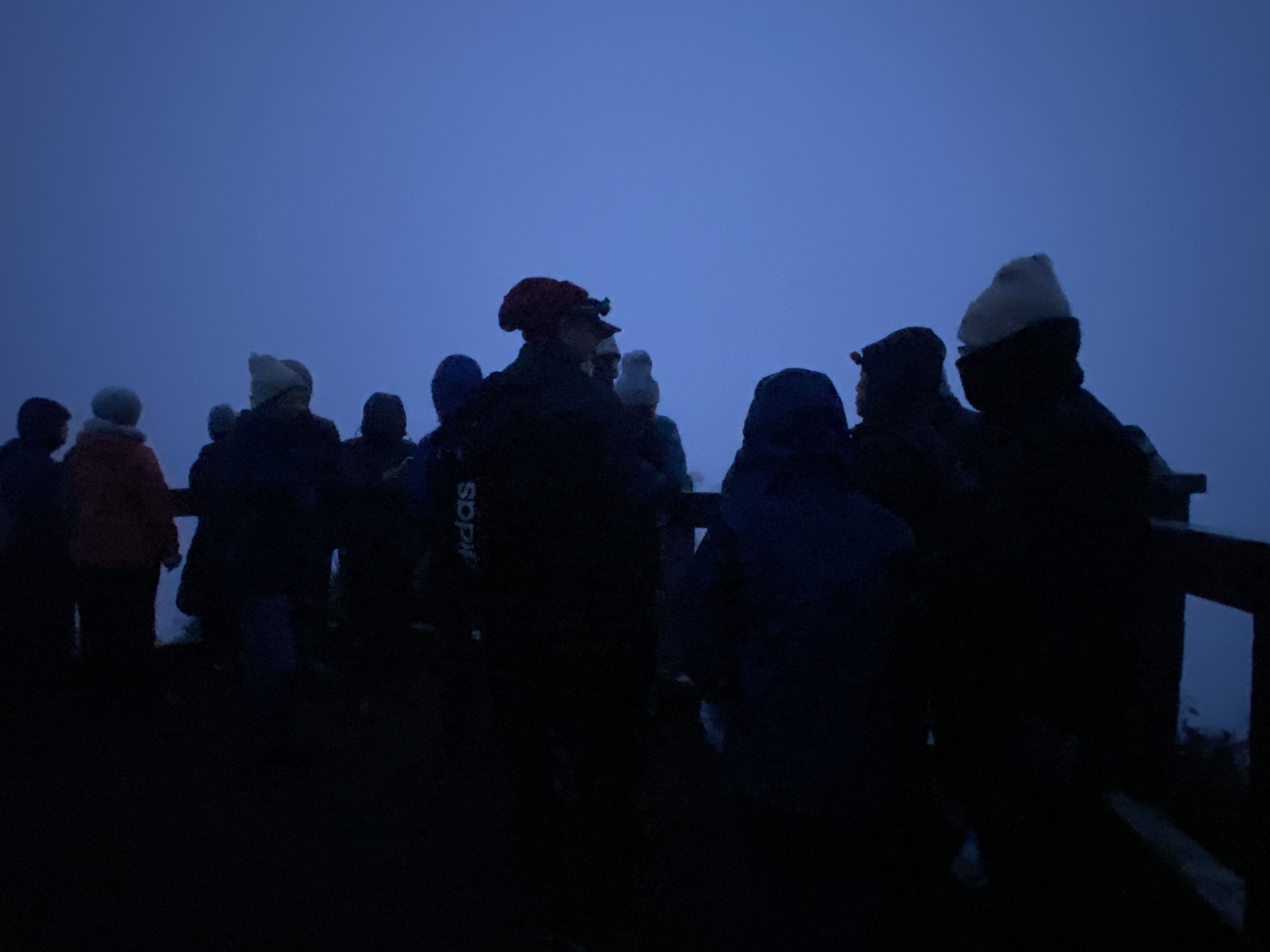 새벽 공기는 매우 찼다. 가만히 서서 기다리기 힘들어서 전망대 주변의 공간을 어슬렁거렸다. 앉았다 일어나기를 반복하는 스쿼트 운동도 하다가 고개를 좌우로 돌리기도 하고 난간에 기대어 팔굽혀펴기 등도 시도해 보았다. 친구들끼리 주고받는 걸쭉한 경상도 사투리가 참 재미있고 구수했다. 외국인들도 많이 보였는데 그들에게는 우리들의 이야기가 소음으로 들렸을 가능성이 크다. 그렇다고 그 재미난 이야기를 멈출 수는 없지 않은가.^^