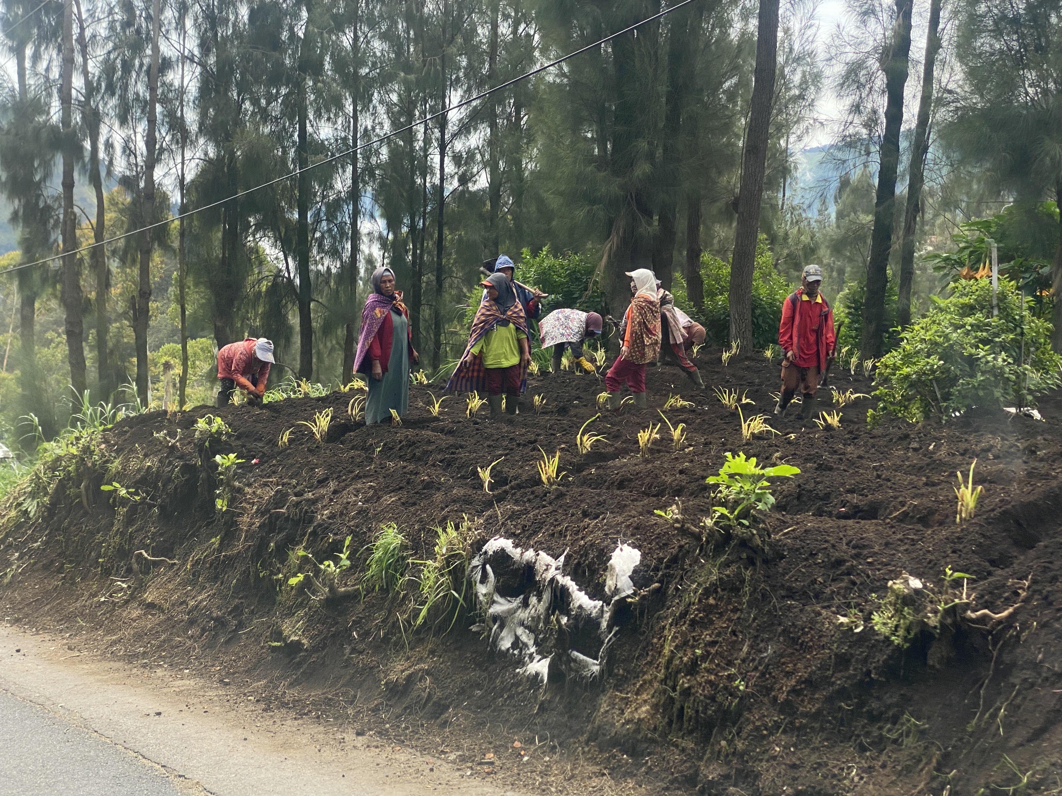 '집나갔던 순균이'를 찾아 일행보다 늦게 출발했던 짚차는 일행과의 합류를 위해 다소 속도를 냈다. SUV 차량이 대기하고 있는 장소까지 가는 것이다. 동네사람들이 품앗이처럼 일하고 있는 모습들이 보여 사진기를 내밀었다. 저 검은 땅은 화산재의 성분이 많을 것으로 예상된다. 단기적으로 큰 피해를 주지만 장기적으로 안정화하면 상당한 이점을 안겨주기도 하는 화산재에는 칼륨, 나트륨, 칼슘 등 식물 생장에 필요한 무기질이 풍부하고 천연비료의 역할을 한다고 한다.