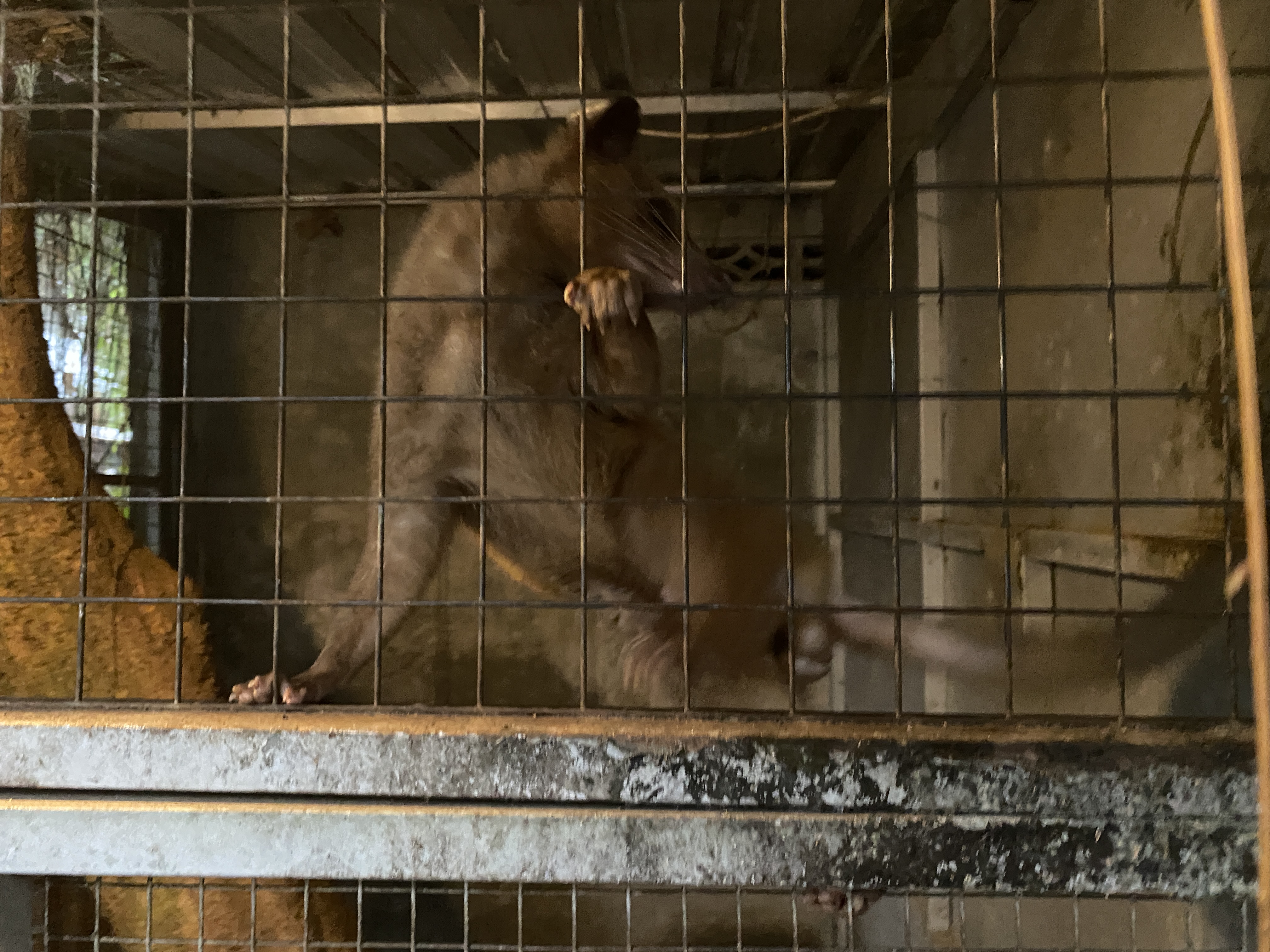 루왁 커피의 주인공 사향고양이의 모습, 철창 안에 갇힌 녀석의 신세가 애처롭다. 그 커피에 대한 신뢰를 높이기 위한 상술이 작용했음에 틀림없다.