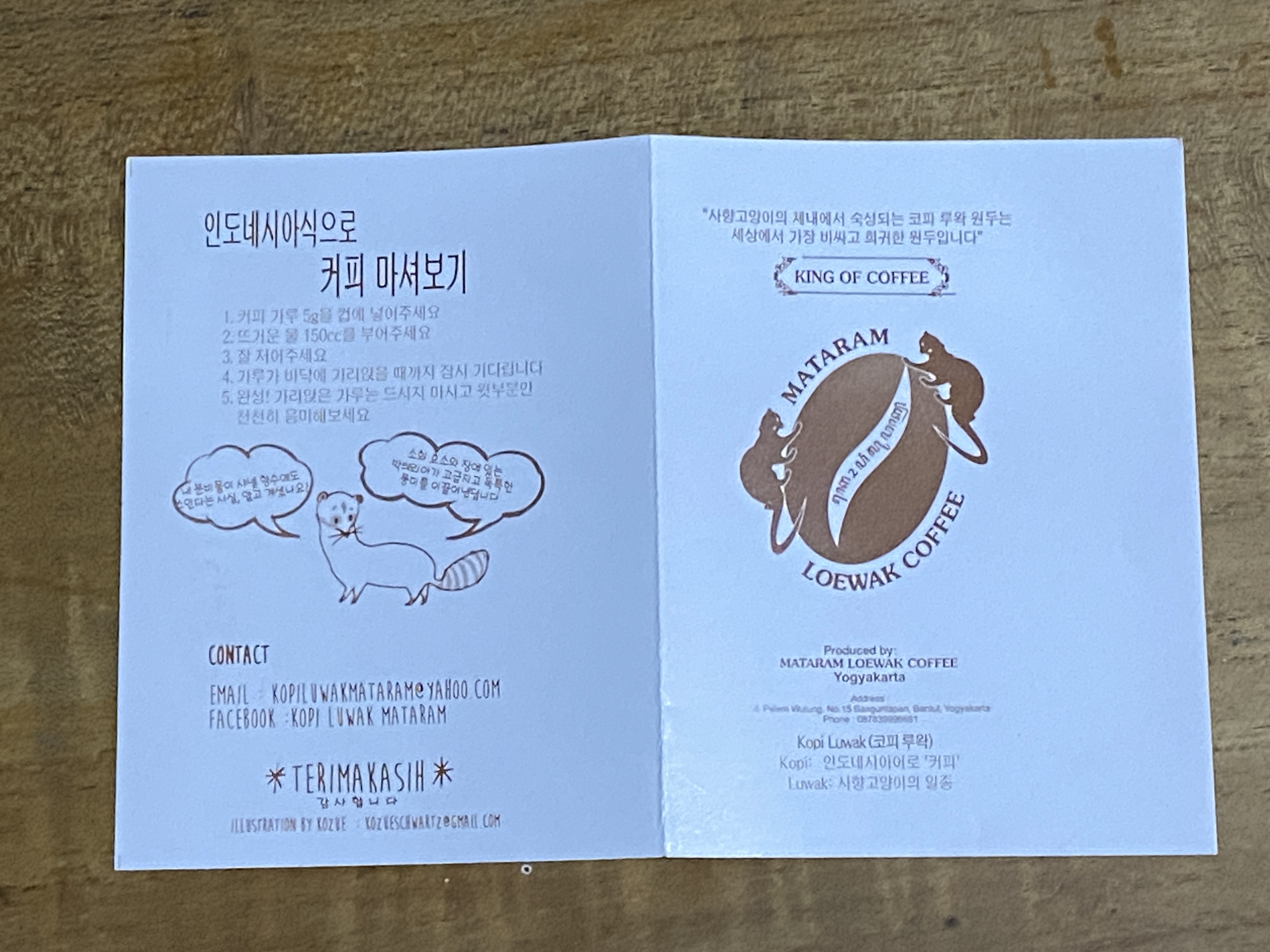 커피가루에 물을 넣어 조금씩 마셔보라고 해서 맛을 보니 생소한 맛이다. 그저그랬다. 다만 워낙 유명한 커피이니 인도네시아 방문 기념으로 50그램짜리 두 봉지를 샀다. 내 입맛에 맞다고 느껴졌다면 더 많이 샀을 텐데..... 100그램에 우리 돈 26,000원을 주고 싸게 산 셈인데 인도네시아에서 직접 수입해 온 커피를 한국에서 산다면 가격이 어느 정도? 역시 커피는 평소 자신이 즐겨먹는 것이라야 좋은 것 같다. 그 유명한 루왁 커피를 한 번 마셔 봤다는 데 의미를 부여하자.