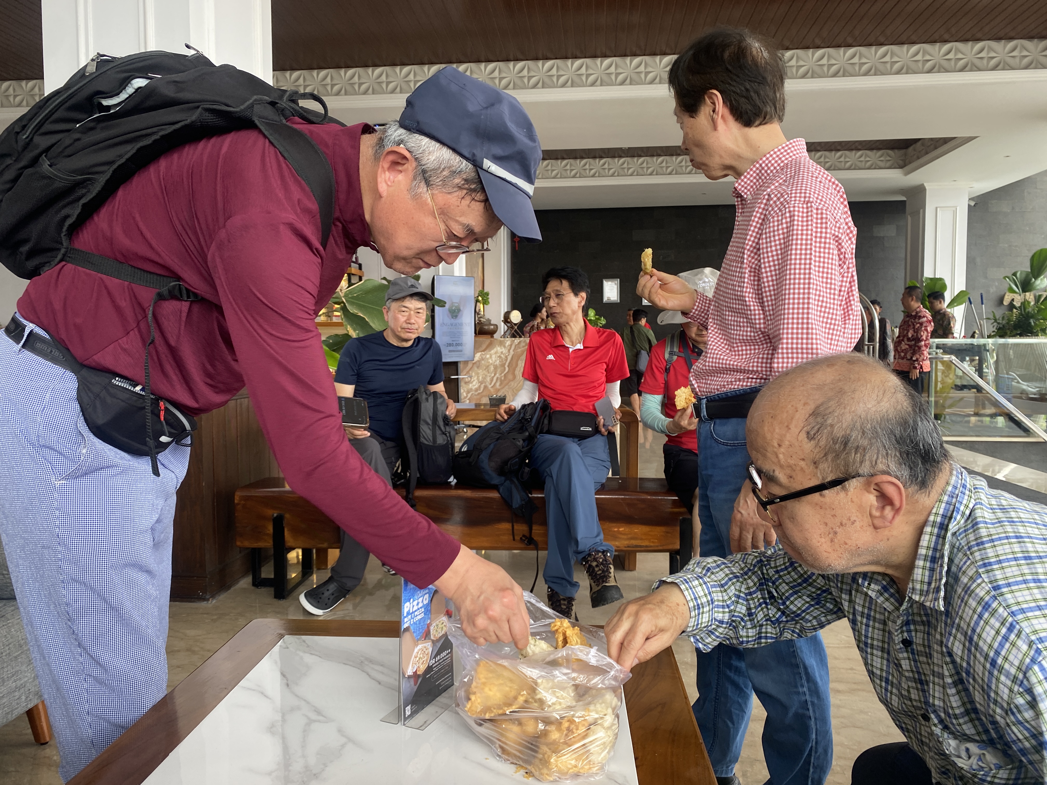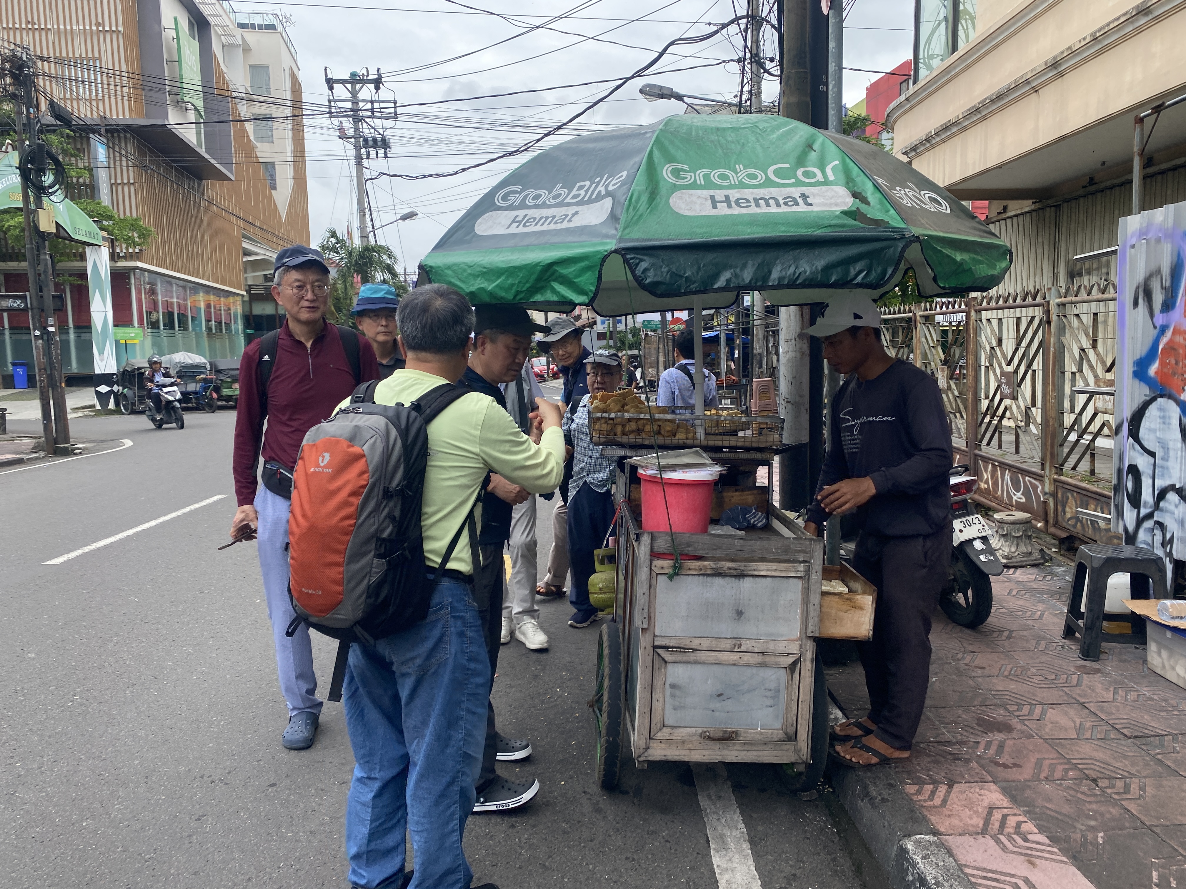 길거리의 노점상 음식을 먹어 보기로 했다. 튀김 음식인데, 고소한 맛에 취한 여러 친구들이 많이 사서 비닐봉투에 싸 가지고 와서 호텔 로비로 돌아와 나눠 먹었다. 두부를 튀긴 것도 있었는데 다소 상한 느낌이 없지 않았다.