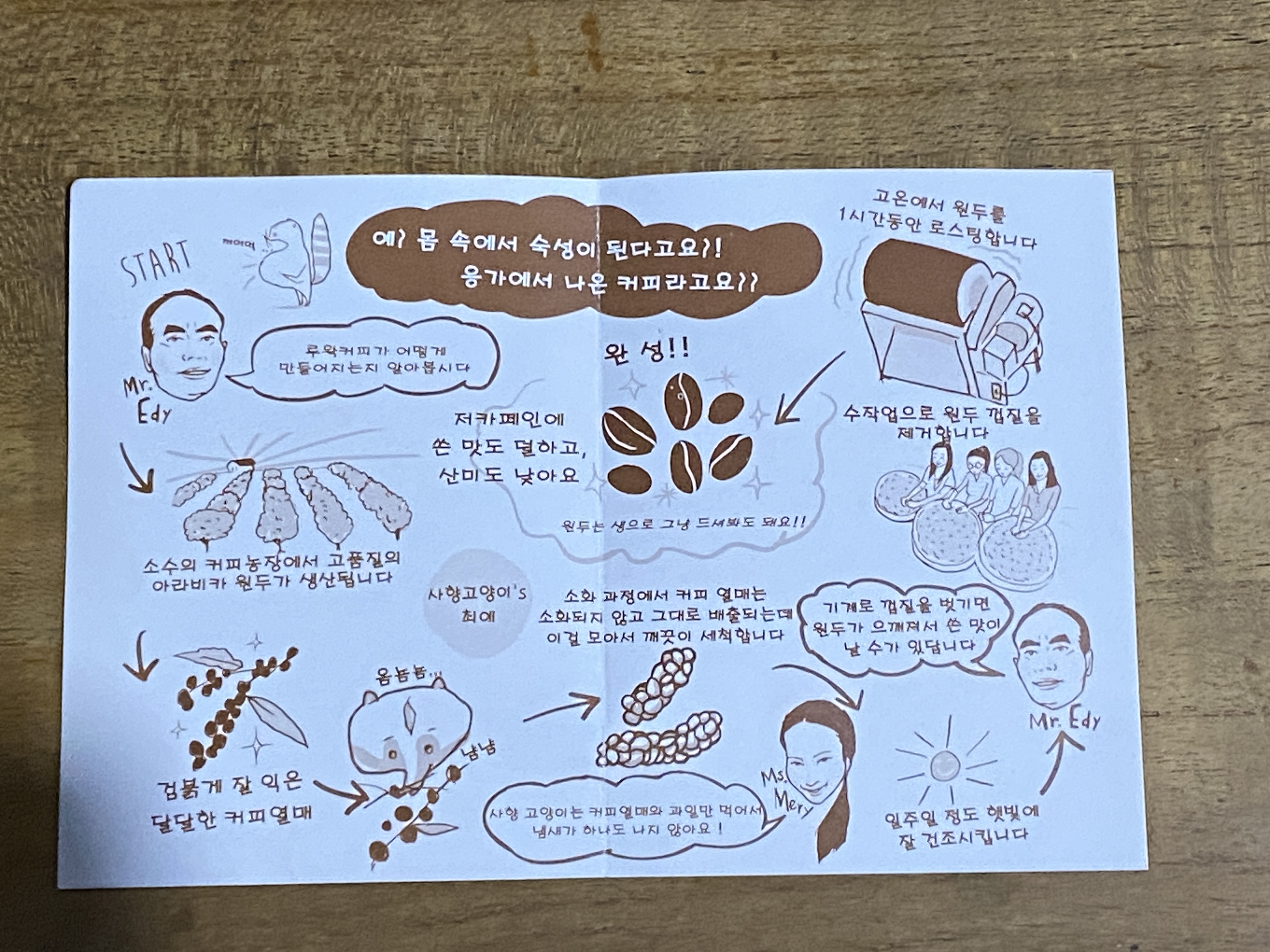 세상에서 가장 비싼 커피, 바로 사향고양이 대변에서 추출한 루왁커피다. 루왁은 인도네시아어로 사향고양이를 뜻한다. 밤새 시각과 후각이 예민한 사향고양이가 잘 익은 커피 열매만 골라 먹고 배설하면 사람들은 해가 뜨기 전 대변을 모두 수거해 원두만 모은다. 사향고양이가 먹은 커피 열매의 과육은 소화되고 씨만 배설되는데, 소화 과정에서 사향고양이 몸속에만 있는 효소를 통해 발효된 상태로 나온 것을 모은 것이다. 이 때 특유의 맛과 향이 생기는 것이다. 커피 원두가 대변이 만들어지는 과정에서 함께 삭혀져 최고급 커피, 루왁커피로 변신하는 셈이다.
