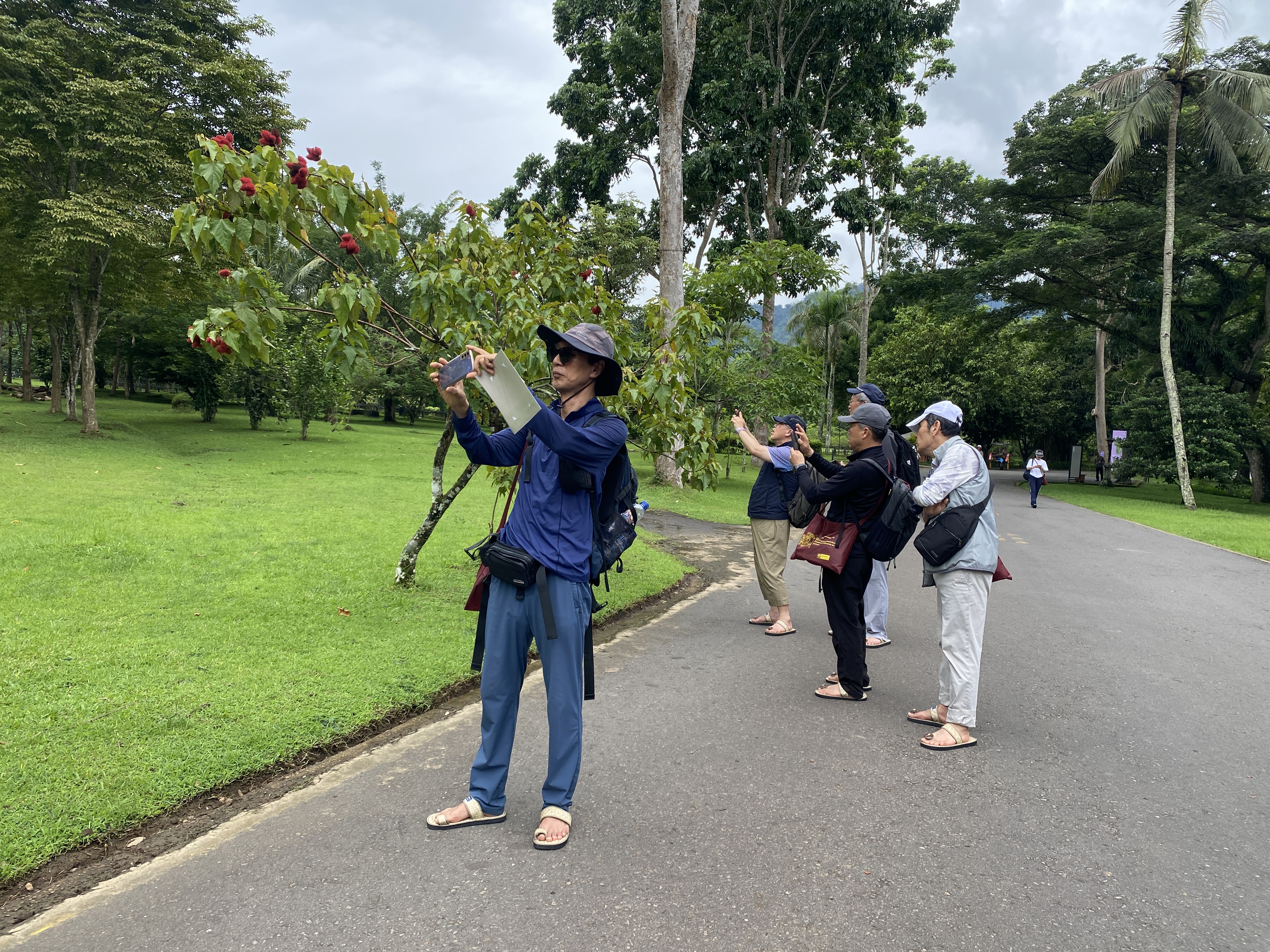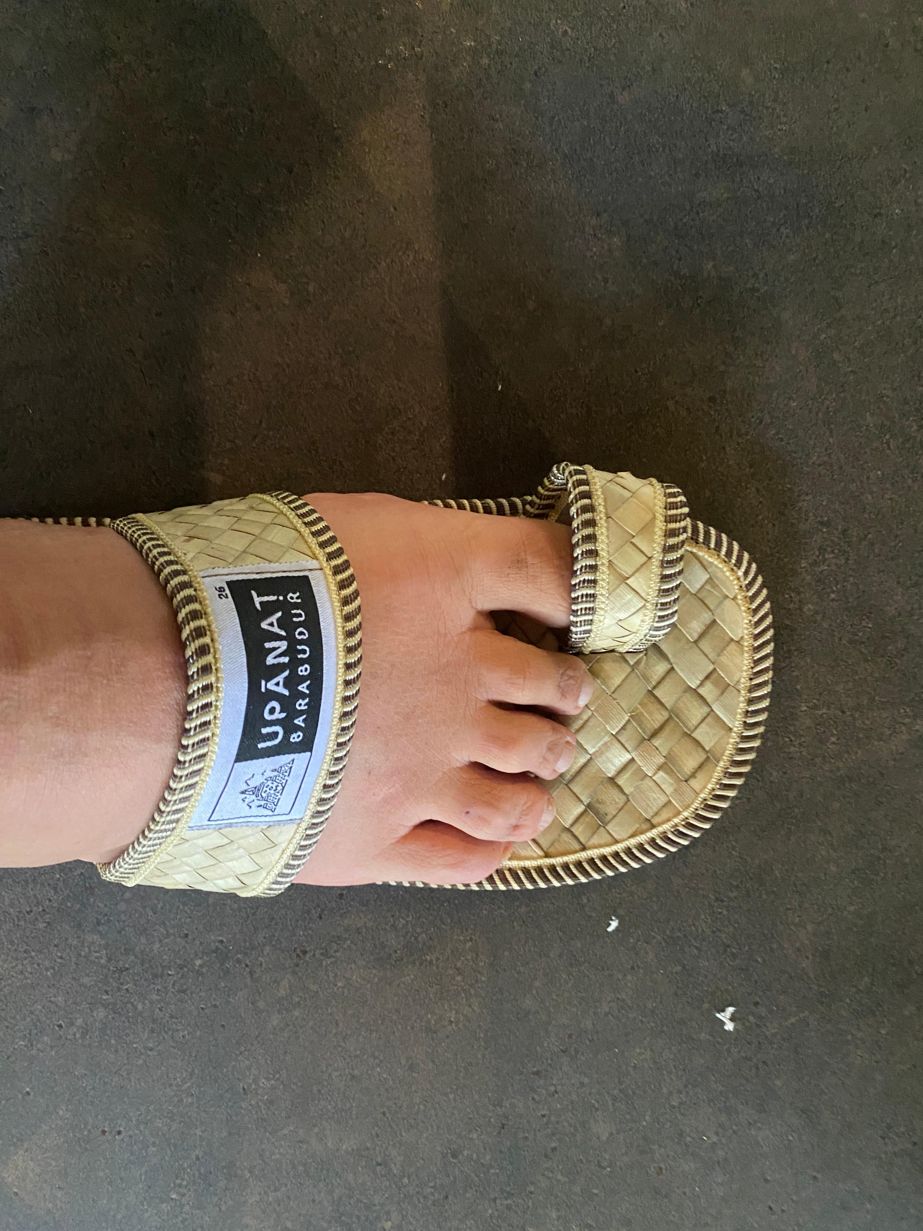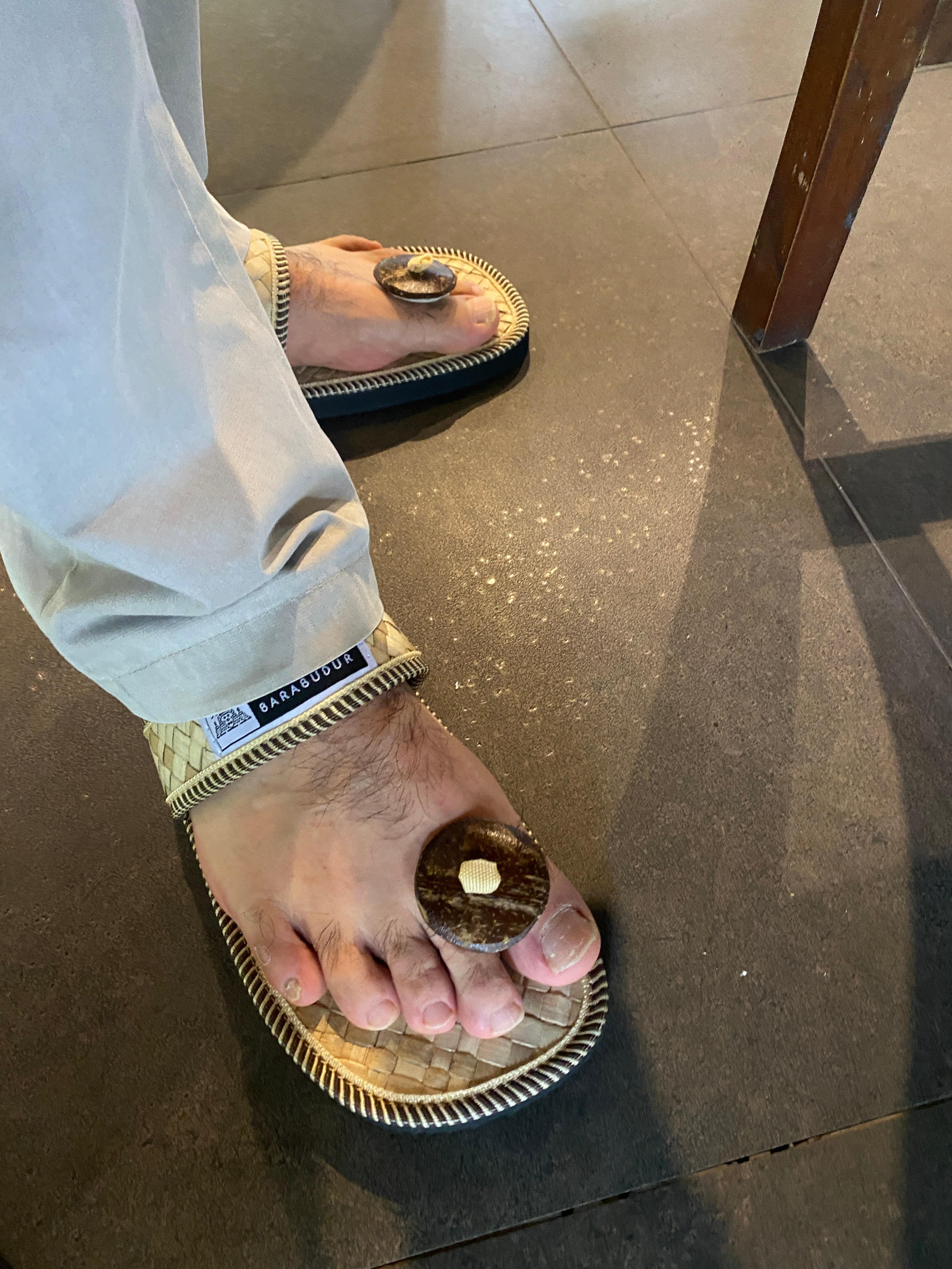 이 불교 사원 경내에서는 개인 신발은 신주머니에 넣고 사원 당국에서 제공하는 슬리퍼를 신도록 되어 있다. 입장료에 포함되어 있는 것이니 사용 후 반납하지 않고 개인이 소장하면 된다. 워낙 가벼워서 비행기 탈 때 실내화로 신으면 좋겠다는 반응이다. 그러나 나에게는 맞지 않았다. 발등이 워낙 높아서 웬만한 크기가 아니면 신기 어렵다. 사진처럼 엄지발가락이 들어가지 않는다. 제일 큰 신으로 바꿔야 되겠다 싶어 교환해 줄 것을 요구하니 바꿔 준다. 키와 발이 큰 순박이도 제일 큰 신발을 요구해서 신고 있었다.