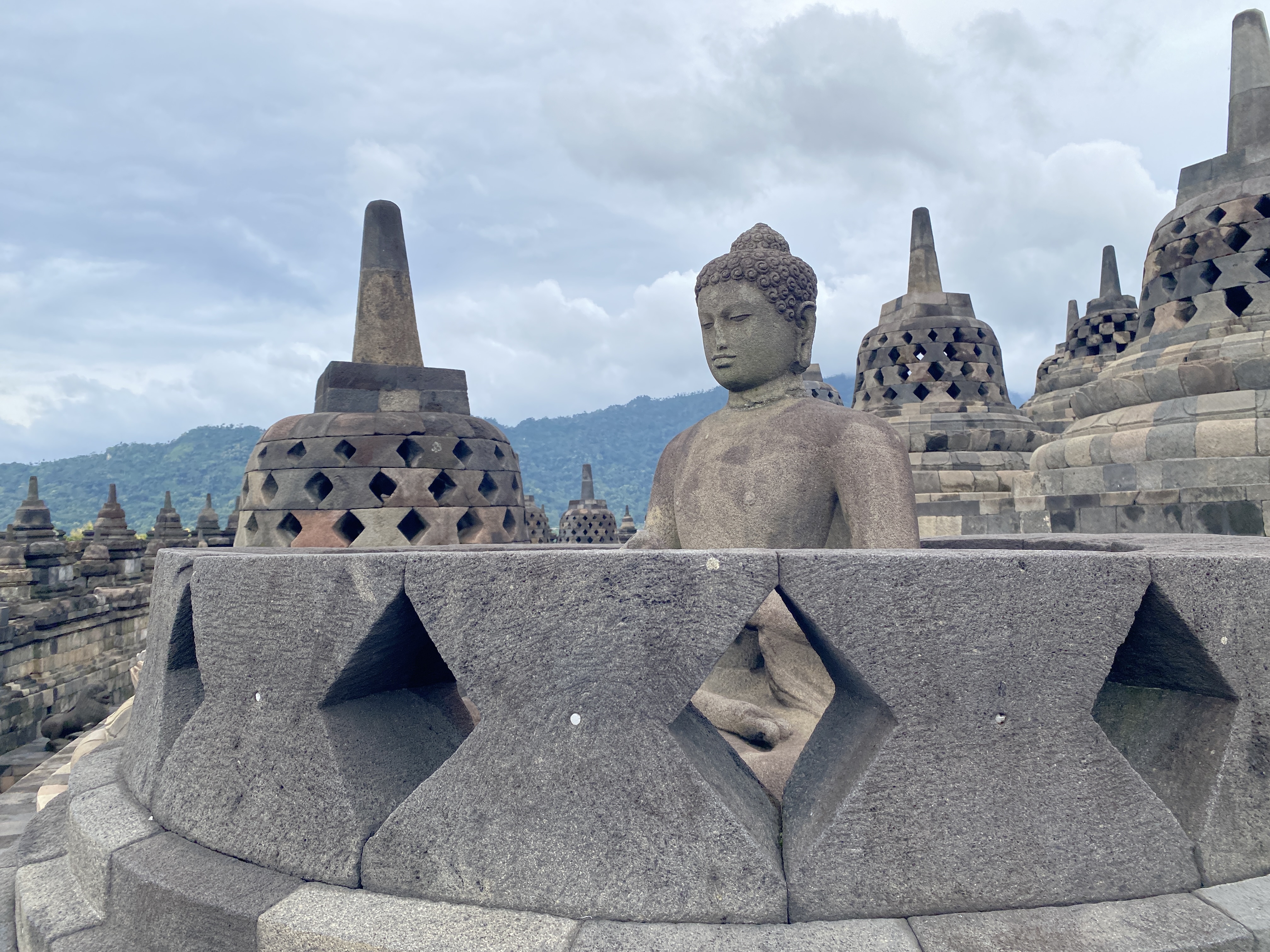 정상에 있는 종탑 모양의 스투파(Stupa) 73기는 보로부두르의 또 다른 볼거리인데 가장 바깥쪽에 32기, 그 안쪽으로 24기, 다시 그 안쪽에 16기가 있다. 그리고 사원의 중심이자, 가장 높은 곳에 다른 스투파들보다 훨씬 더 큰 스투파 1기가 있다. 이 스투파는 안이 텅 비어있는데 이것은 대승불교의 공(空)사상을 나타낸 것이다. 따라서 보로부두르가 상좌부 불교 유적이 아님을 알 수 있다. 보통 자바섬에 도달한 불교가 상좌부 불교라 상좌부 불교 사원이라 생각하기 쉽지만 사일렌드라 왕국이 번성했던 10세기 자바 섬은 상좌부 불교가 아니라 민간 토속신앙과 힌두교 문화가 섞인 대승불교권이었다.(인터넷 자료 인용함)