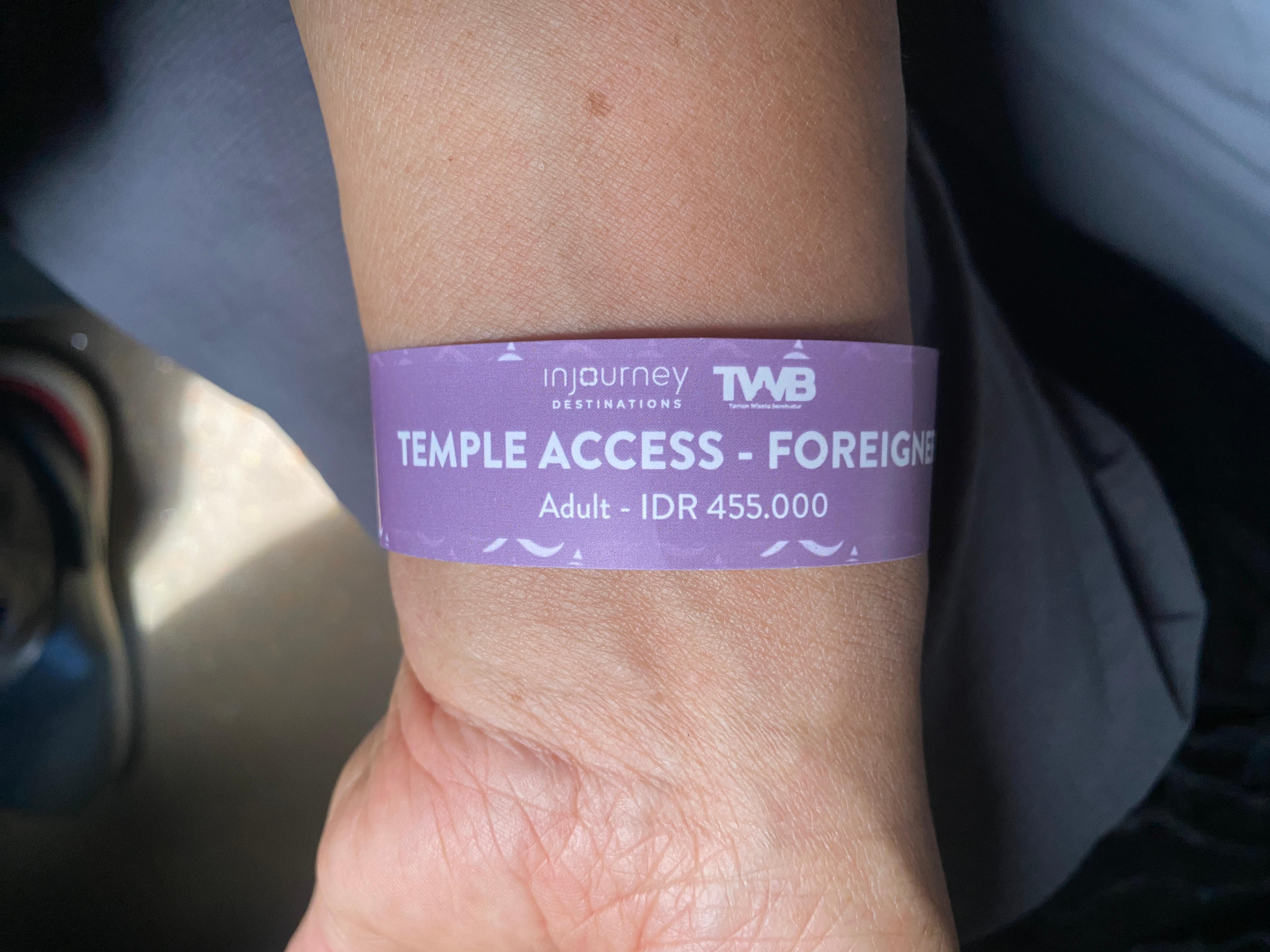 사원을 출입할 때 손목에 차는 것인데, 외국인들에게 받는 요금은 현지인들보다 5배 정도 더 비싸다. 경로우대도 없다. 중국 여행할 때에는 65세 이상이 경로우대 대상이어서 경비를 좀 절약할 수 있었는데 여기는 아니다. 455,000루피아의 입장료니까 우리 원화로는 얼마일까? 인도네시아 100루피아는 한국돈 8.75원이니까 입장료가 약 4만원인 것이다.