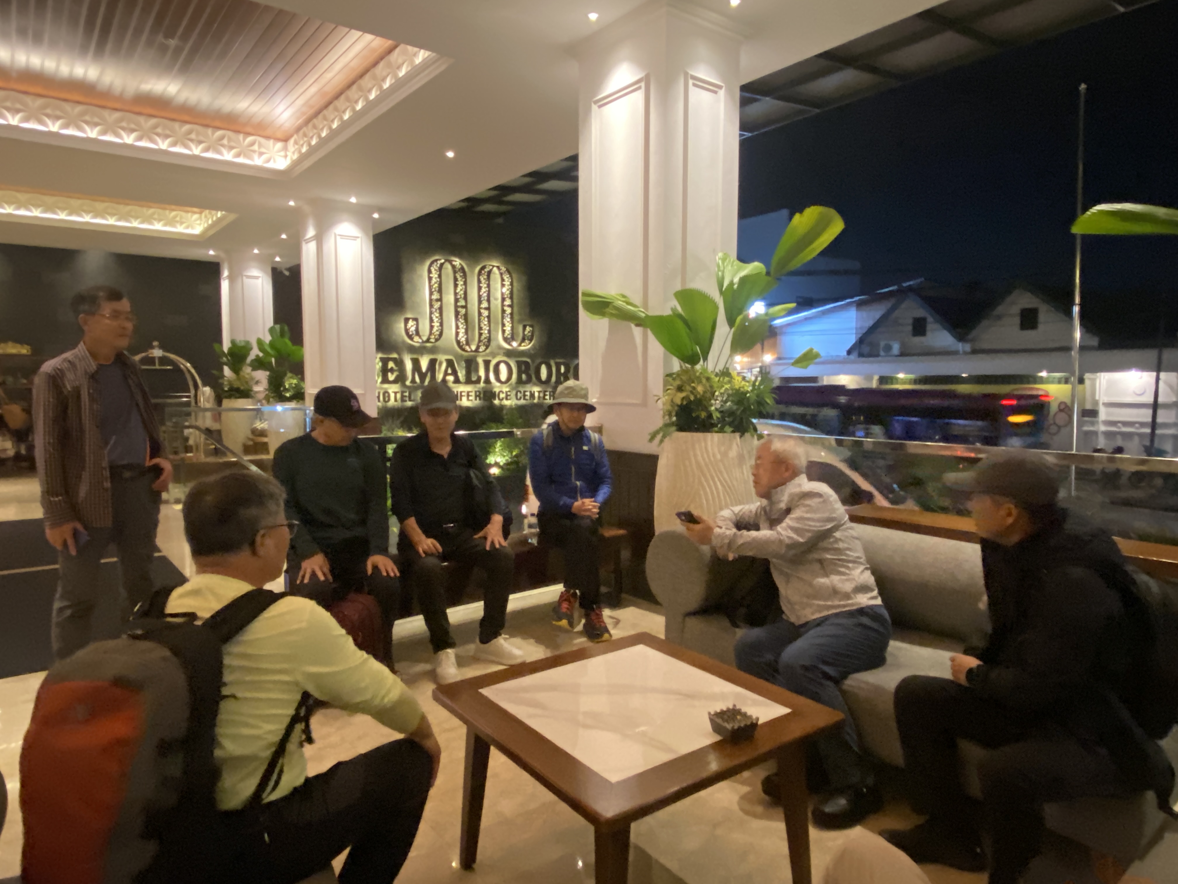 다시 호텔 로비로 왔다. 메라피 화산을 찾아갈 준비를 끝내고 안내 차량이 도착하기만을 기다리는 시간이다. 태천이가 오늘 저녁의 일정과 화산에 대해서 설명하는 장면이다.